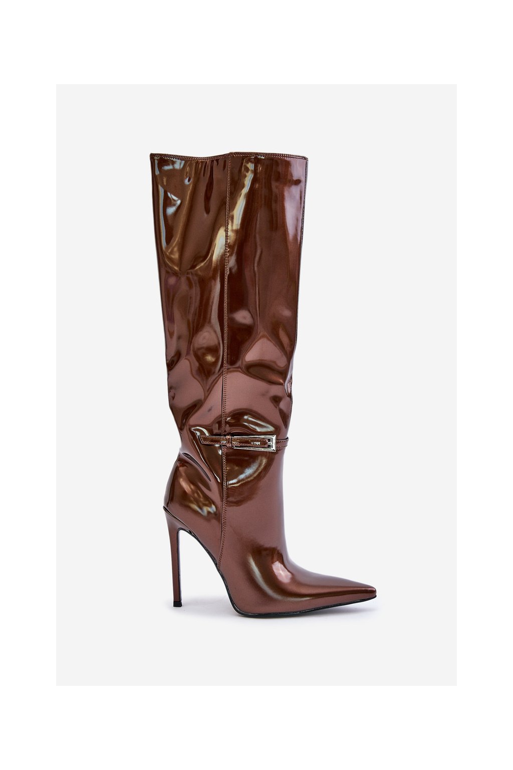 Lakovane zateplené kozačky na jehlovém podpatku s přezkou hnědé Tameliae (Veľkosť 38)