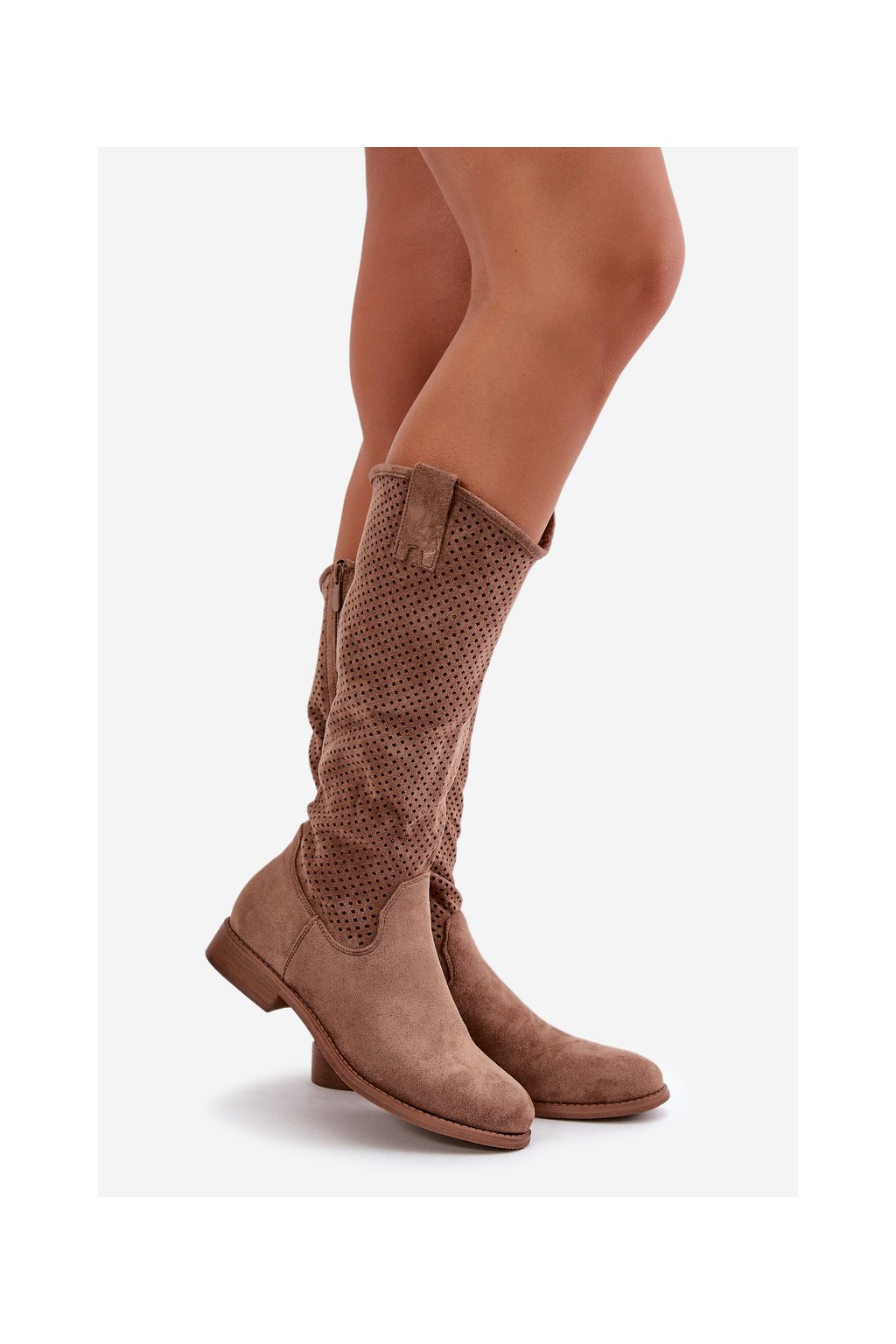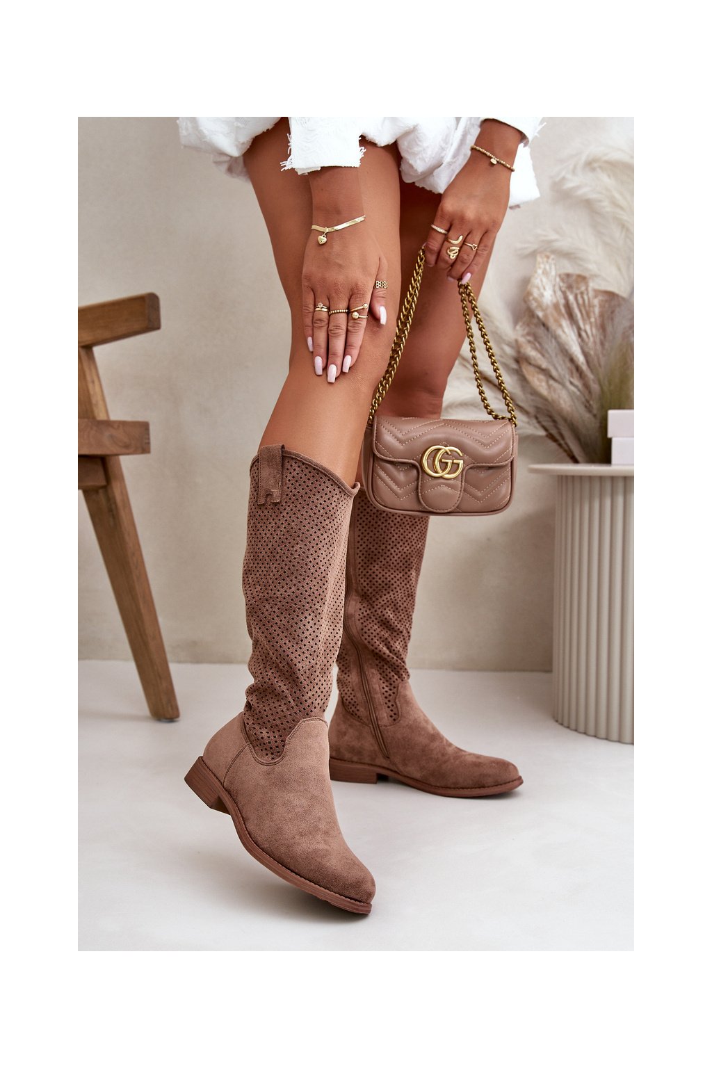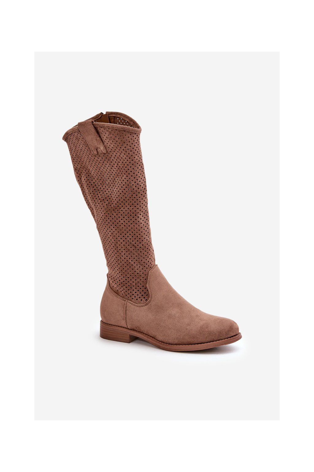 Hnedé dámske semišové kozačky s vyšívaným vzorom s rovnou podrážkou HY42-139 COFFEE