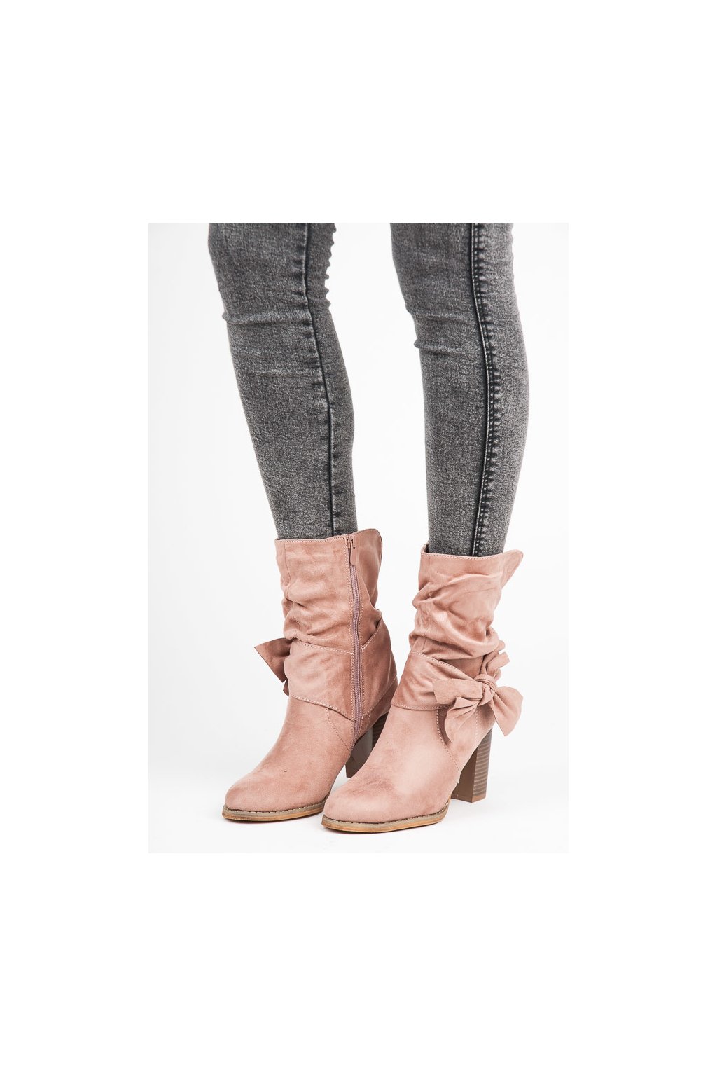 Ružové dámske semišové členkové čižmy na stĺpikovej päte s mašľou, kód produktu M215P
