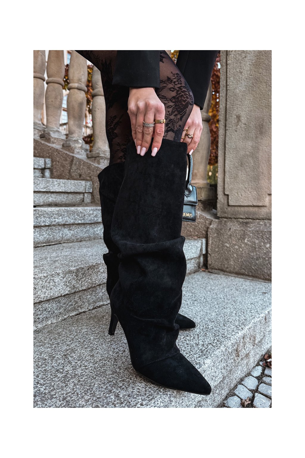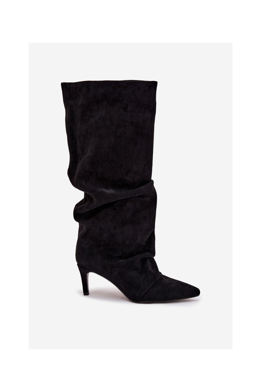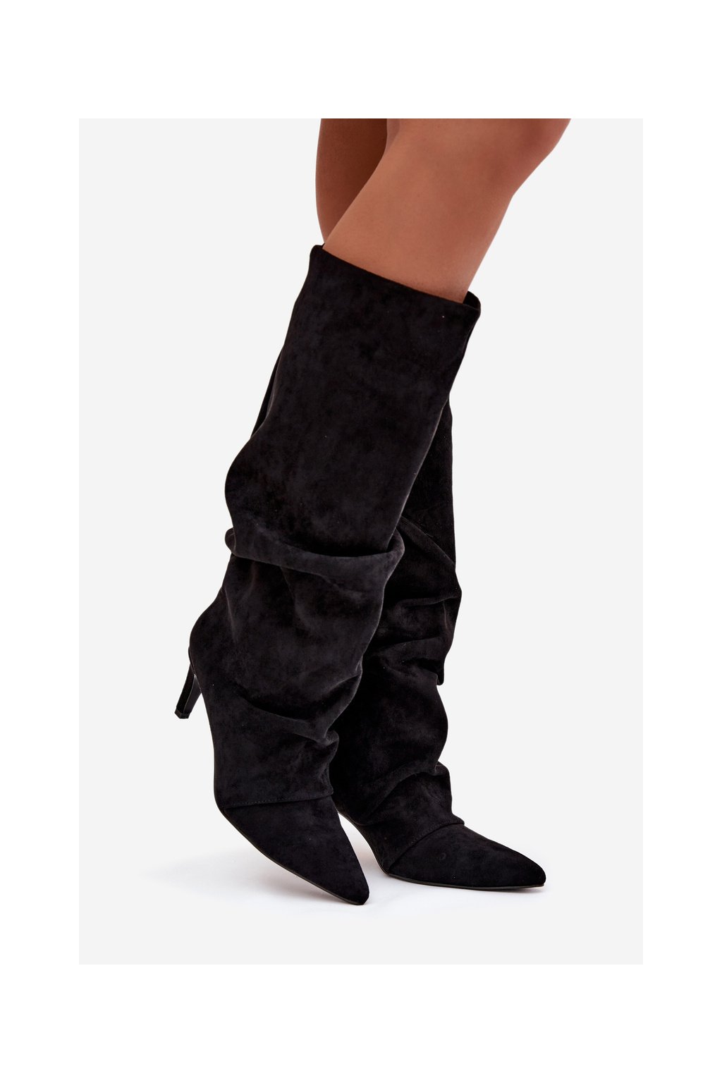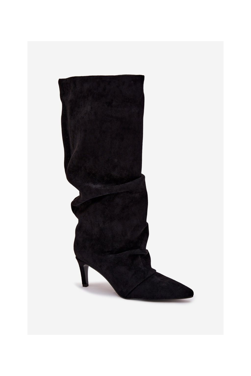 Zmačkané kozačky na jehlovém podpatku z ekzem z velúruu vyhřívané černé Mavella