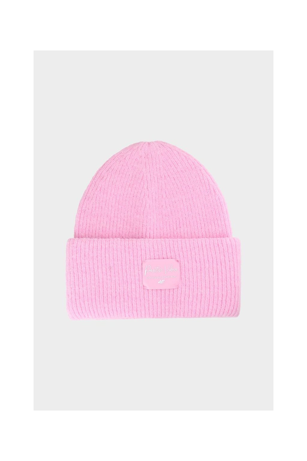 Ružová dievčenská zimná čiapka 4F CAPF415-54S s ohrnutou manžetou a nášivkou