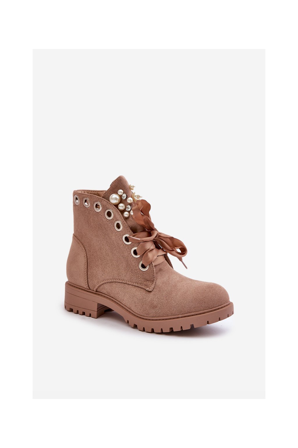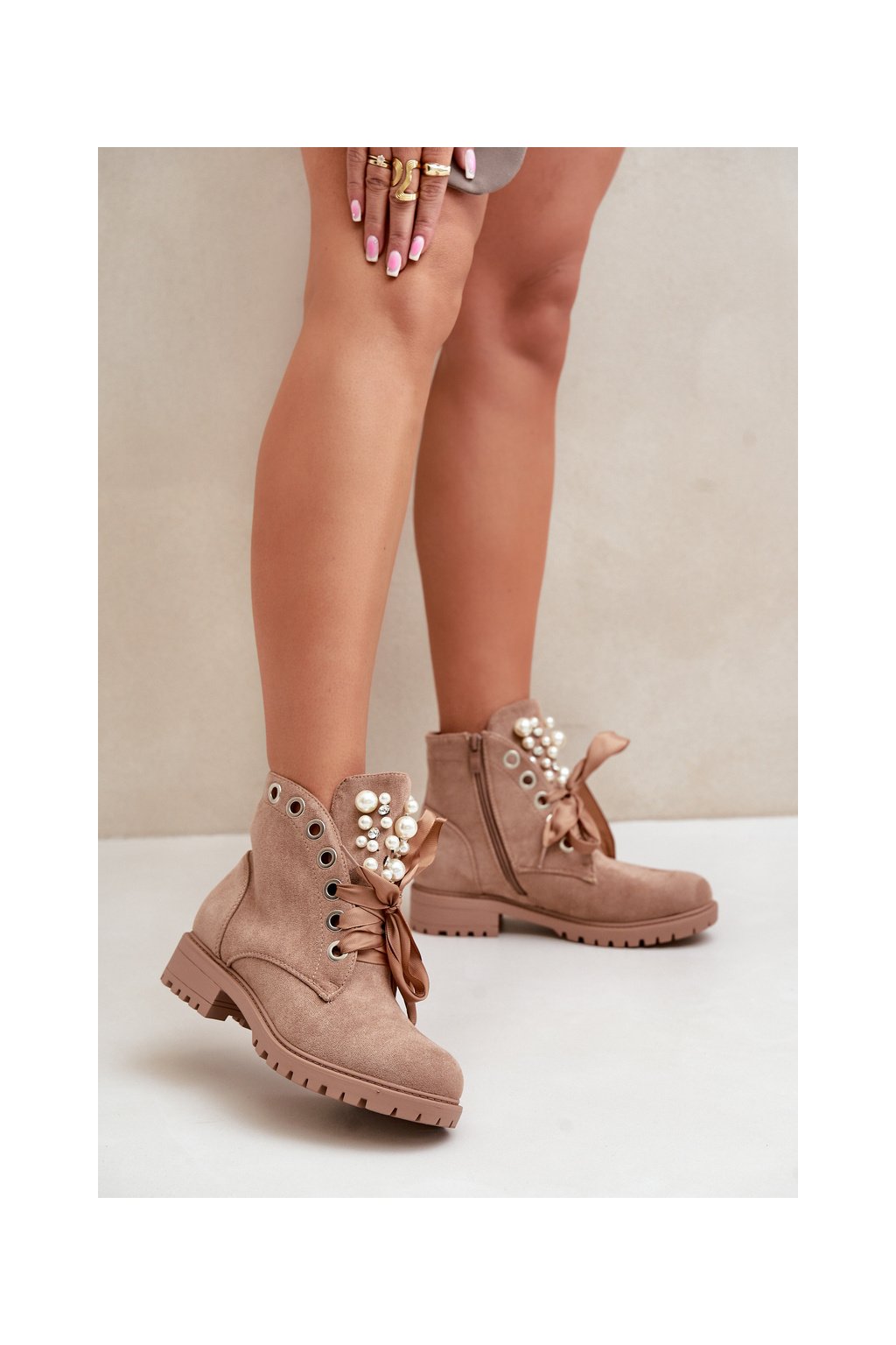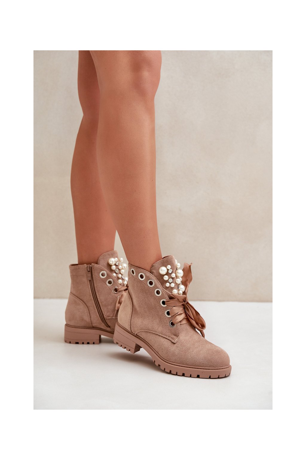 Béžové dámske členkové topánky z eko semišu na rovnej podrážke, kód produktu 8371 KHAKI