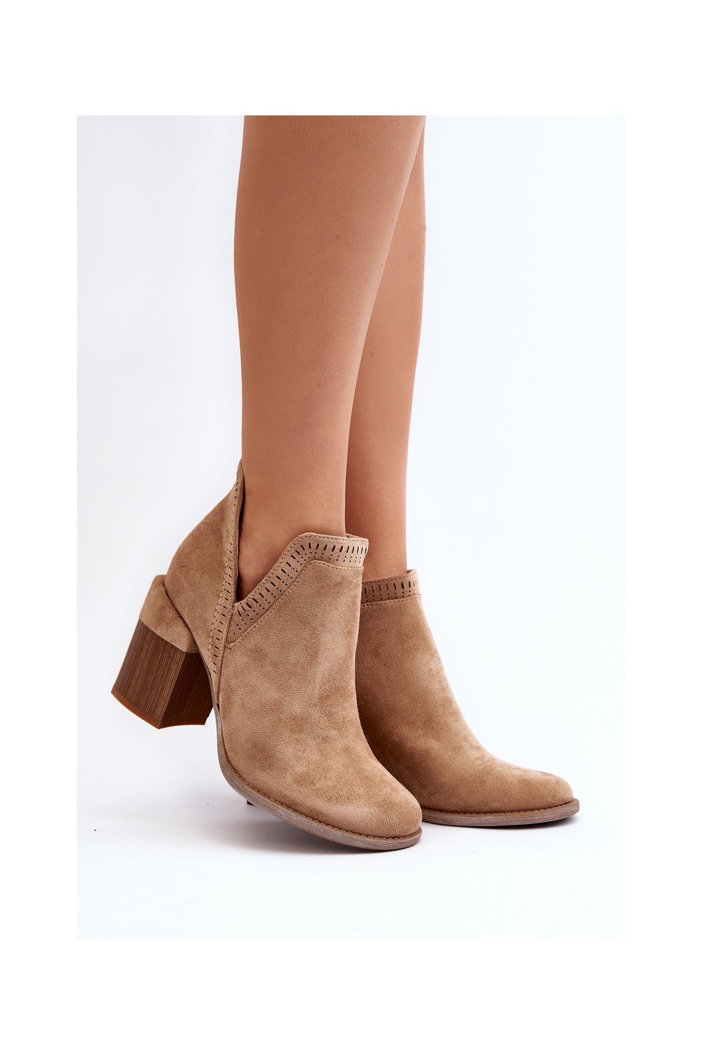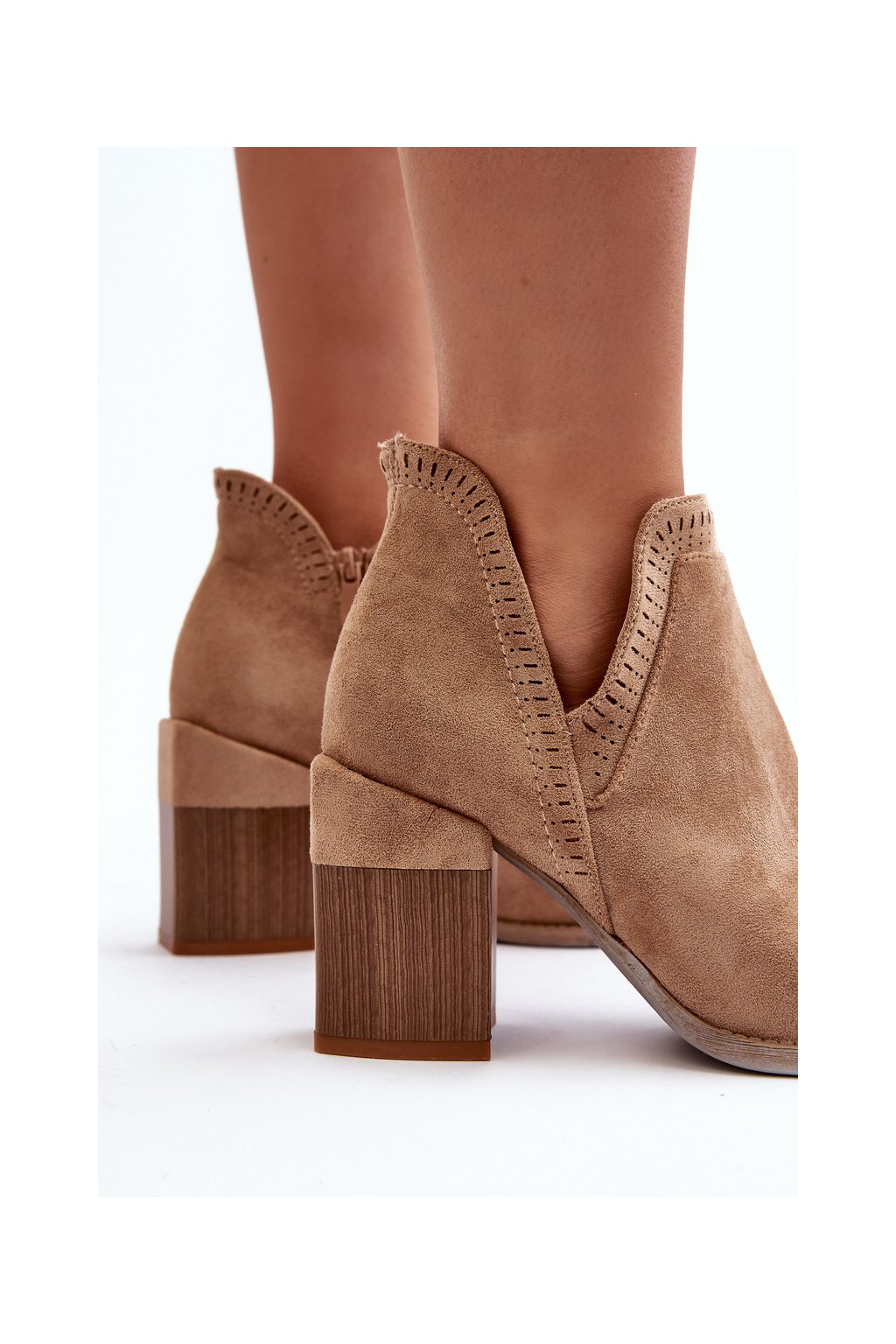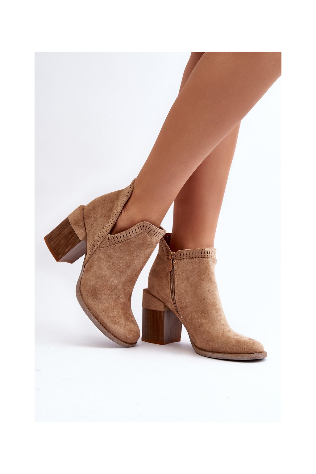 Béžové dámske členkové topánky z eko semišu na stĺpovom podpätku, kód produktu A5729-63 KHAKI