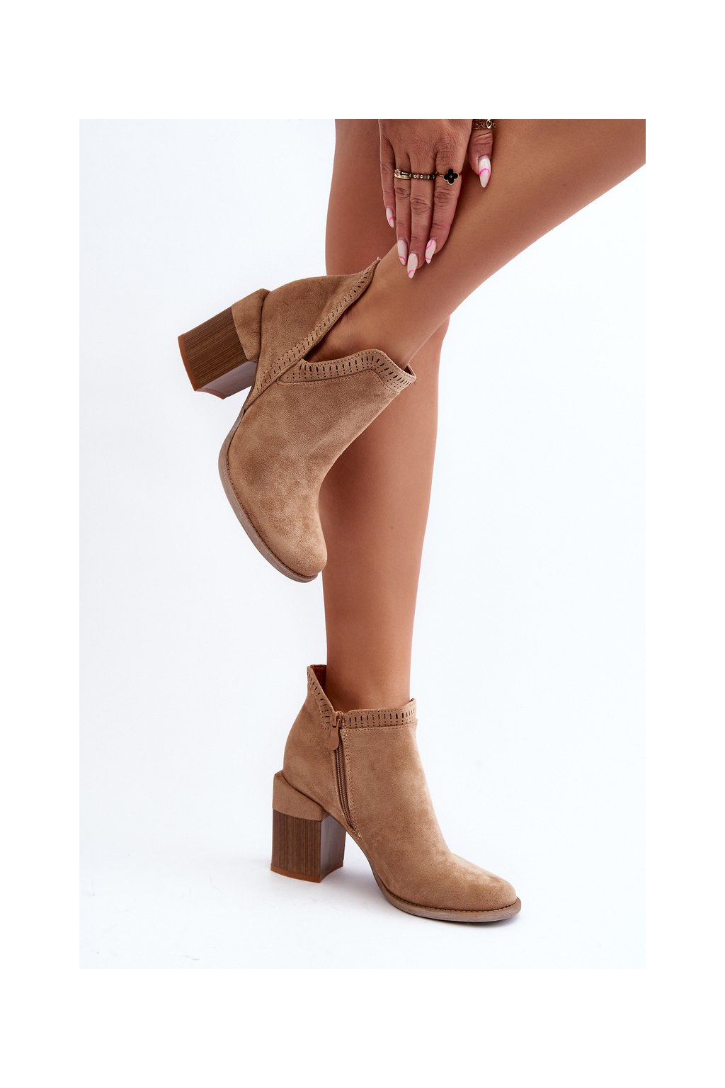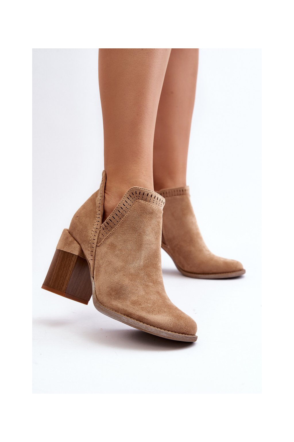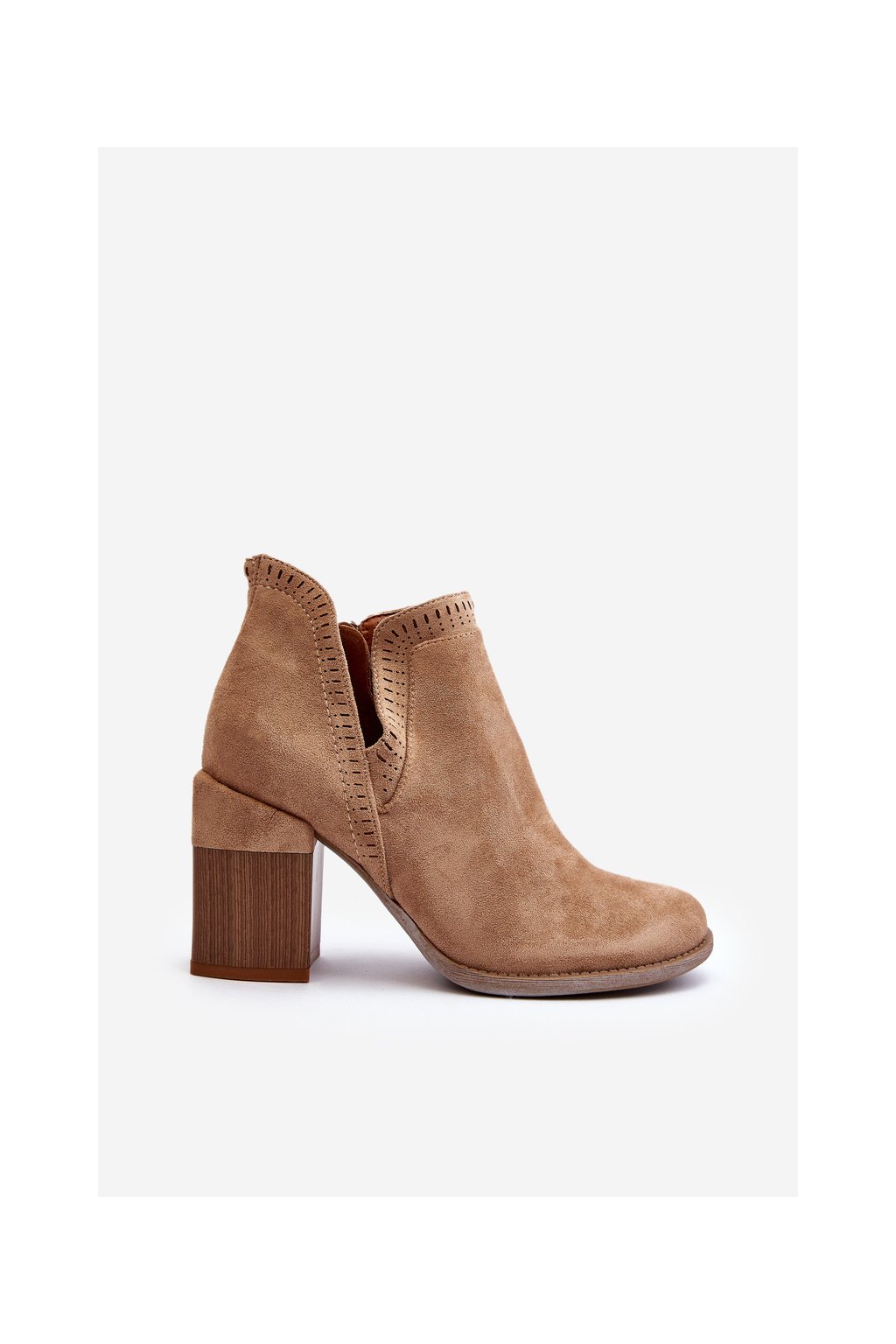 Béžové dámske členkové topánky z eko semišu na stĺpovom podpätku, kód produktu A5729-63 KHAKI
