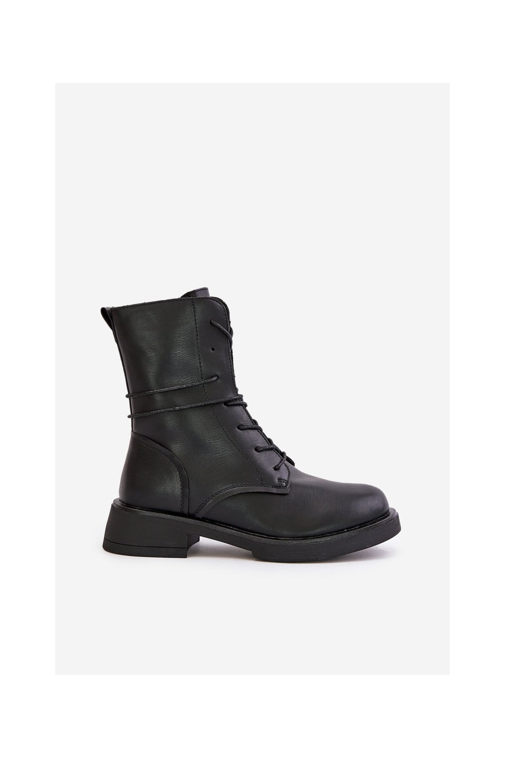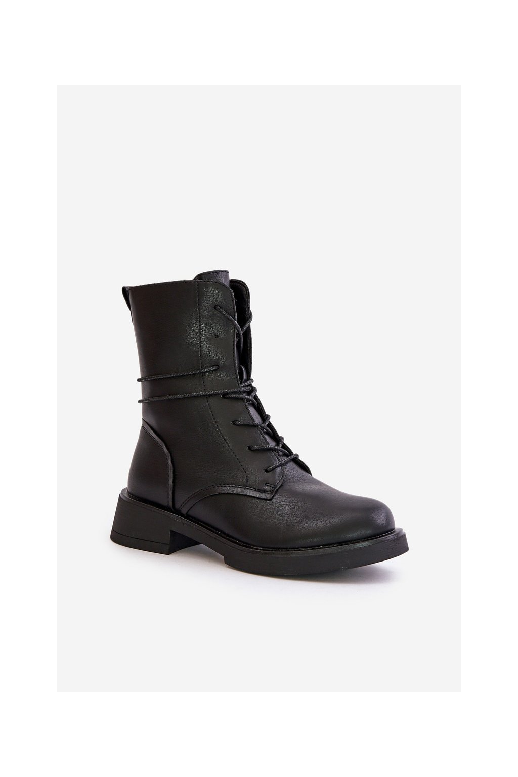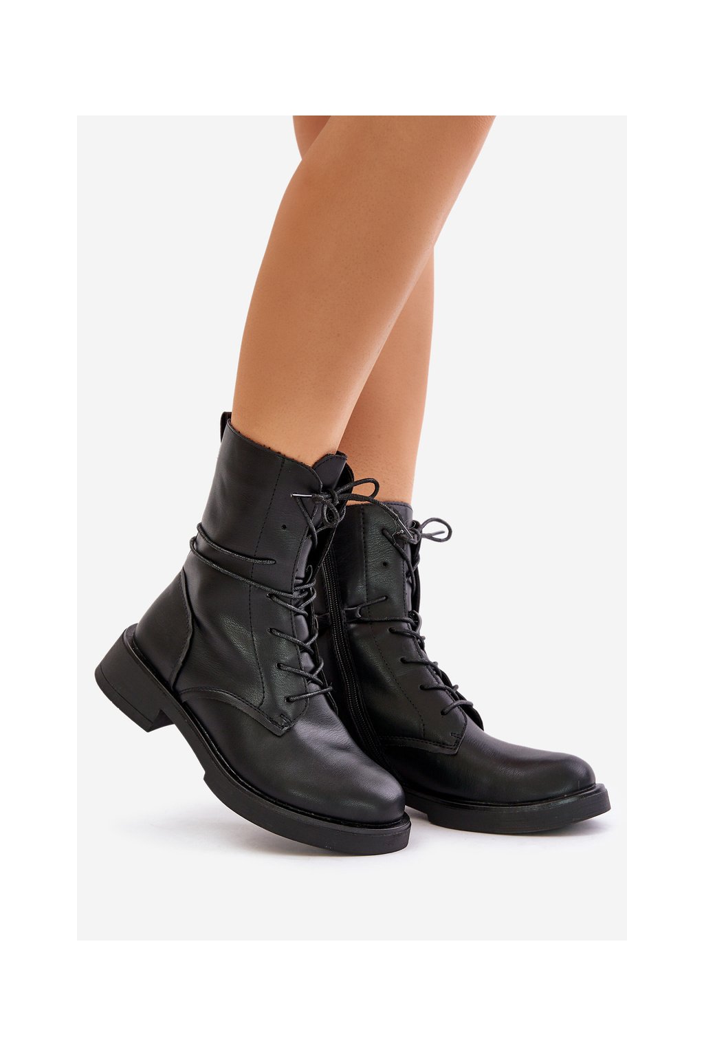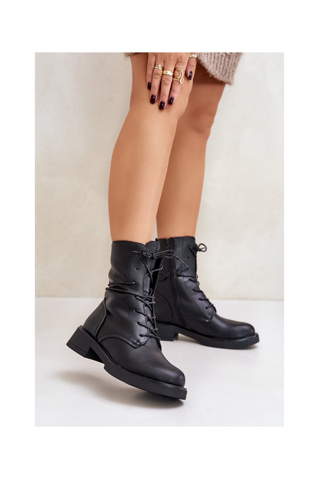 Čierne dámske členkové topánky z eko kože na rovnej podrážke s zipsom, kód produktu 24BT35-7863 BLACK