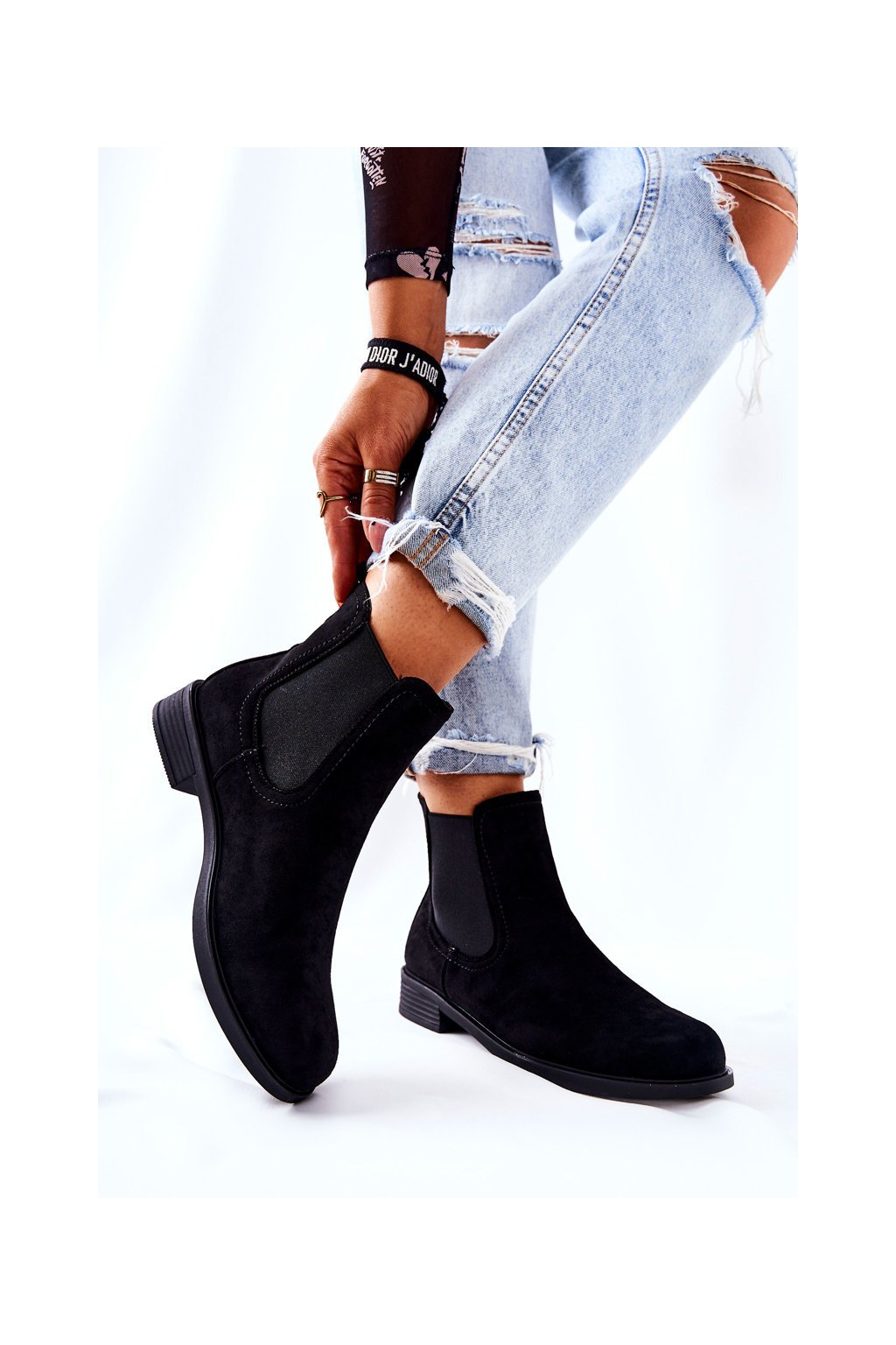 Čierne dámske členkové topánky z eko semišu na rovnej podrážke s vnútorným filcom MR-9 BLK