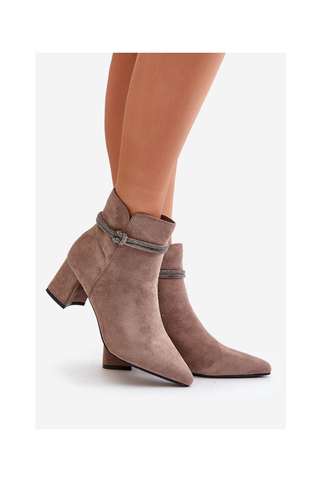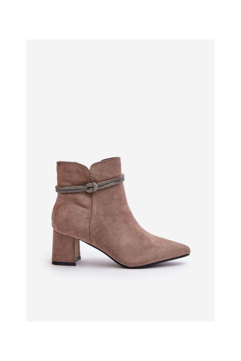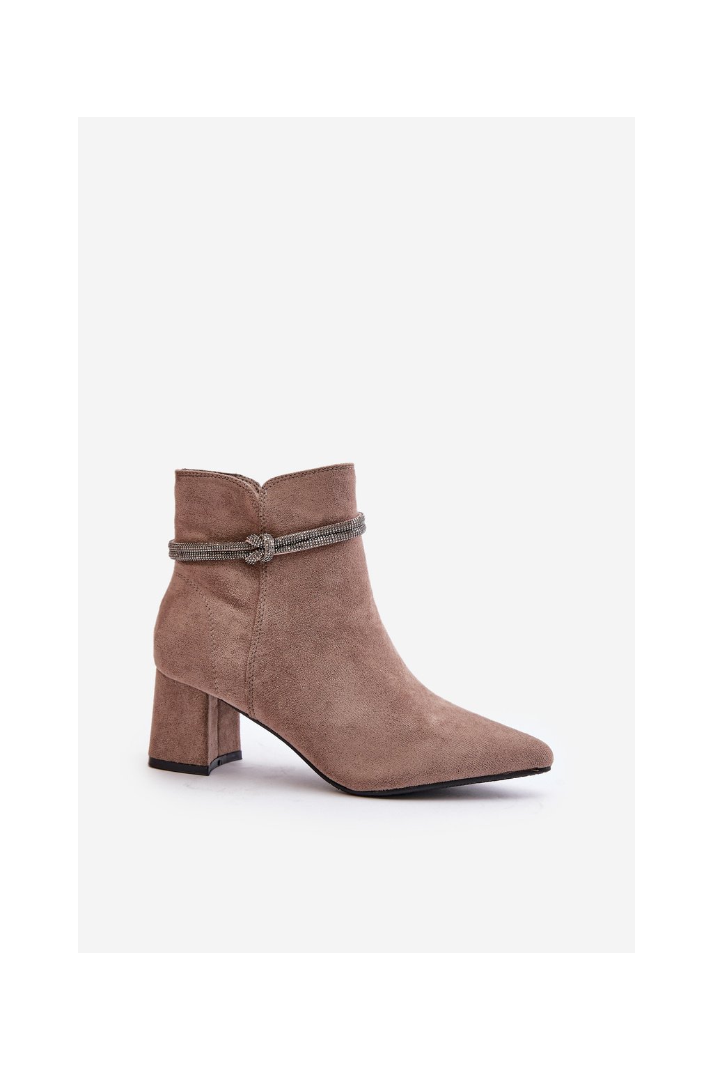 Hnedé dámske členkové topánky z eko semišu na stĺpovom podpätku s ozdobným pásikom, kód produktu 3737-19 KHAKI
