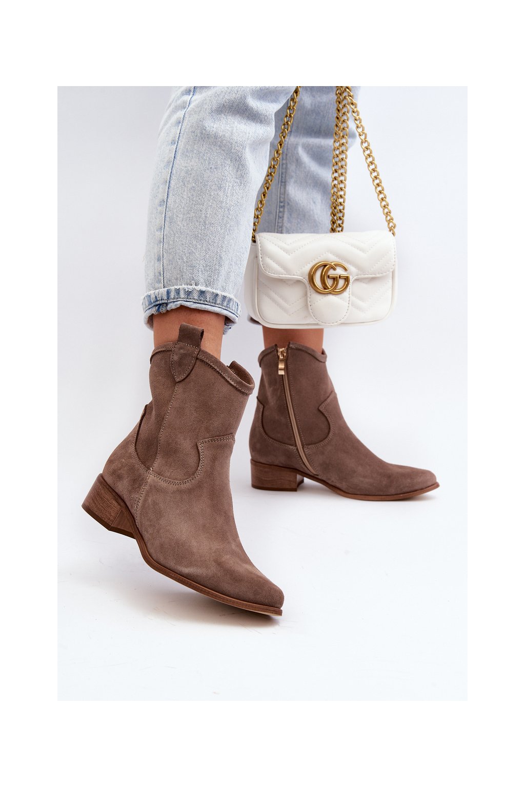Zazoo 3329 Semišové kotníkové kovbojky na nízkém podpatku tmavě hnědé