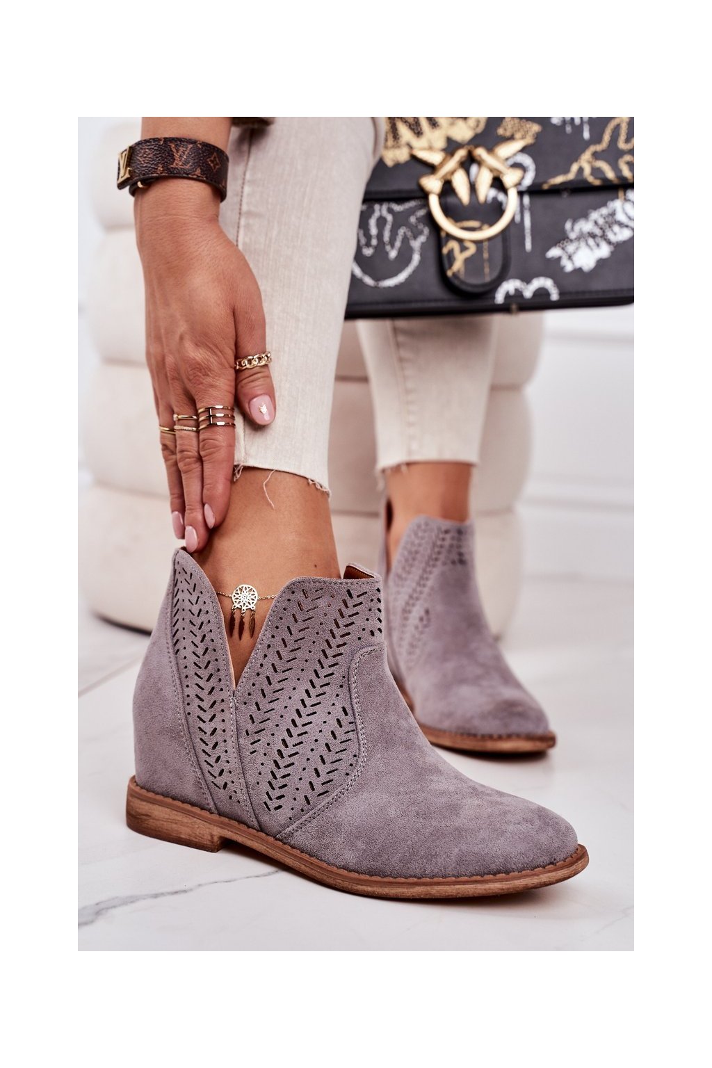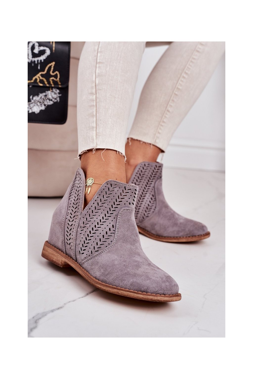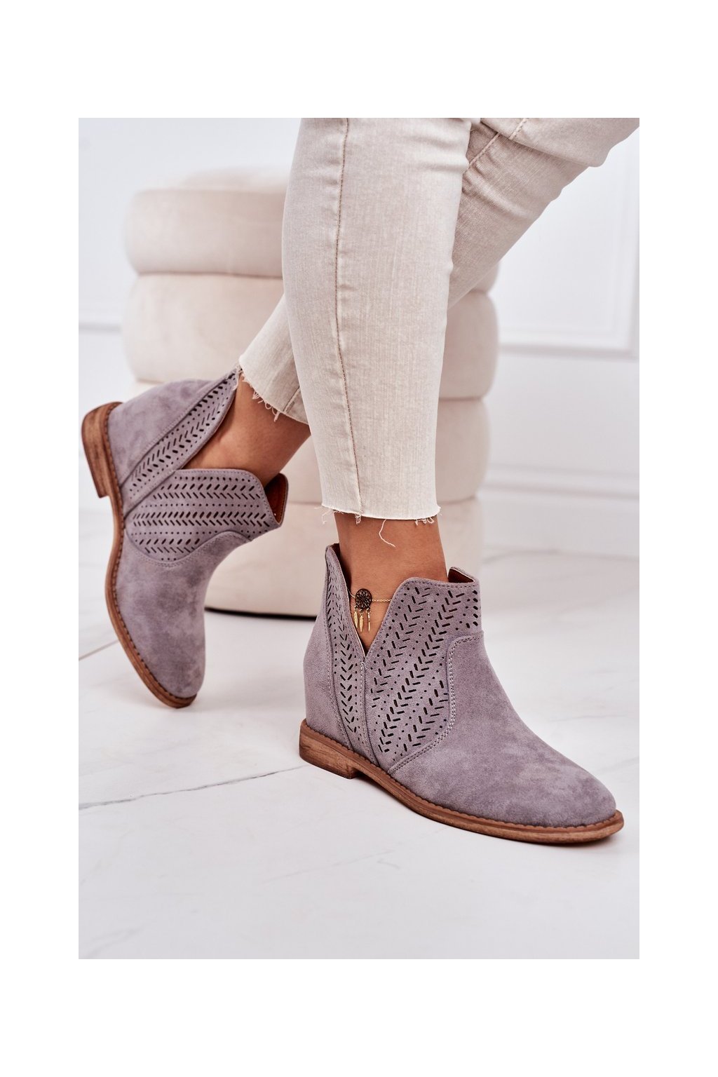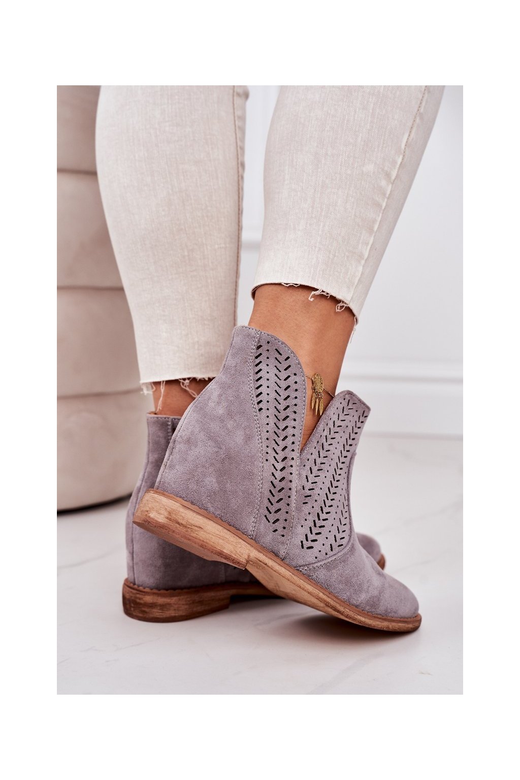 Sivé dámske členkové topánky na klinovom podpätku z eko semišu, kód produktu A3755-26 GREY