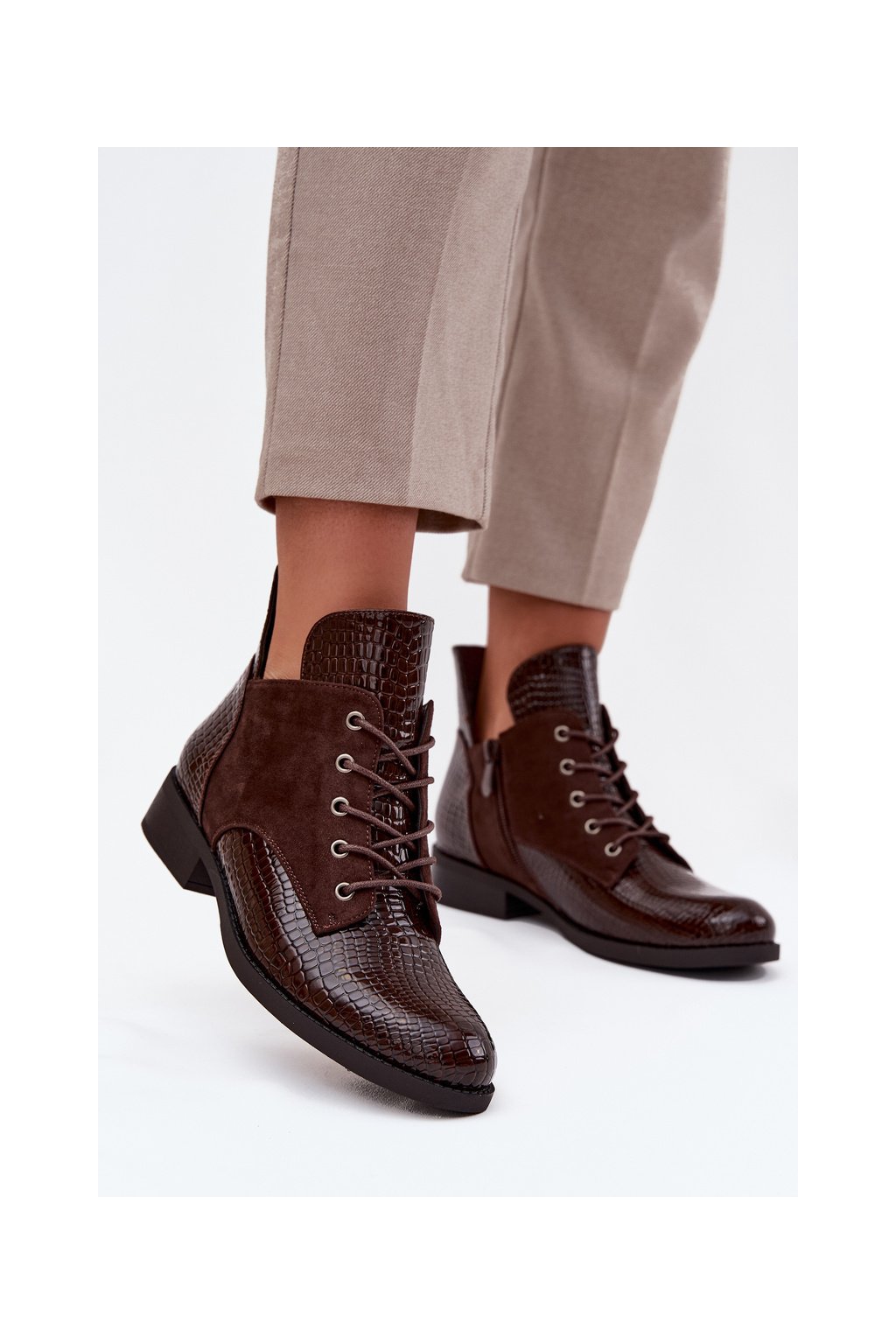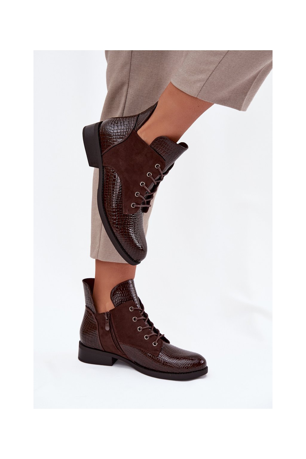 Lakované dámské kotníkové boty s ozdobným vypalováním zateplené Vinceza 16477 hnědé