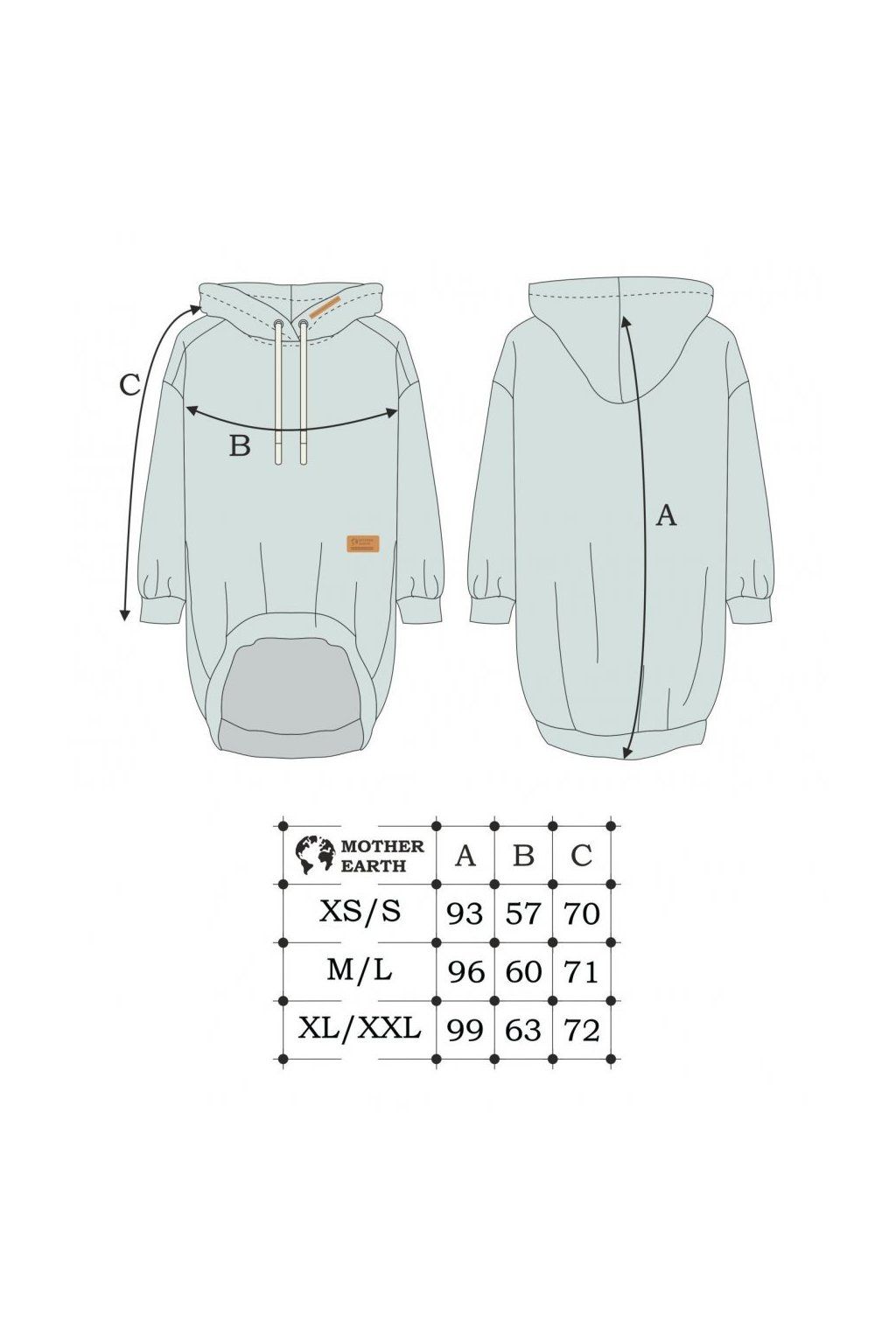 Mikina má prodlouženou zadní délku, kapuci je možné stáhnout na tkanici.