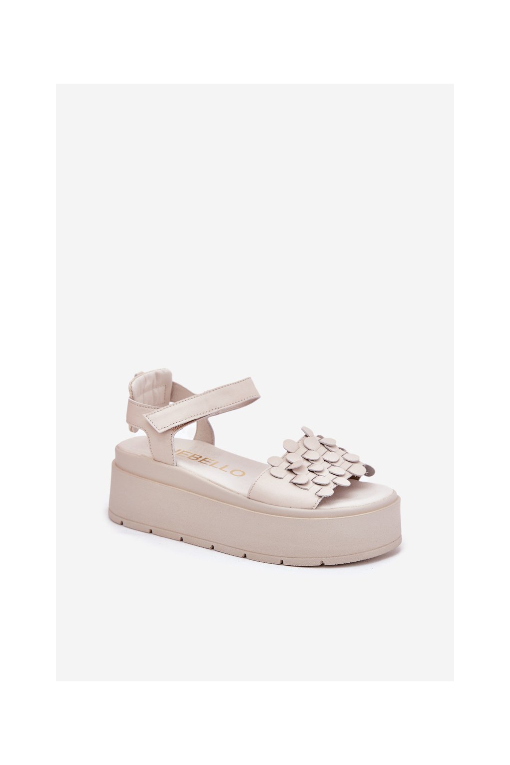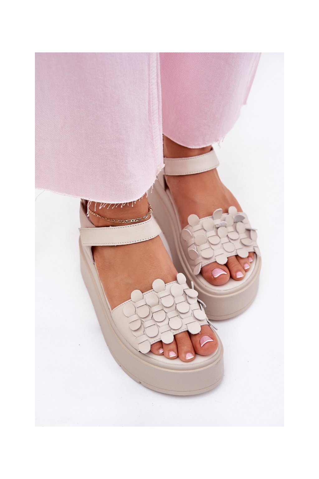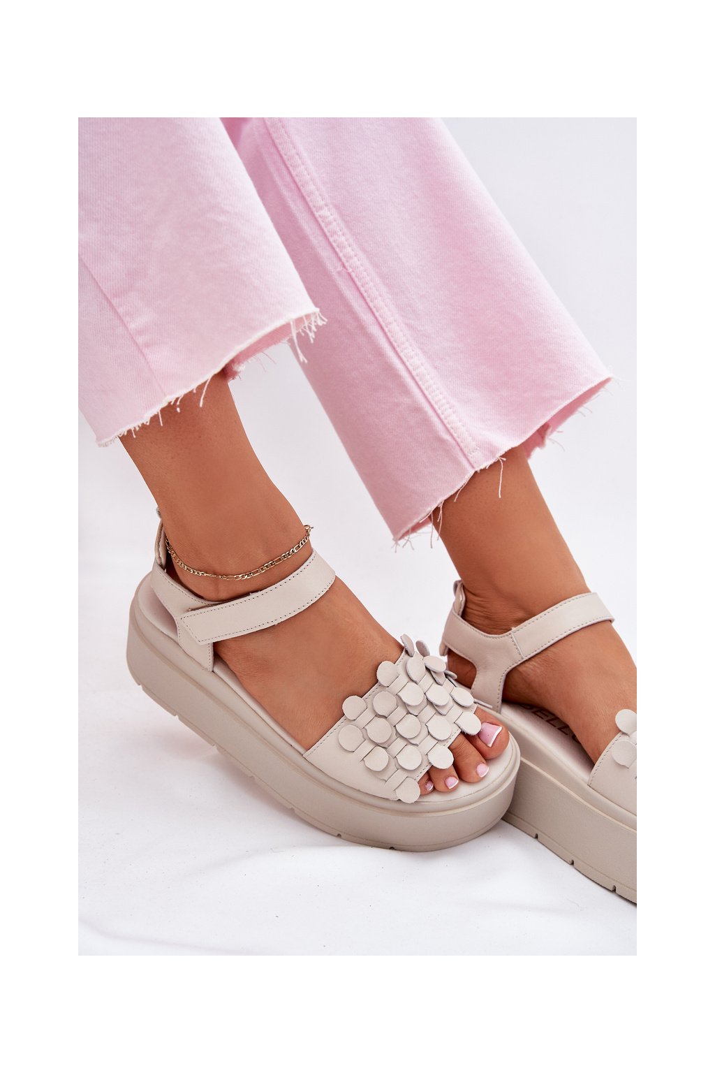 Béžové dámske kožené sandále na platforme s rovnou podrážkou CheBello 4701 BEŻ/ZŁOTO