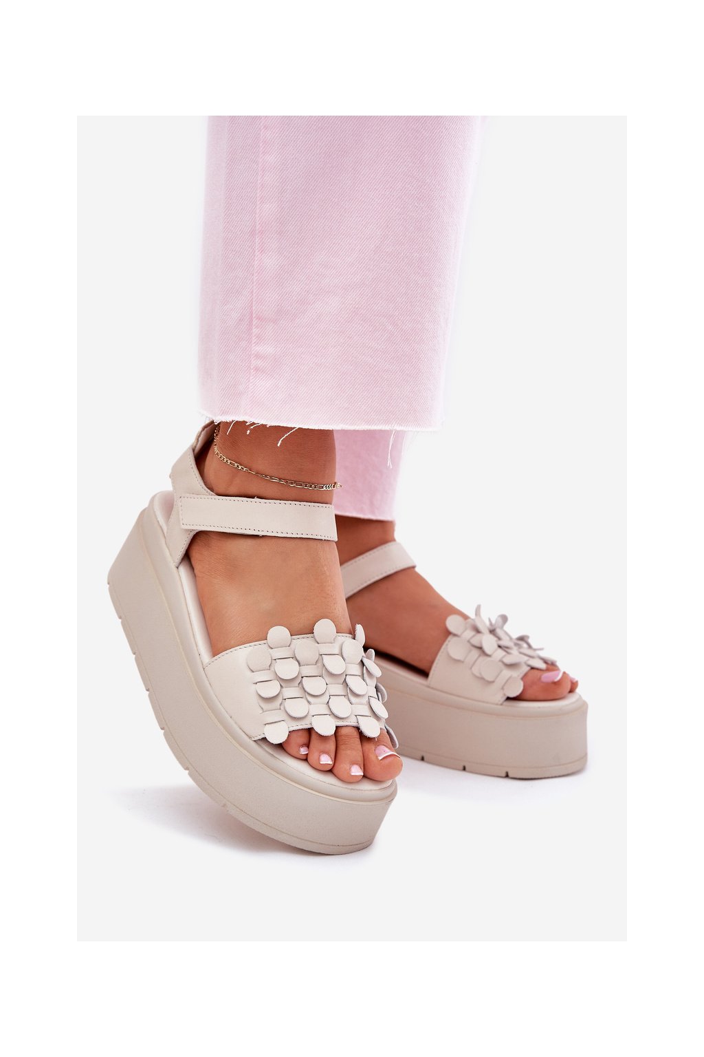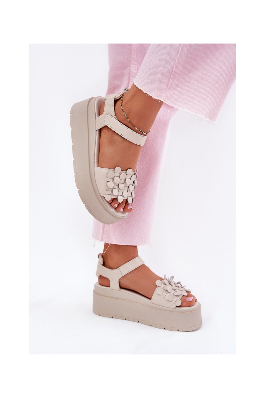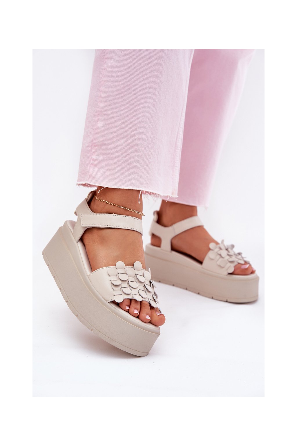 Béžové dámske kožené sandále na platforme s rovnou podrážkou CheBello 4701 BEŻ/ZŁOTO