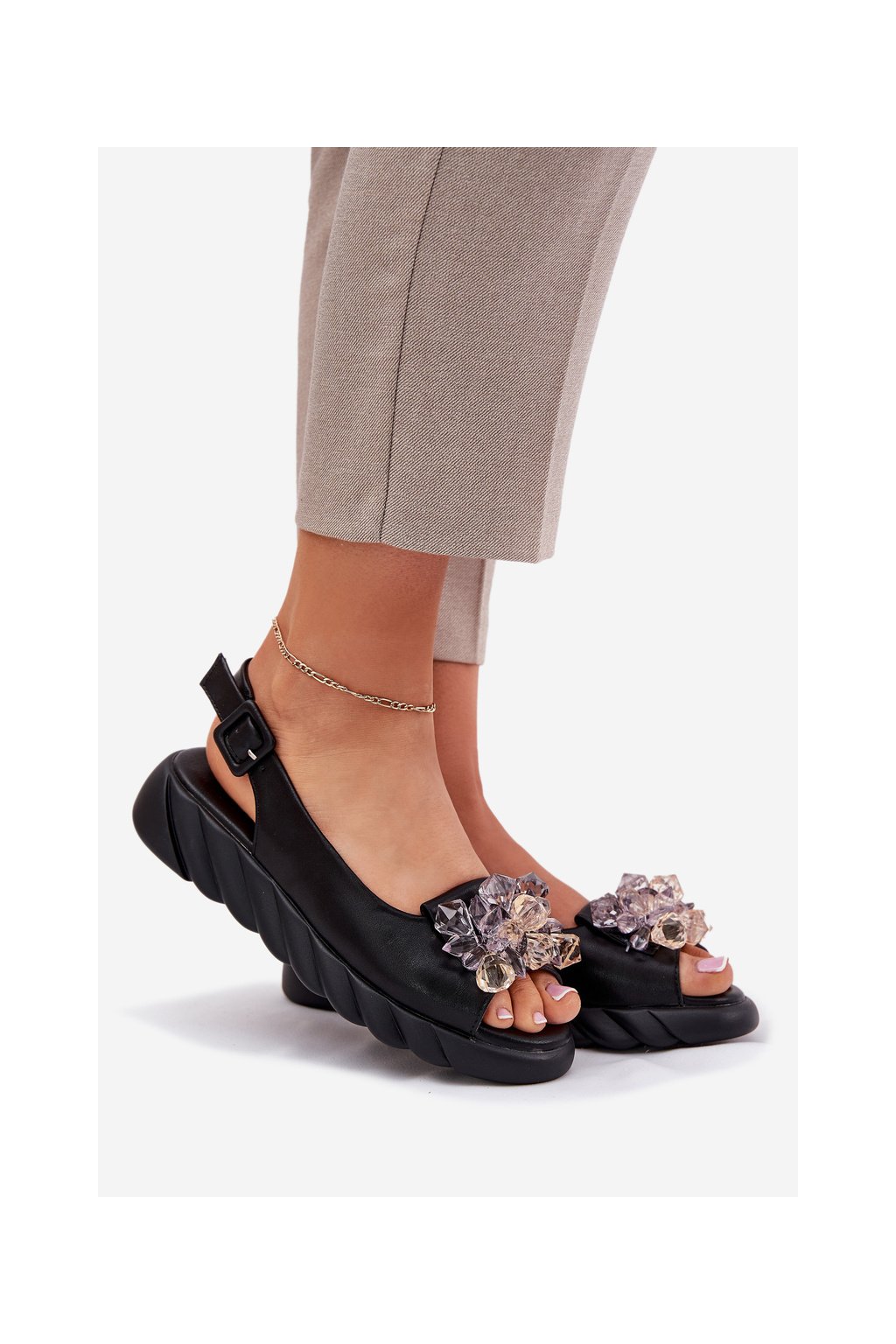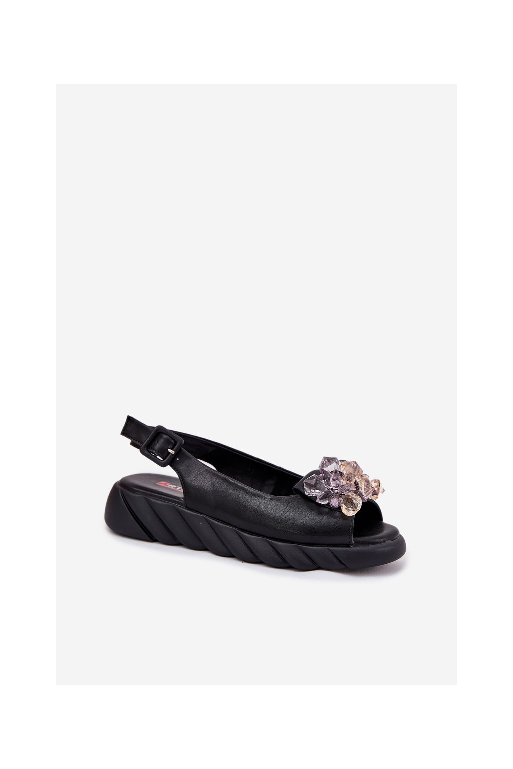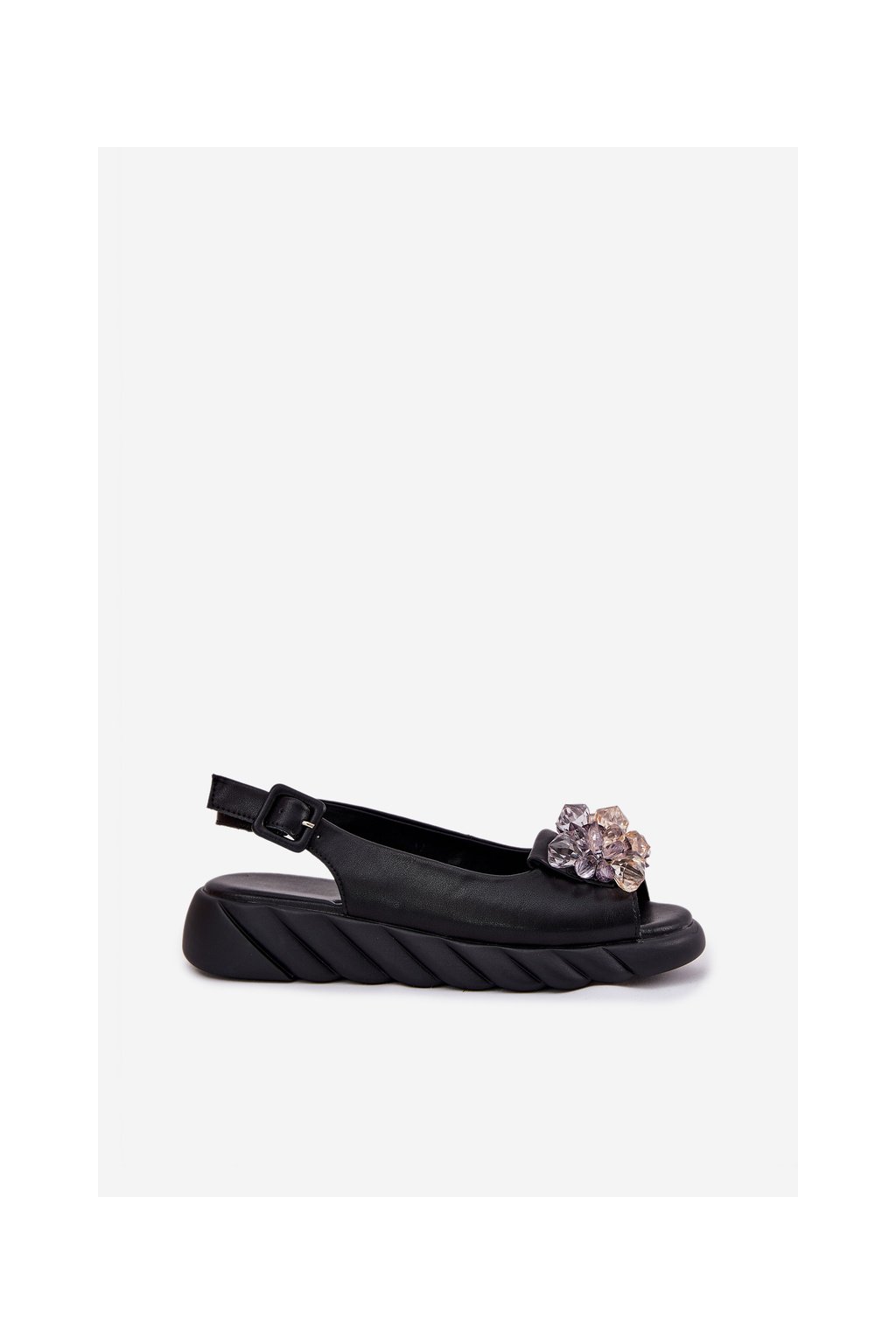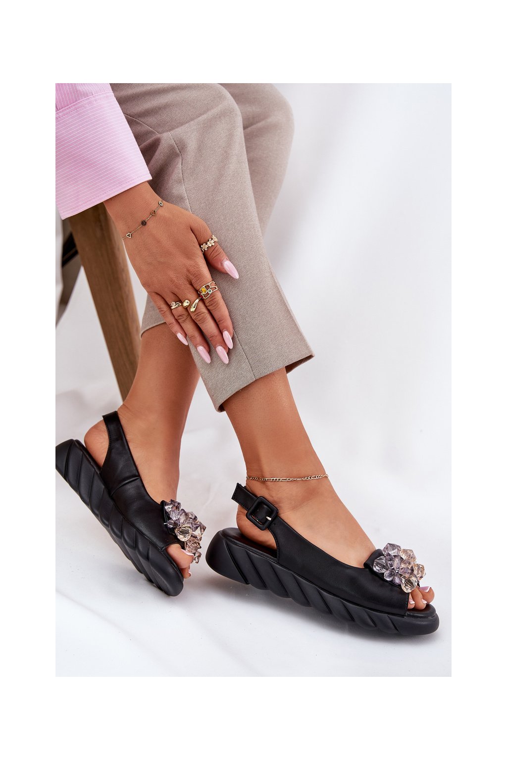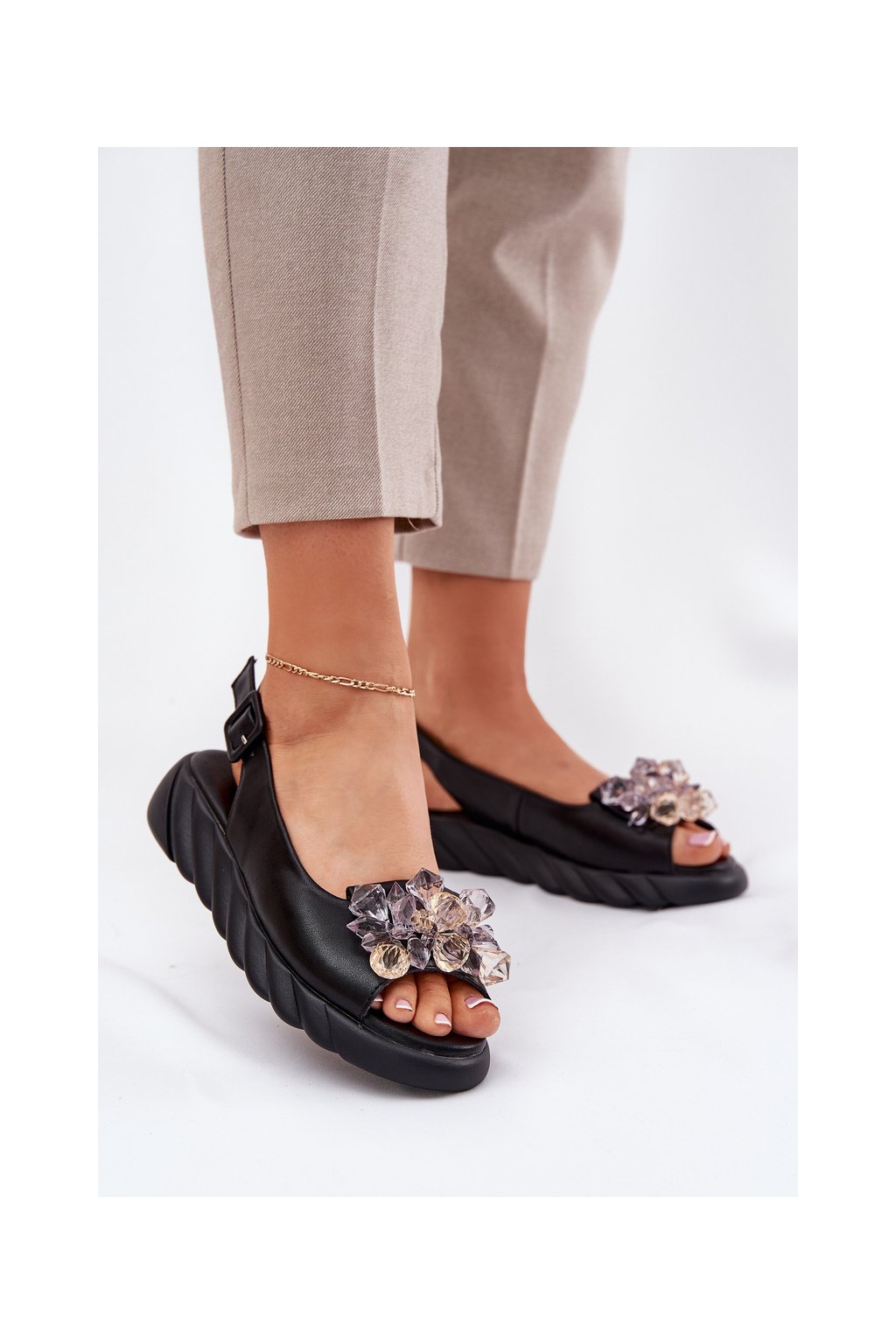 Čierne dámske kožené sandále s kryštálmi na rovnej podrážke, kód produktu 54C1628 BLACK