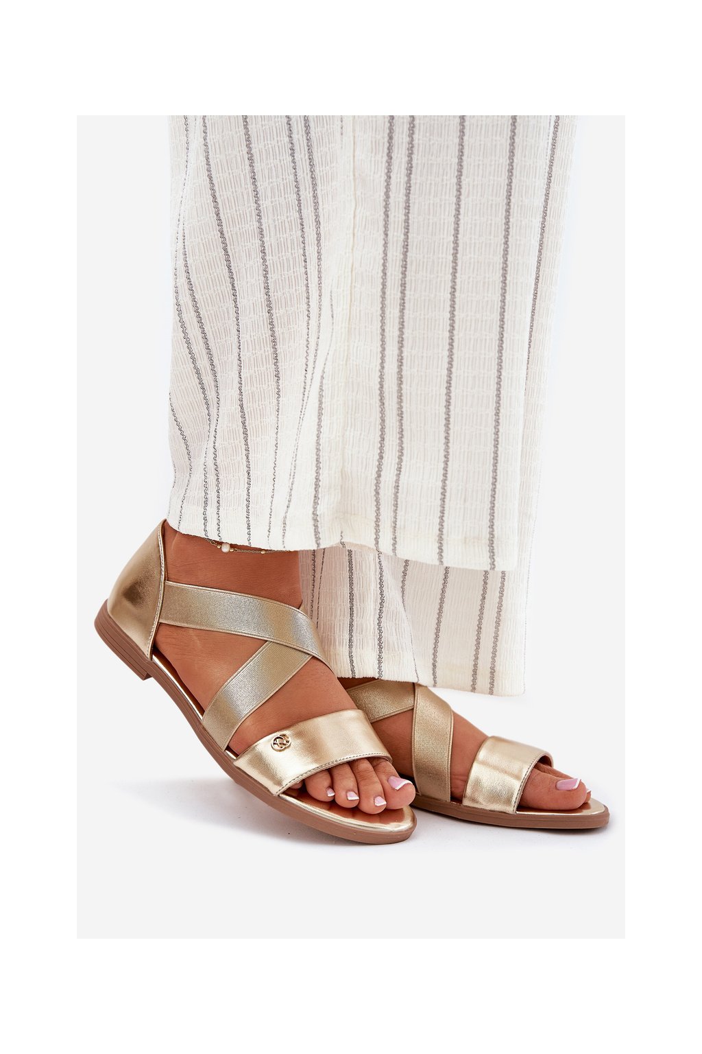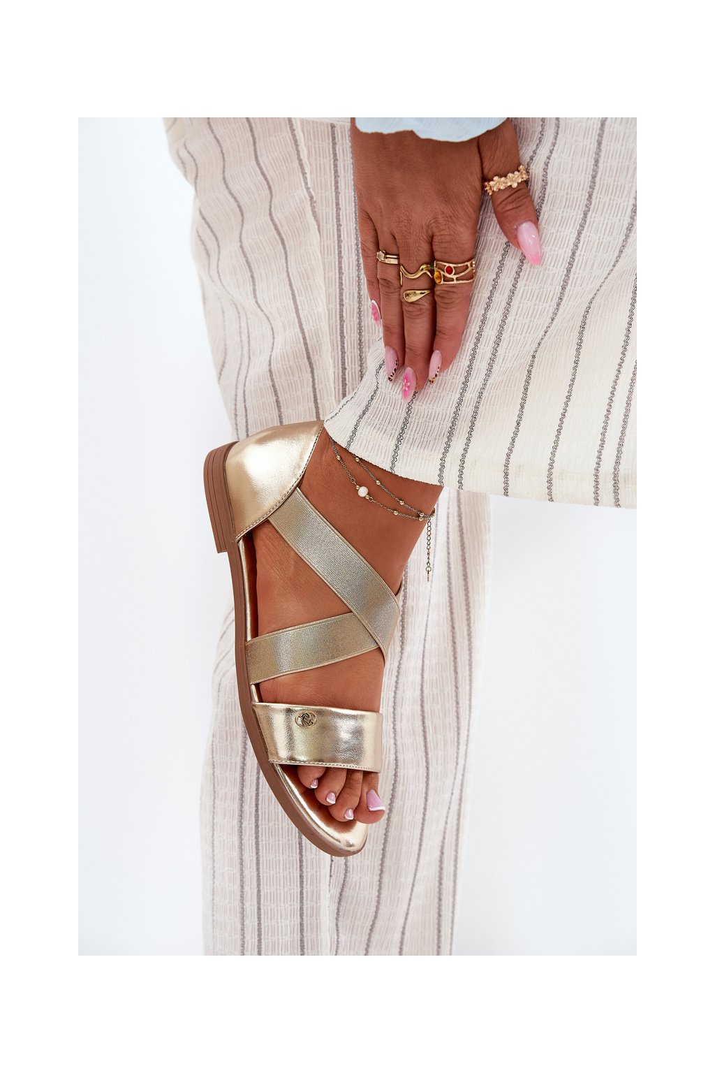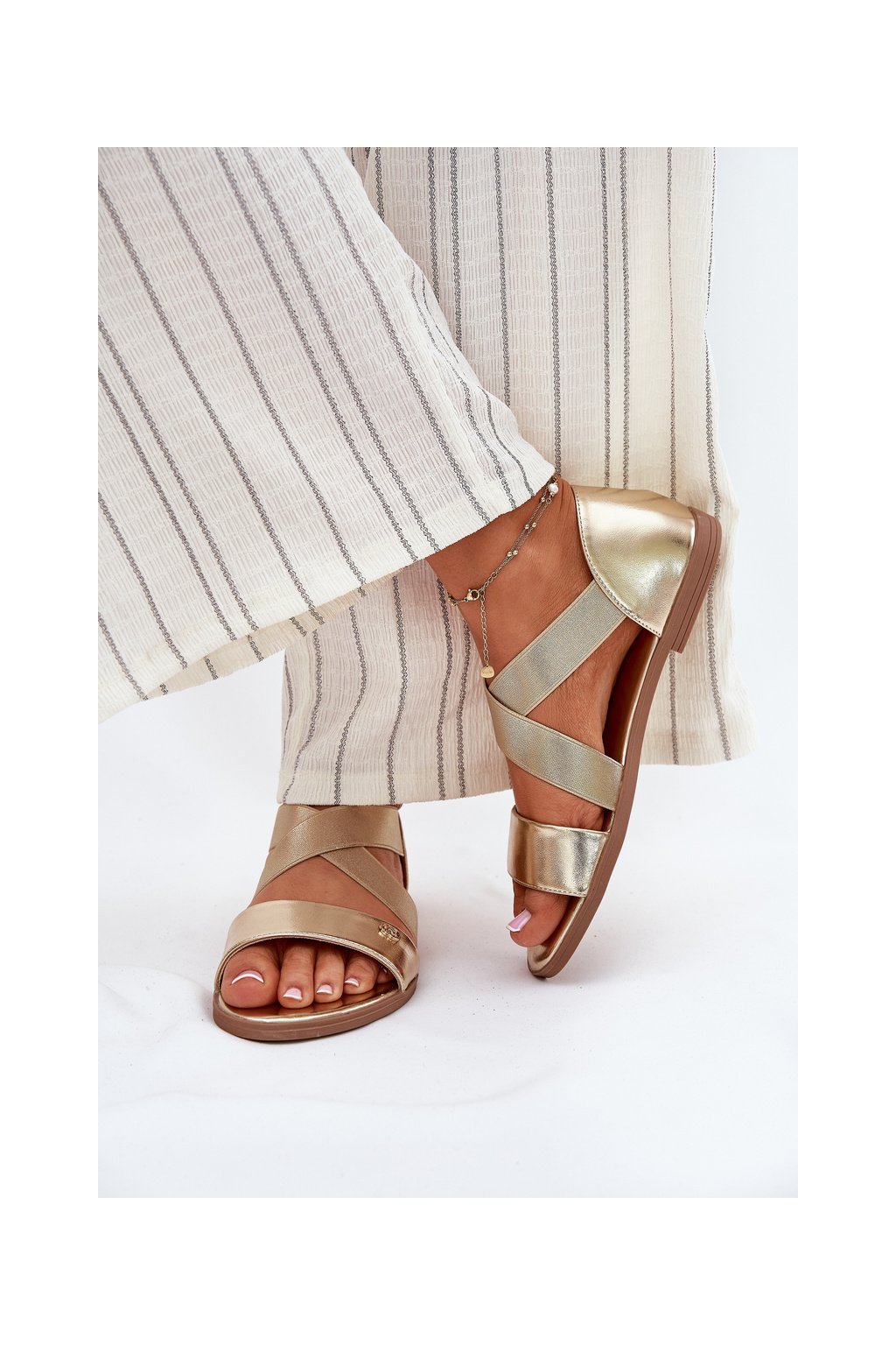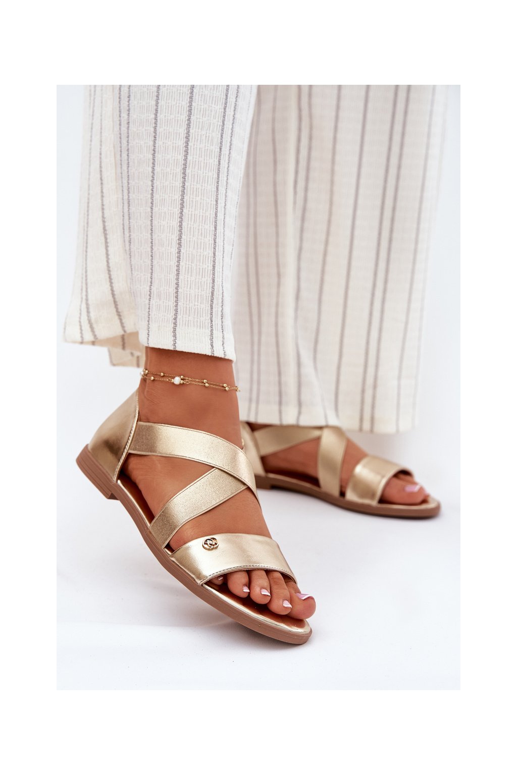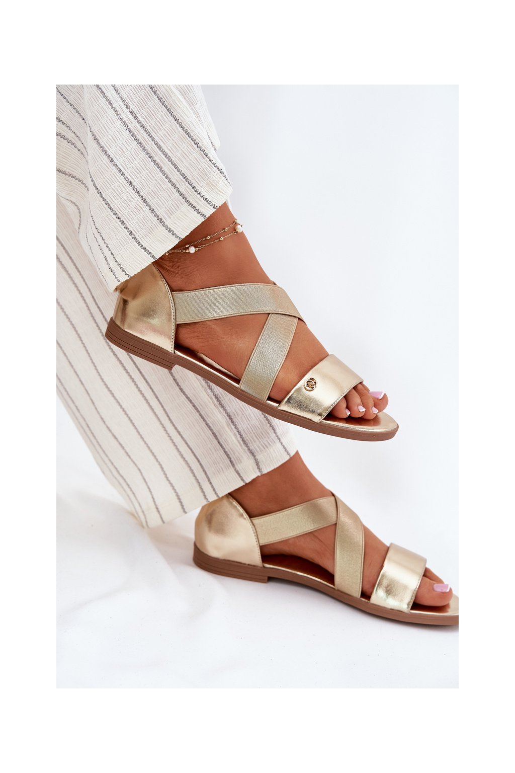 Zlaté dámske sandále z eko kože na rovnej podrážke, kód produktu 25SD35-3884 LT.GOLD