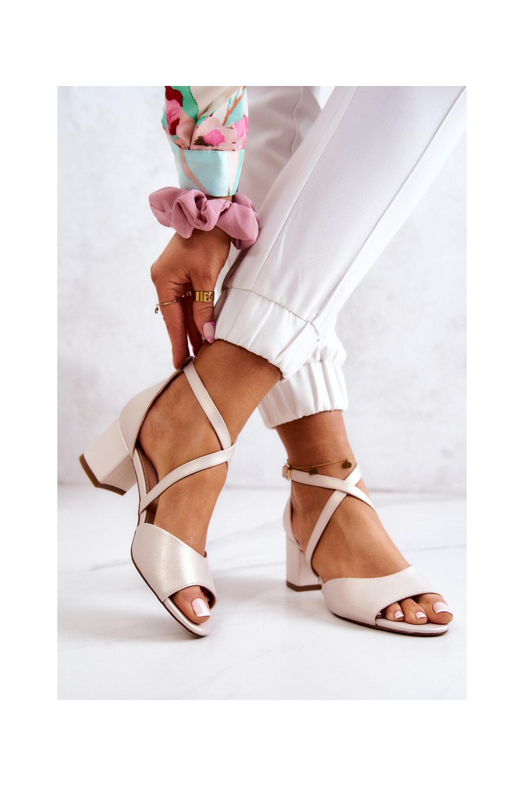 Dámske béžové sandále na stĺpovom podpätku s prírodnou koženou stielkou, kód produktu SK825 BEIGE PERLA