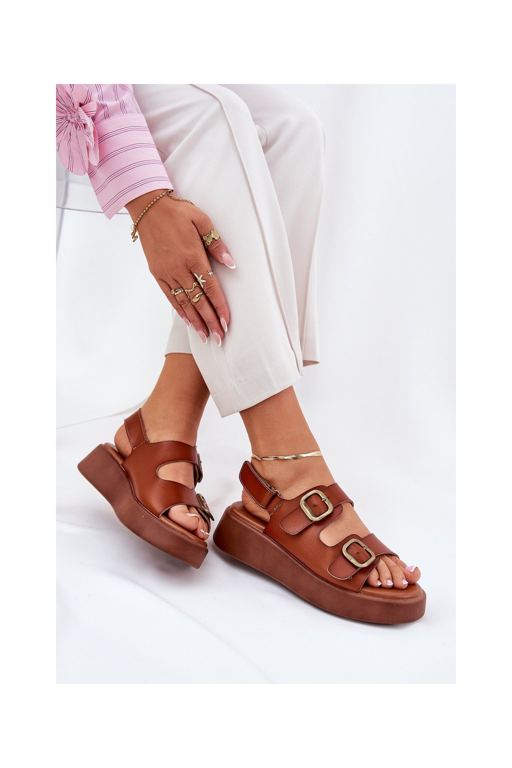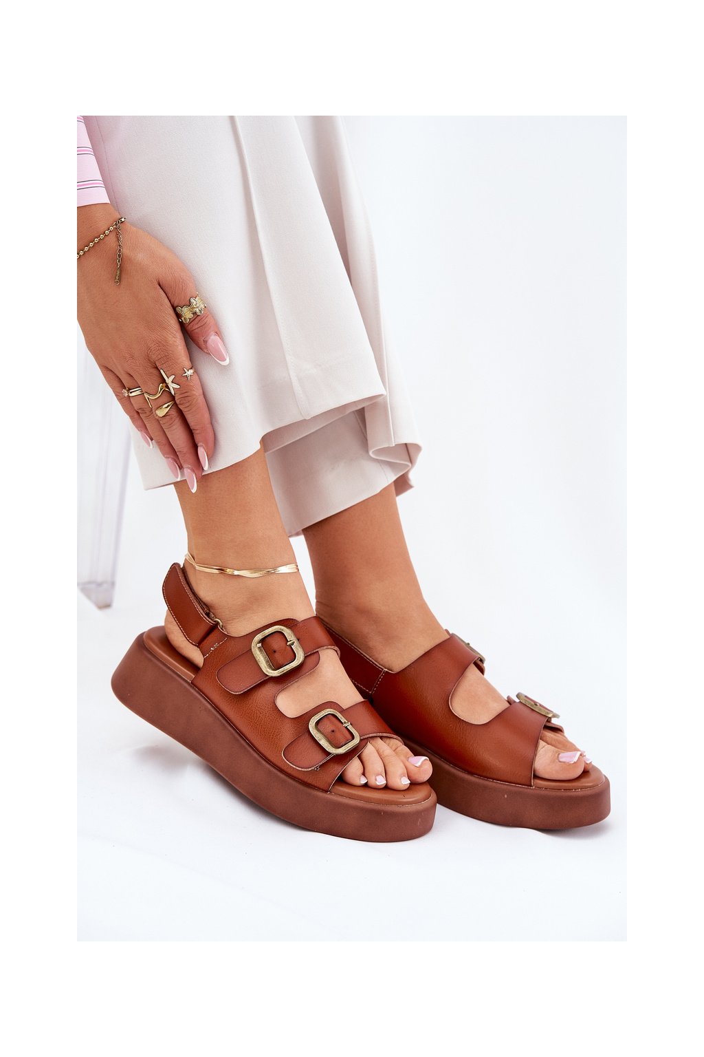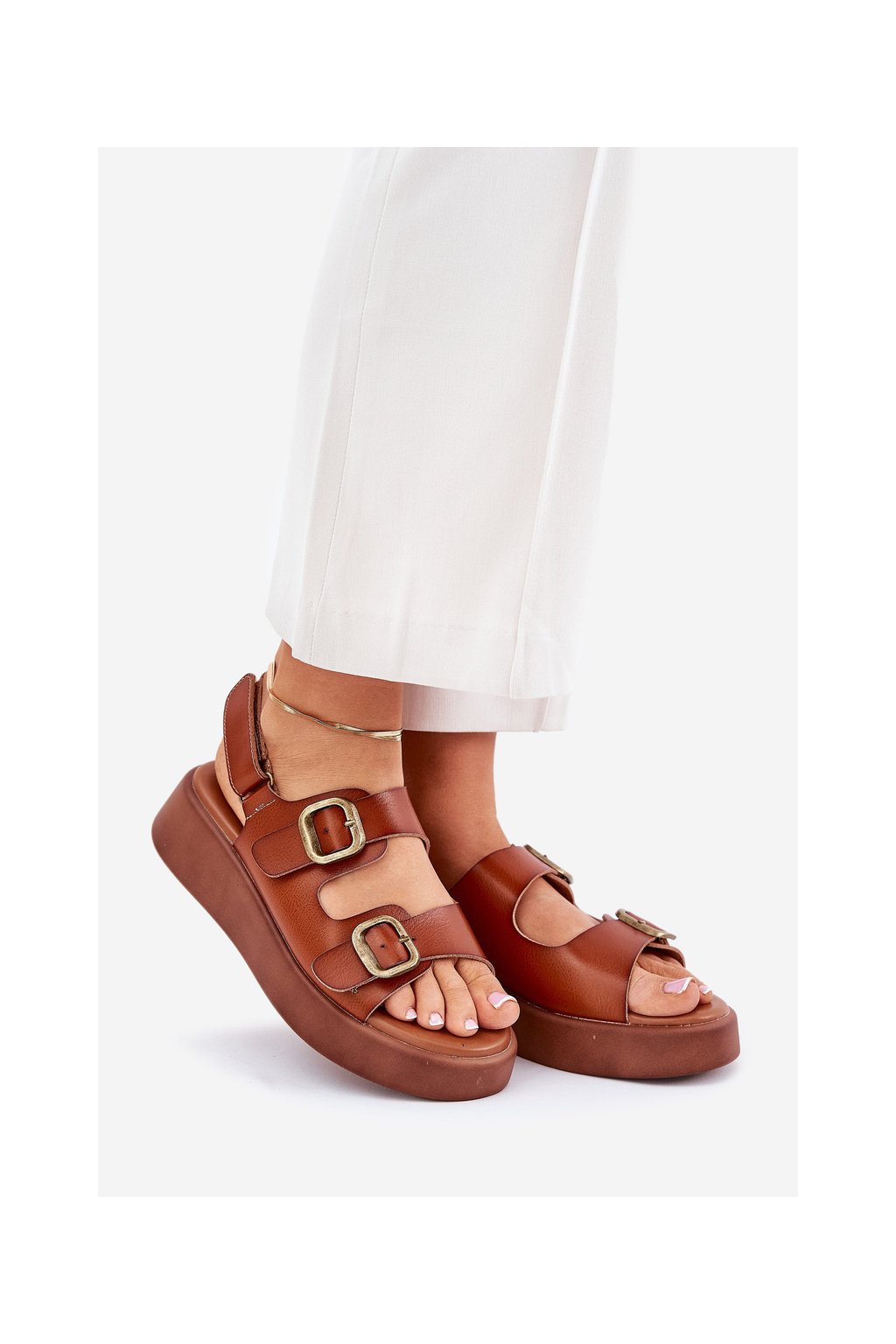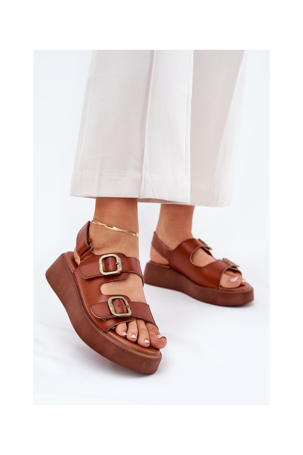 Hnedé dámske sandále na platforme a klinčeku s prackou, MAN0888 CAMEL