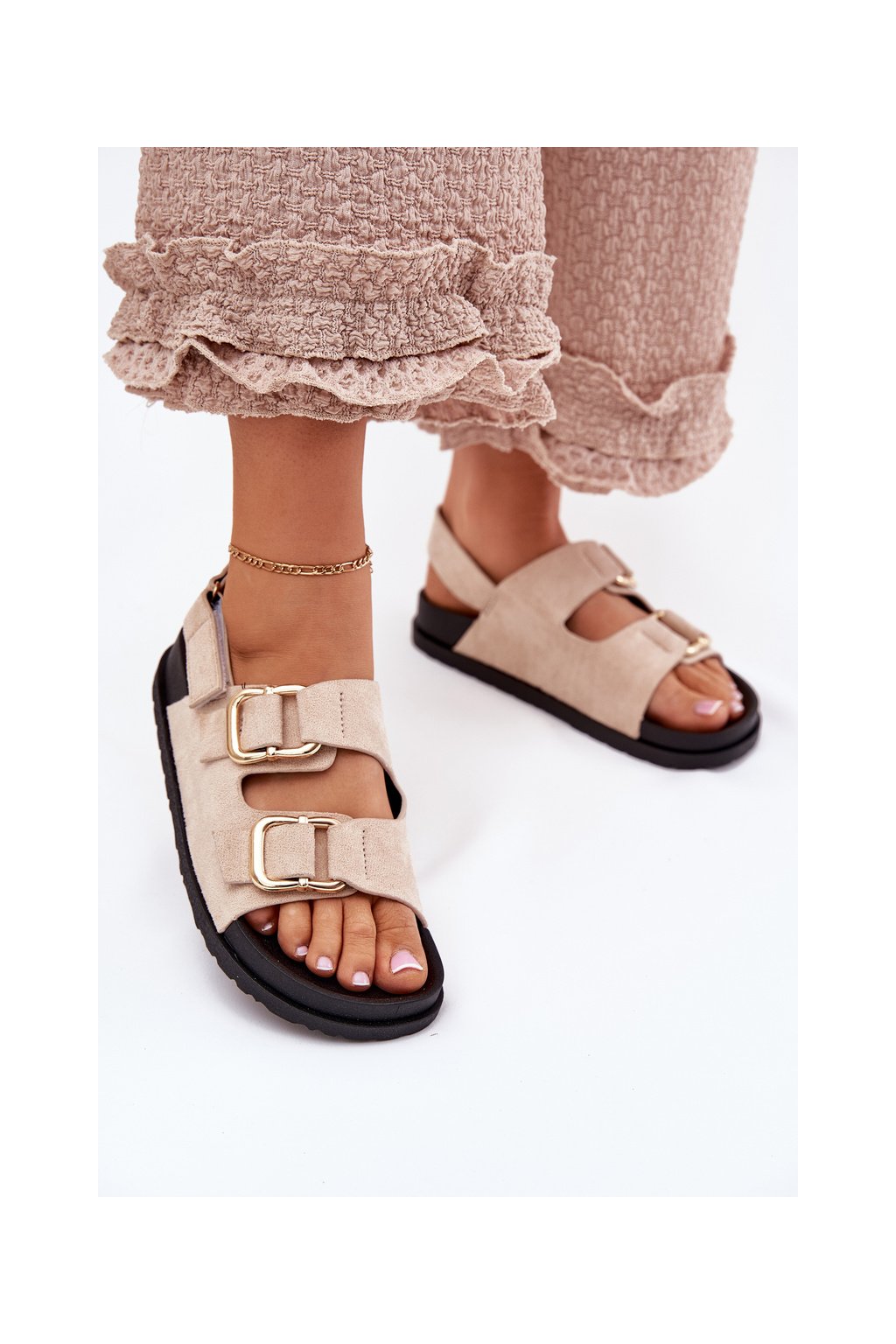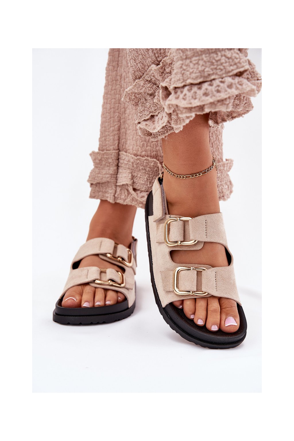Svetlo béžové dámske sandále z eko semišu s rovnou podrážkou a zlatými prackami, kód produktu 3776 BEIGE