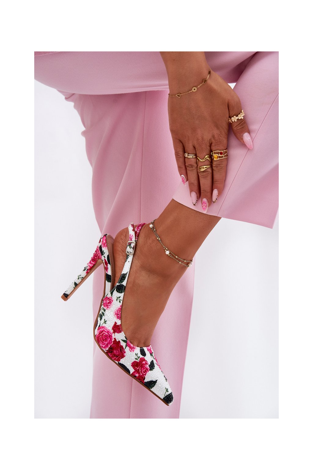 Model so špicatou špičkou krásne zoštíhľuje chodidlo. Zapínajú sa pomocou pracky okolo členka, ktorá zaisťuje stabilitu a prispôsobenie. Zvršok sa vyznačuje výrazným vzorom ruží, ktorý celku dodáva výnimočný charakter. Je to ideálna voľba na špeciálne príležitosti, večierky alebo letné večery, keď chcete zvýrazniť svoj jedinečný štýl. Pri výbere veľkosti sa riaďte tabuľkou veľkostí.