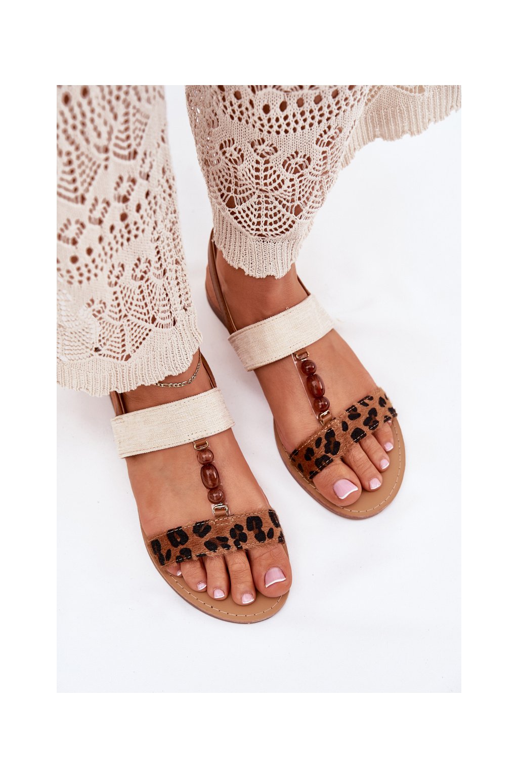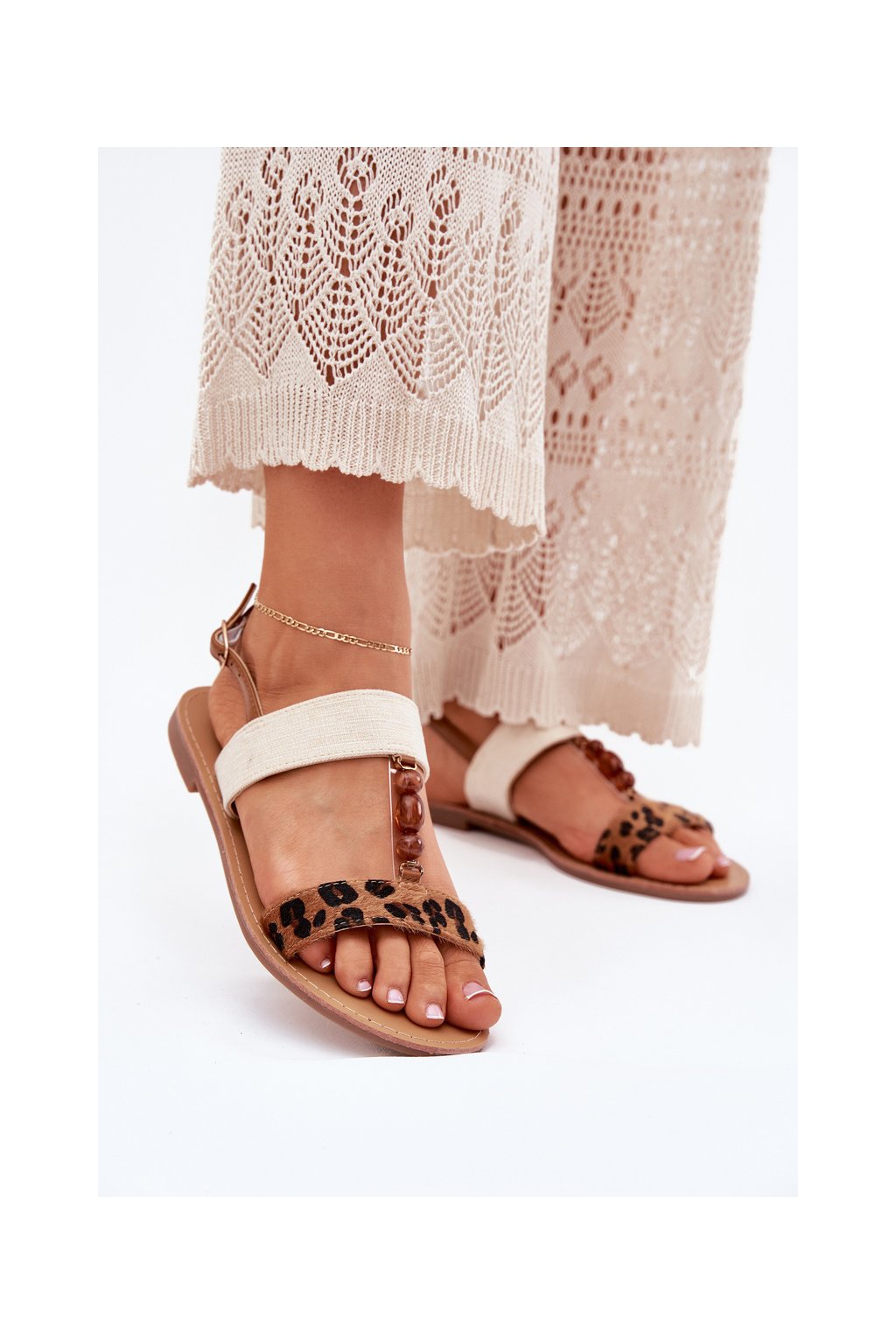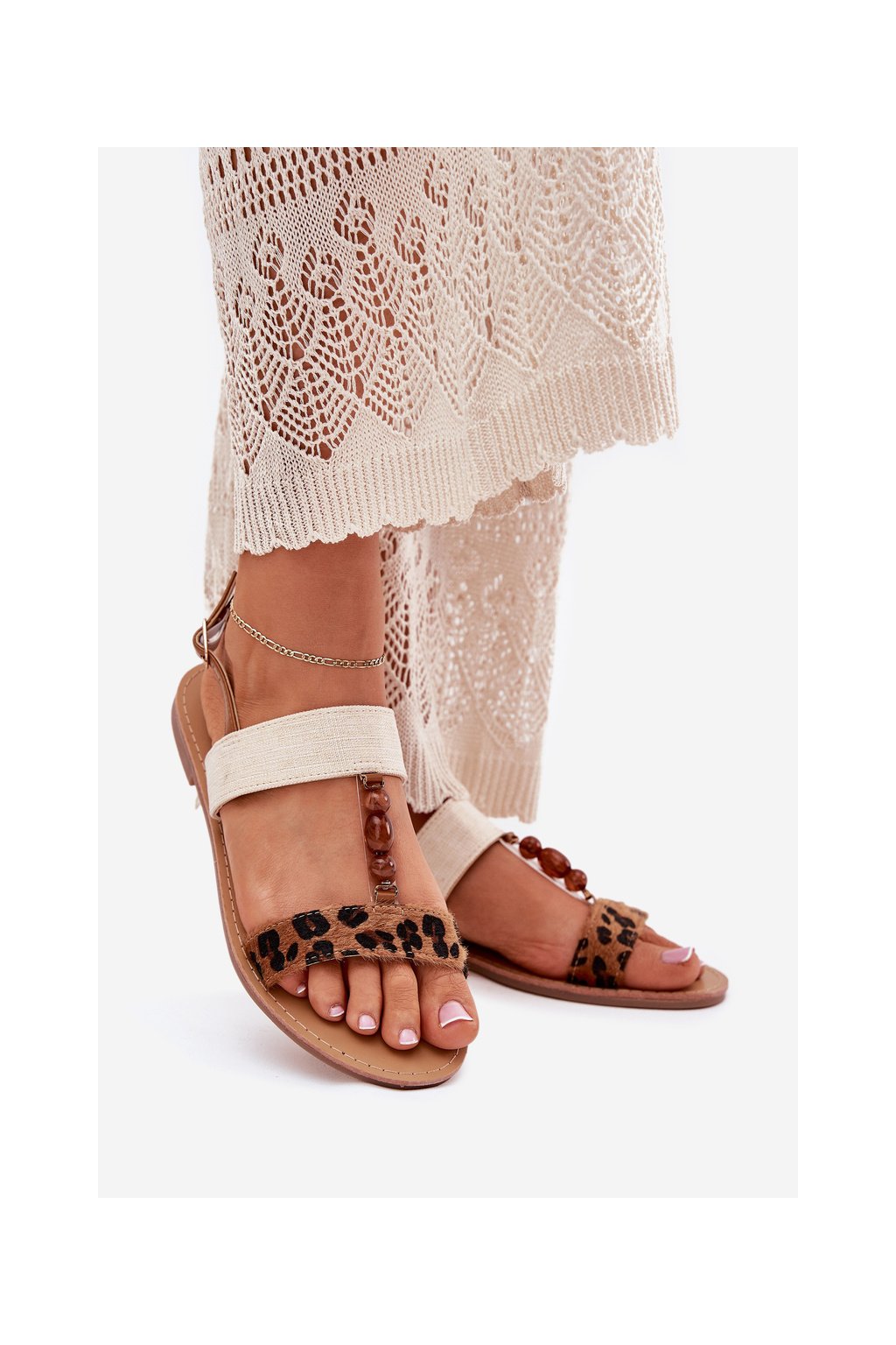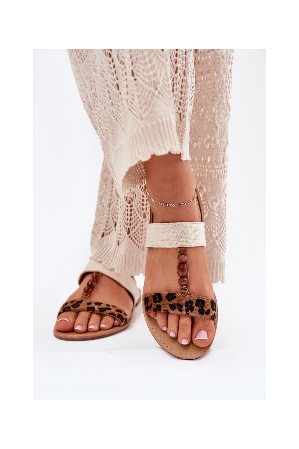 Hnedé dámske textilné sandále s leopardím vzorom a korálkami na rovnej podrážke, kód produktu BJ717 CAMEL LEOPARD