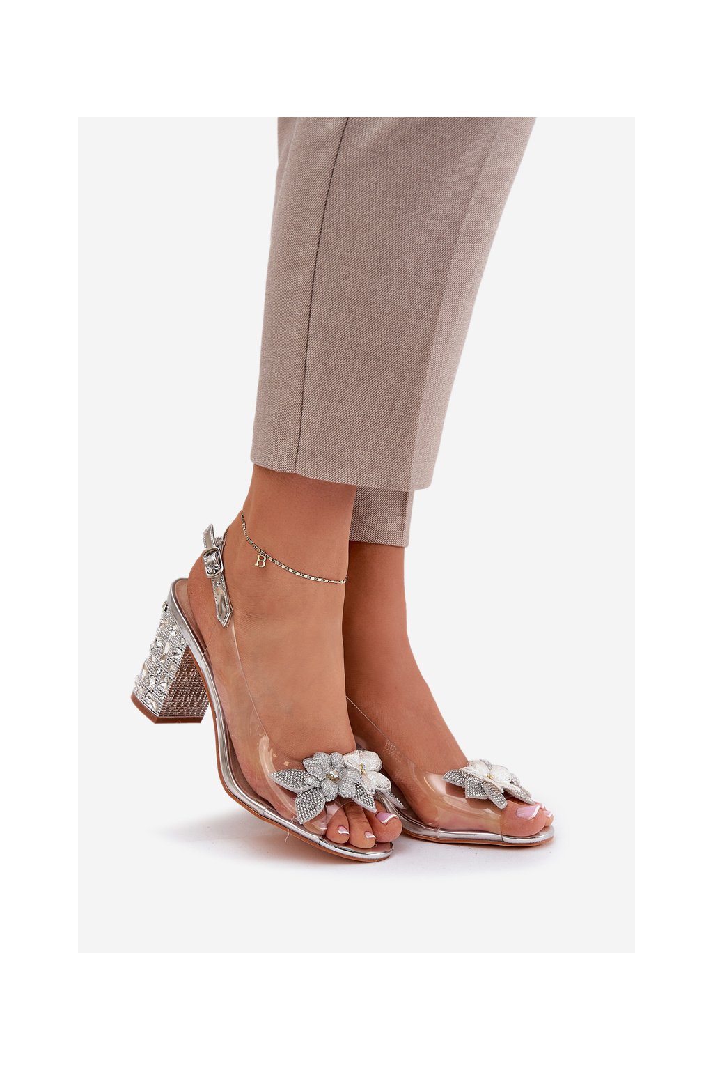 Strieborné dámske sandále s kvetmi na stĺpikovom podpätku MR38-331 SILVER