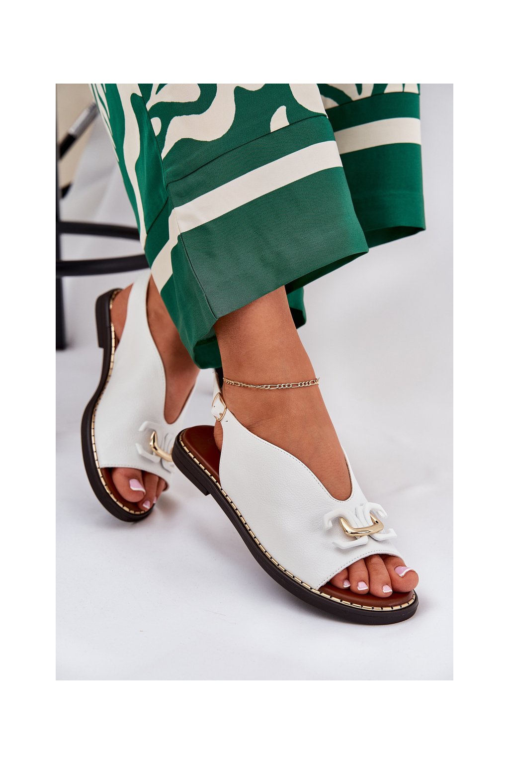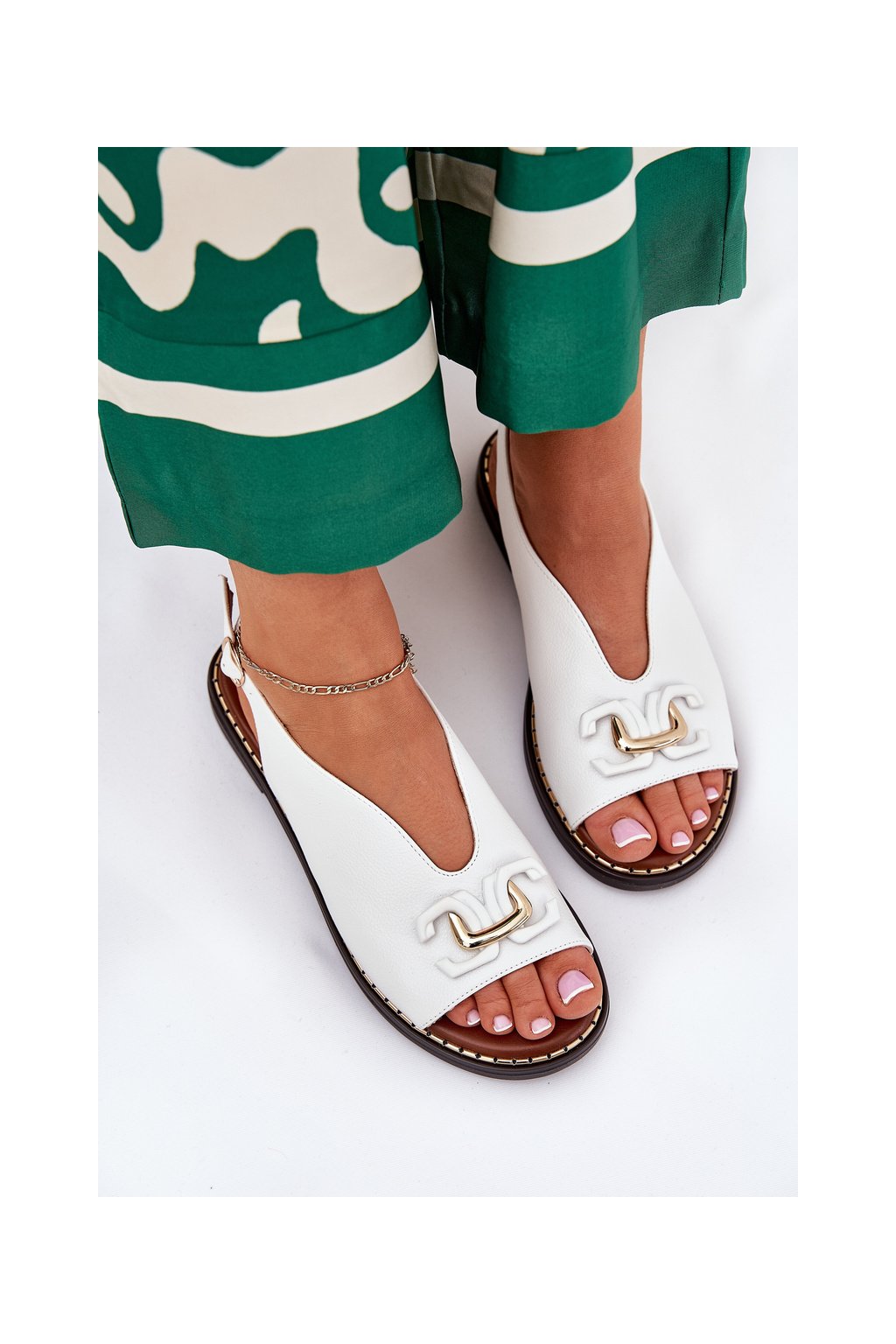Biele dámske sandále z ekokože na rovnej podrážke s ozdobou, kód produktu A8205 WHITE