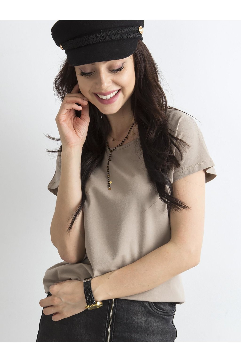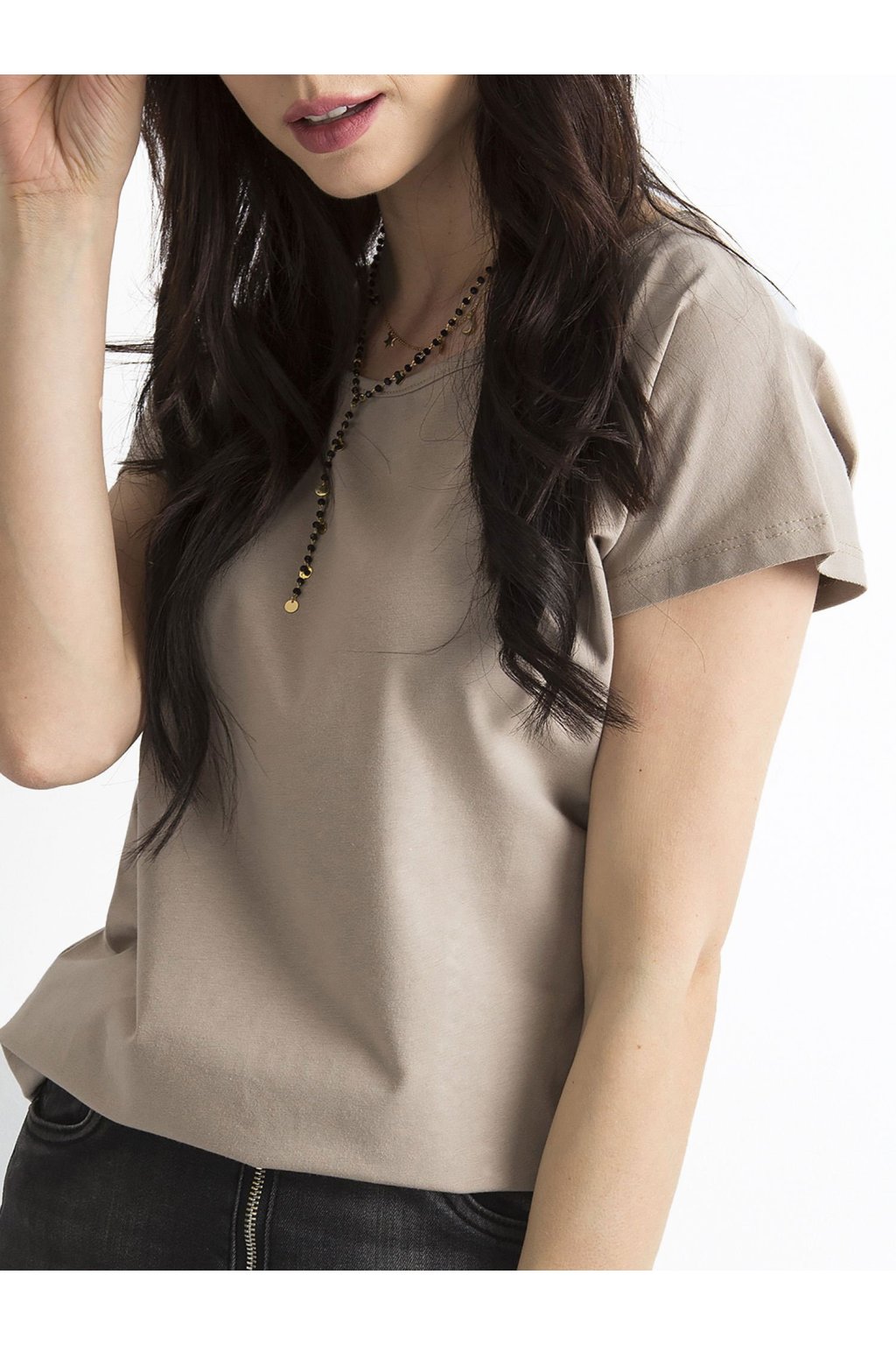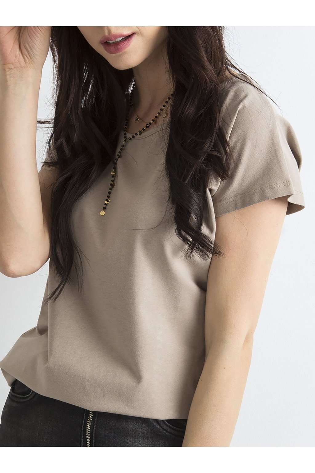 Ciemnobeżowy t-shirt Circle Gładki t-shirt damski zrobiony z miękkiej w dotyku bawełny to ulubione ubranie wielu kobiet, które wręcz nie wyobrażają sobie bez niego codziennych stylizacji. Taki fason jest bardzo wygodny, a także bardzo uniwersalny i ponadczasowy, ponieważ pasuje do niego wiele innych ubrań, a ponadto nigdy nie wyjdzie z mody. Nasz t-shirt damski basic ma klasyczny okrągły dekolt, krótkie rękawy oraz luźniejszy krój, który fajnie układa się na ciele i nie krępuje ruchów. Zrobiony jest z wysokiej jakości materiału z przeważającą zawartością czystej bawełny w składzie, dlatego koszulka jest jednocześnie przewiewna i przyjemna w dotyku. Z tego modelu dostępnych jest wiele modnych kolorów, które wyglądają twarzowo i pasują do innych ubrań. Taki gładki t-shirt damski basic wygląda świetnie w połączeniu z jeansami, szortami lub spódniczkami.