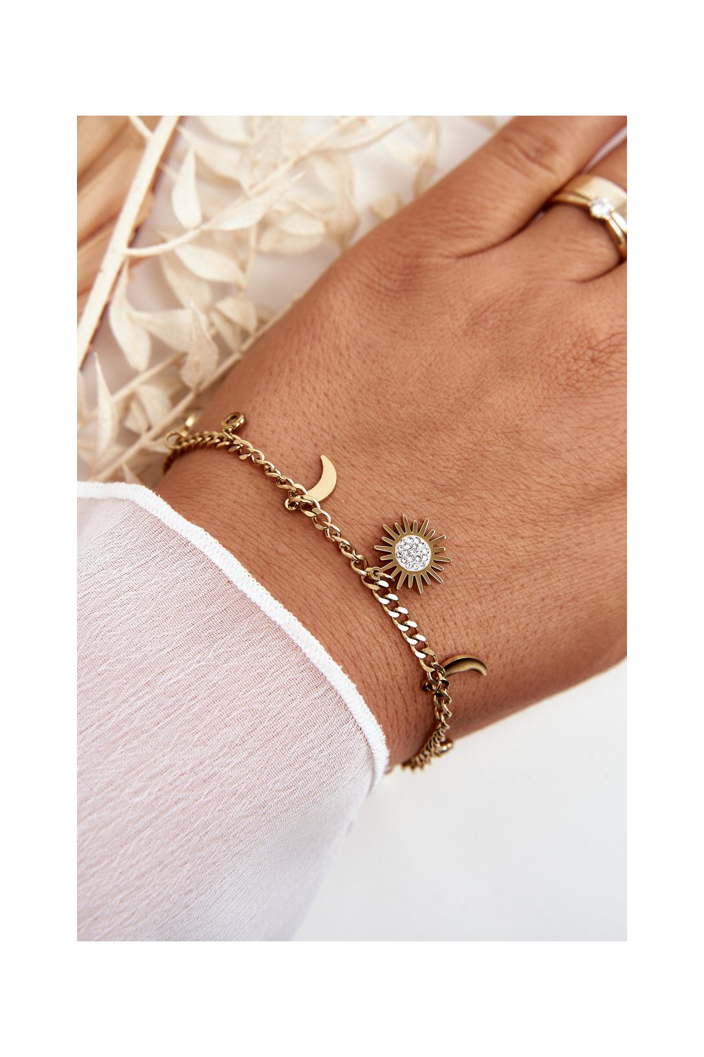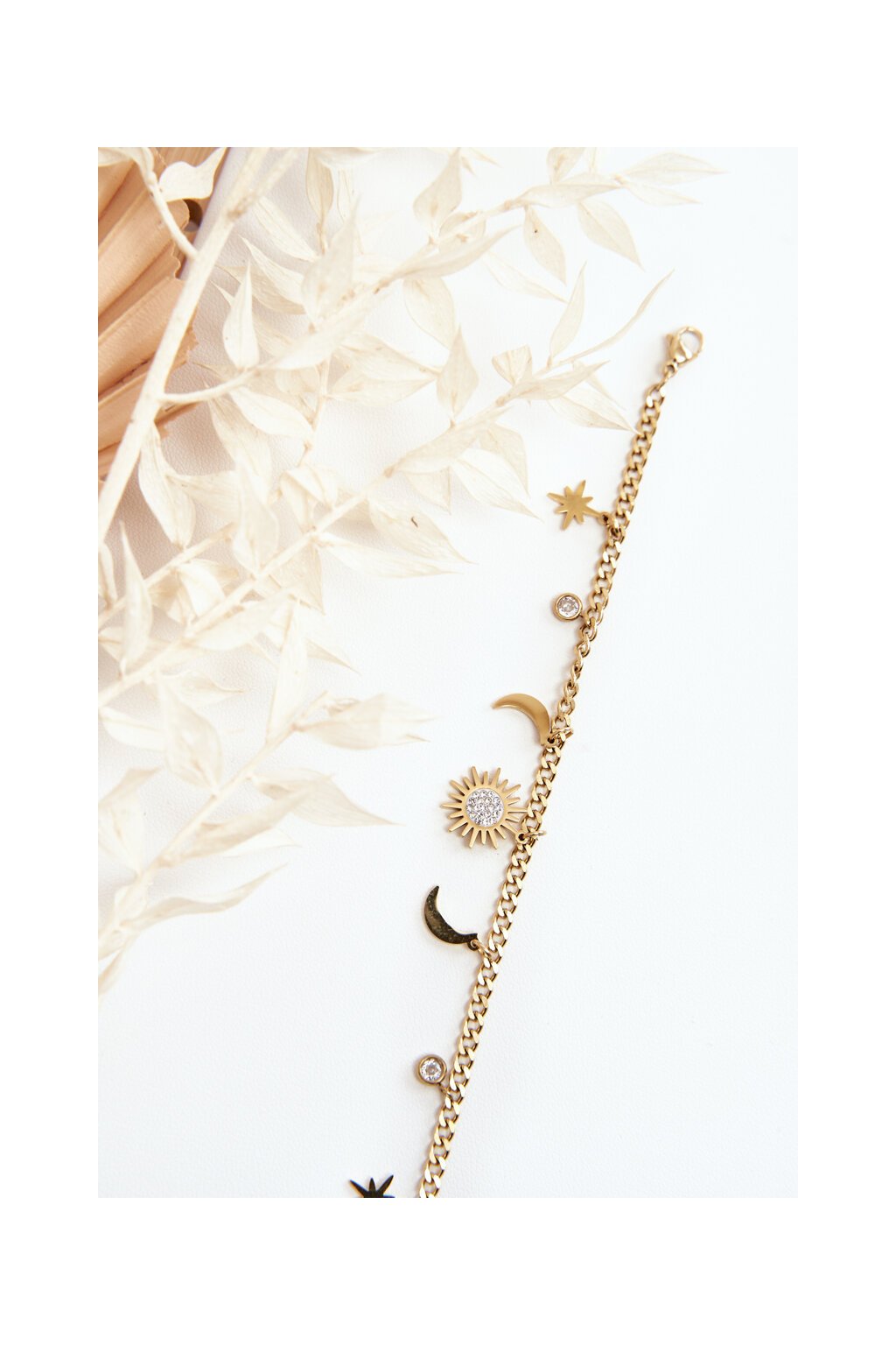 Náramek je vyroben z nerezové oceli. Má možnost nastavení délky a několik přívěsků v podobě slunce, měsíce, hvězd a kamínků imitujících zirkony. Náramek vypadá velmi zvláštně. Podívejte se také na naši další nabídku modelů šperků. Musíte to mít!