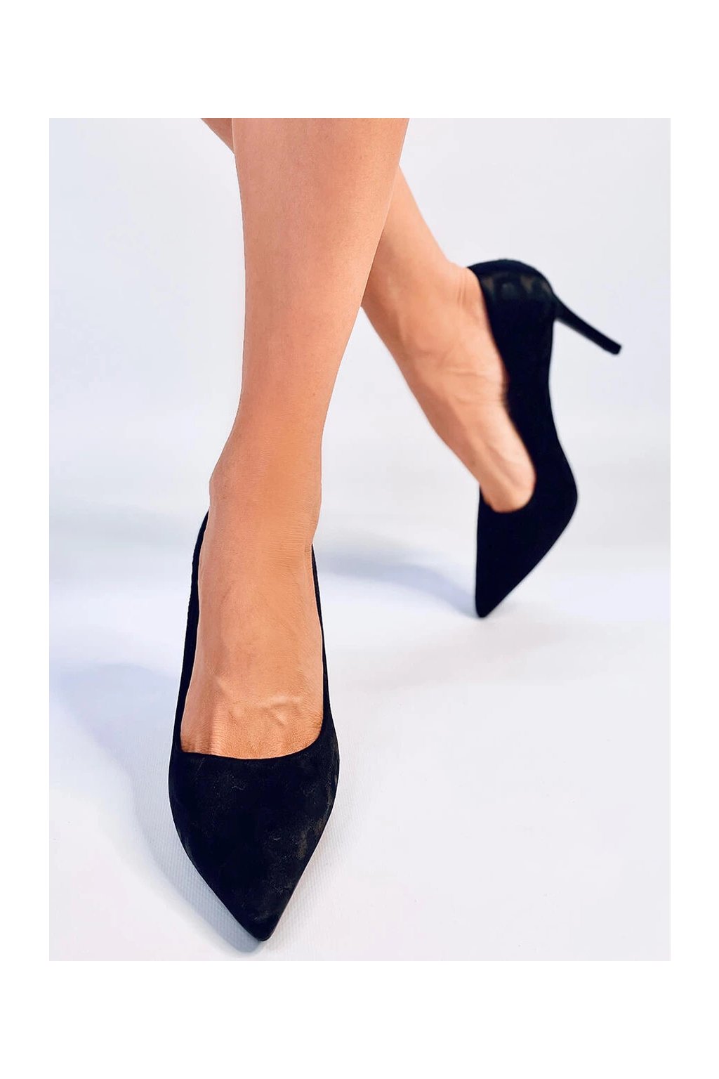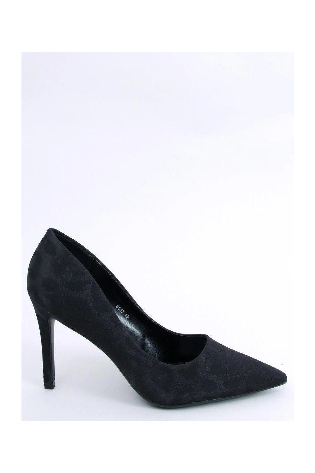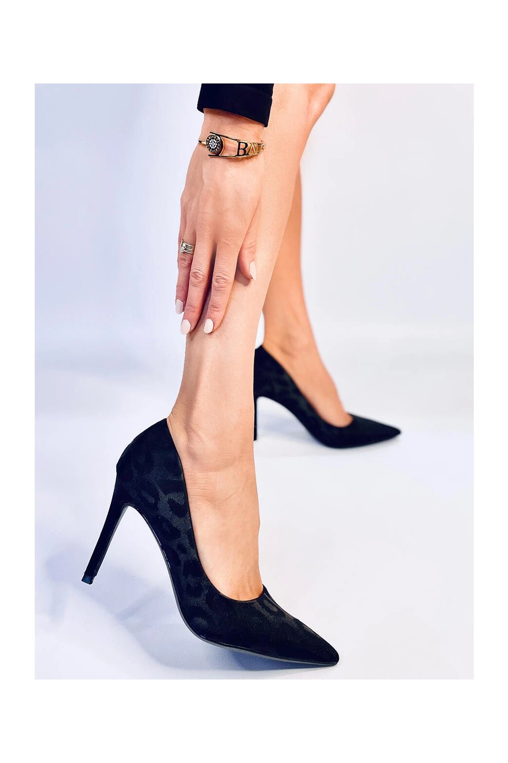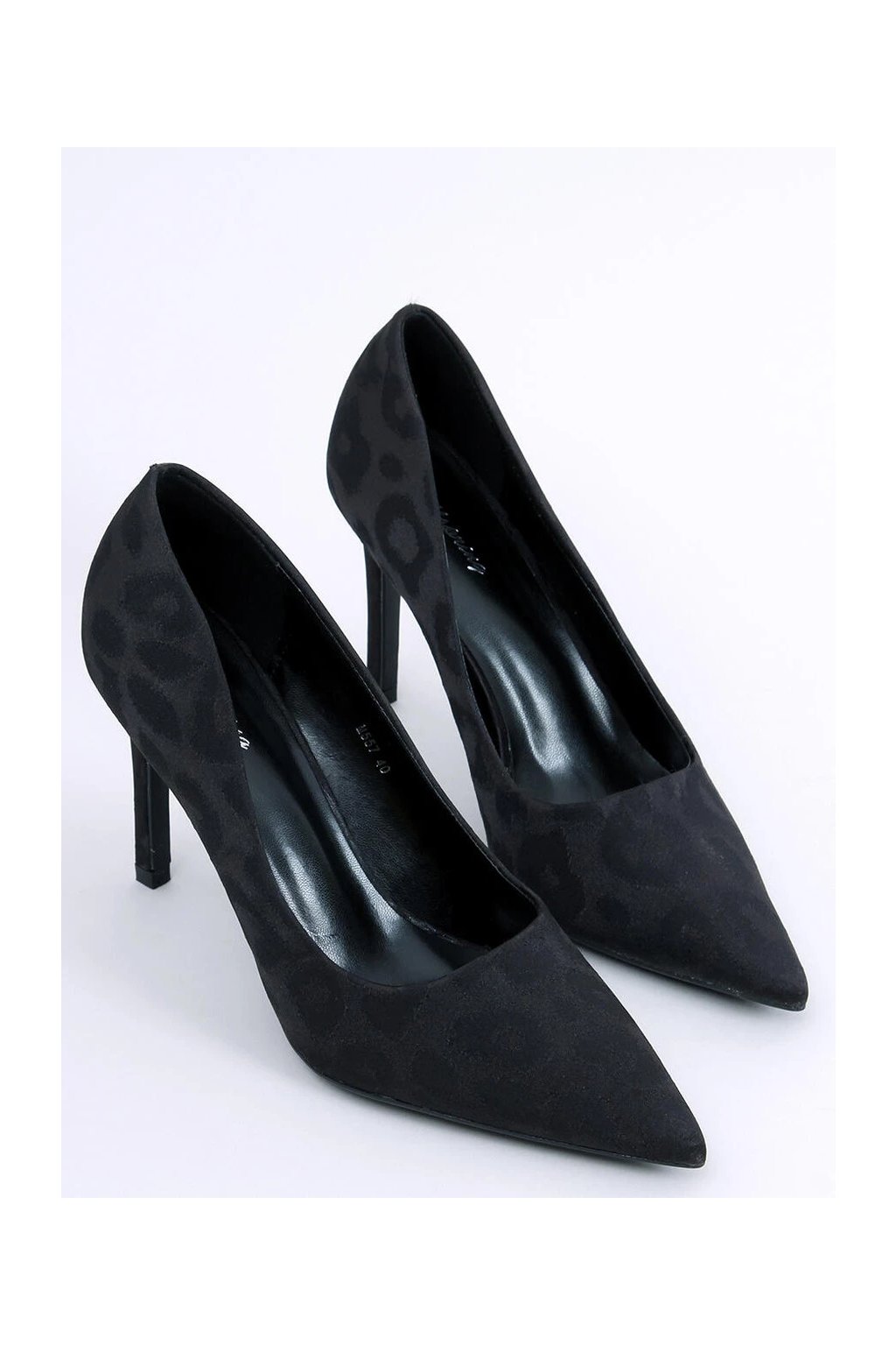 Dámske čierne lodičky s ihlovou podpätkou nad 9 cm s textilným zvrškom a špicatou špičkou, zdobené zvieracím motívom, kód M557
