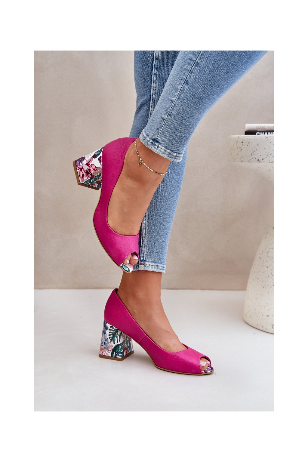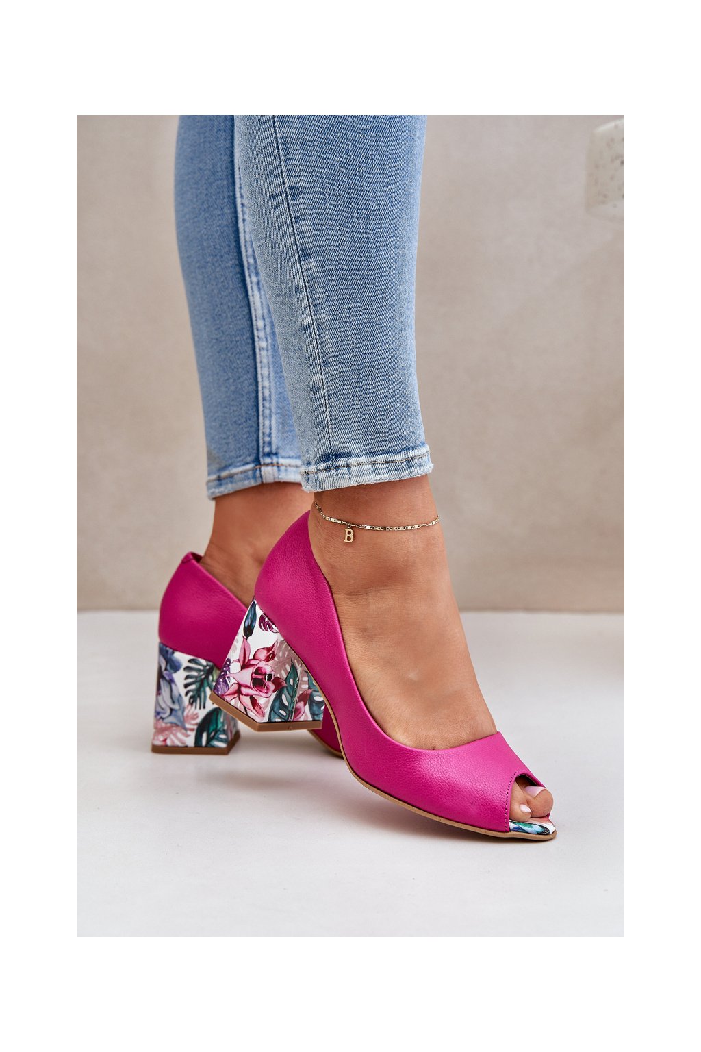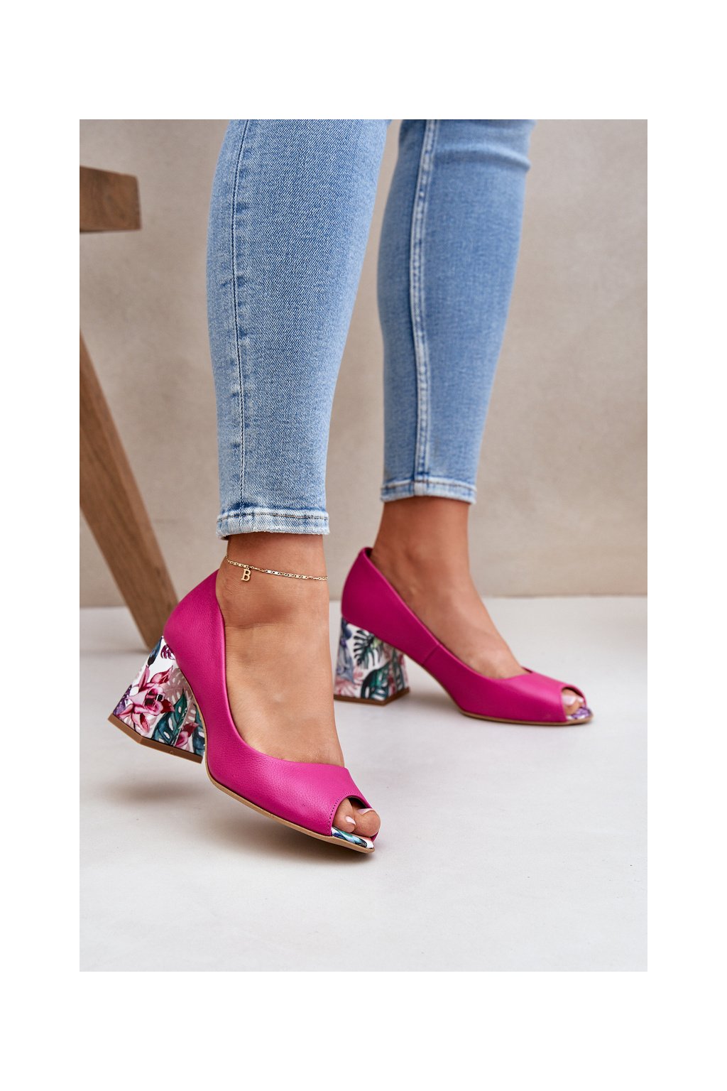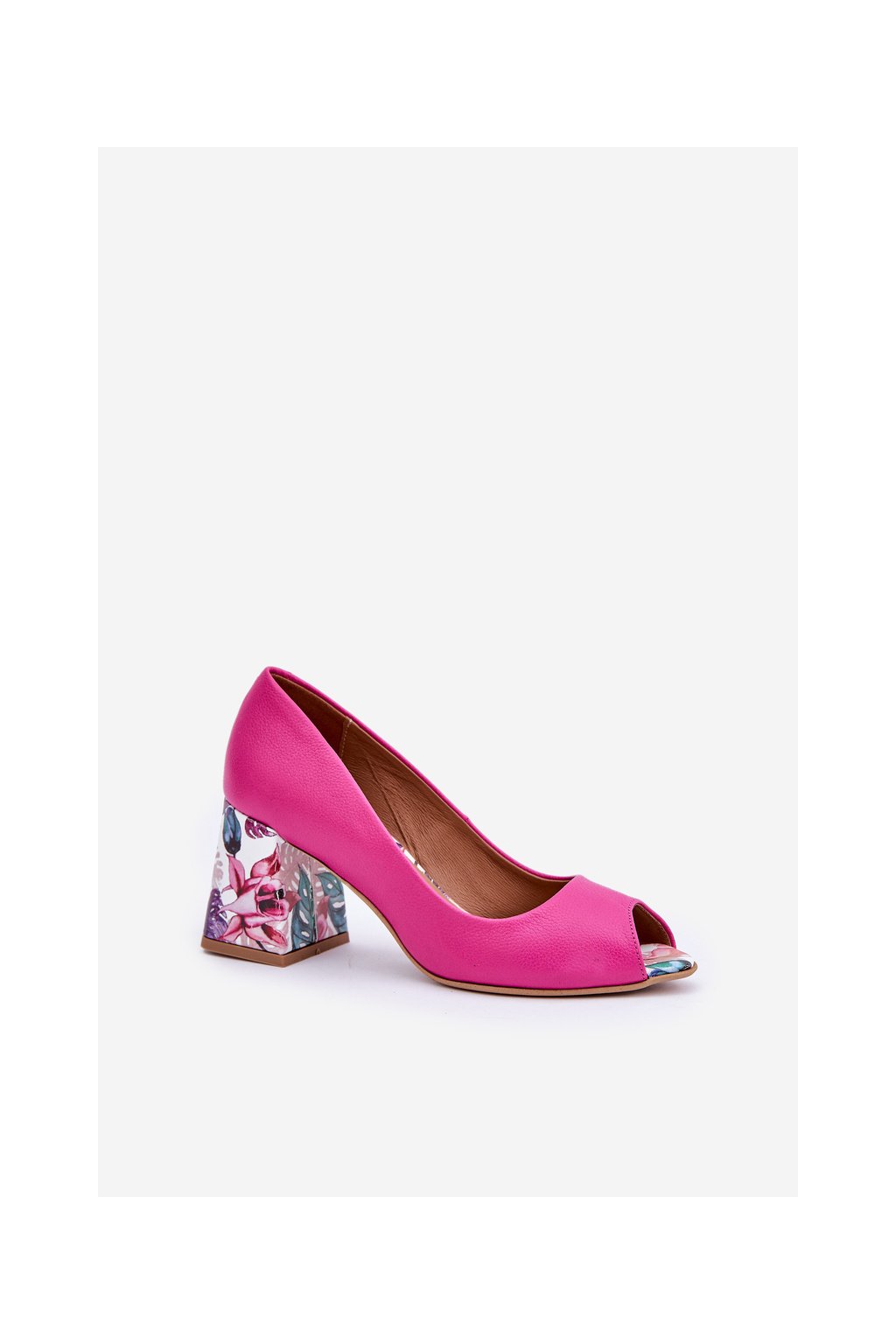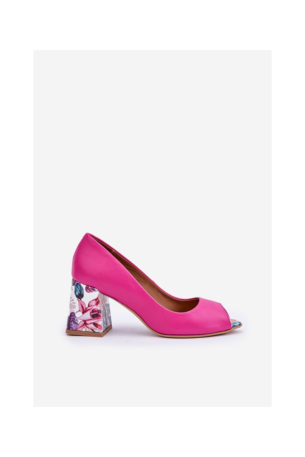 Ružové dámske lodičky z prírodnej kože, blokový podpätok, kód 2608/K FUKSJA GROCH