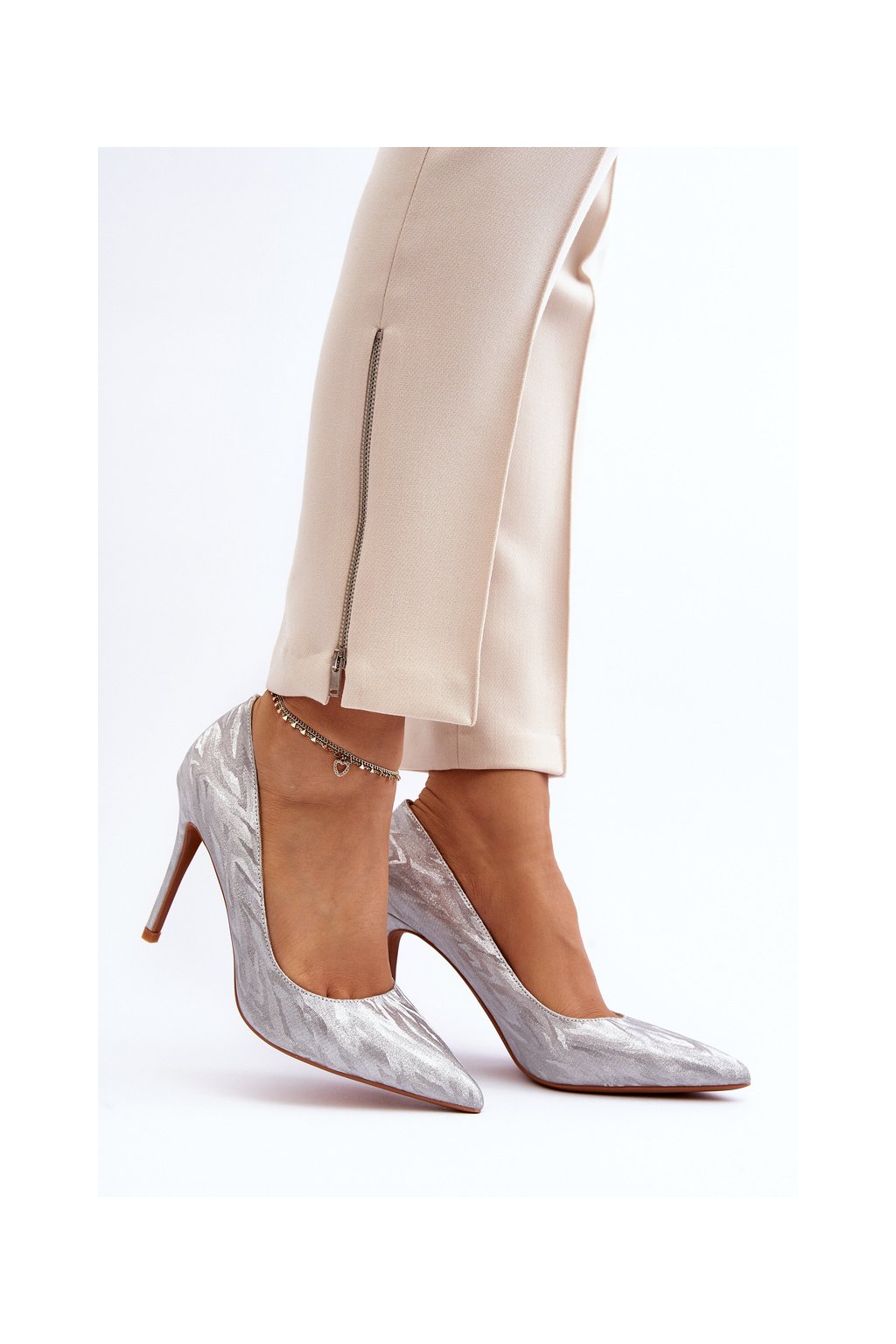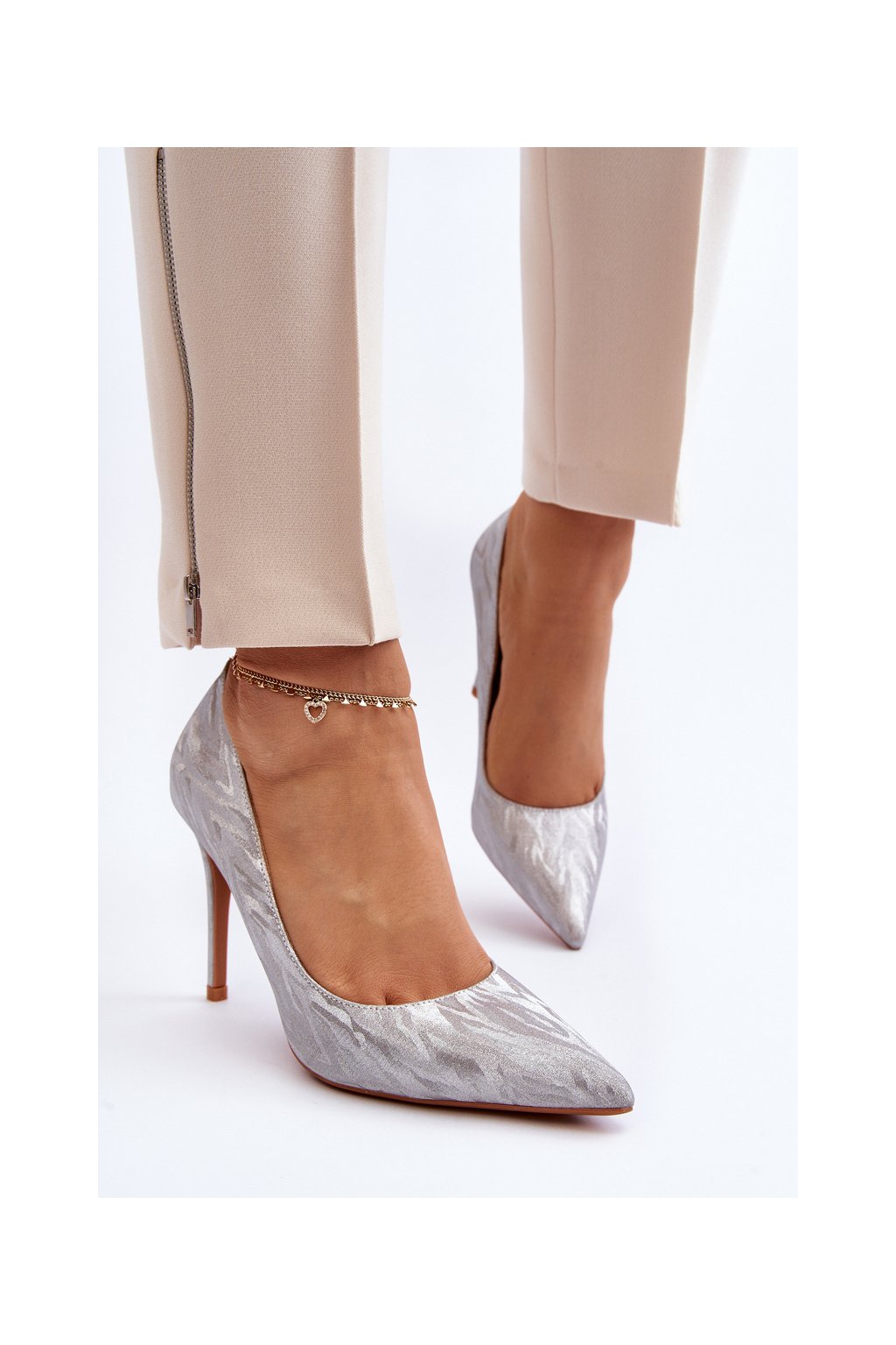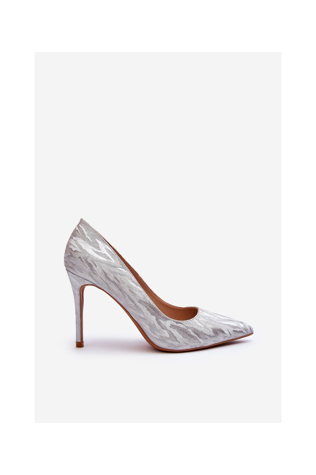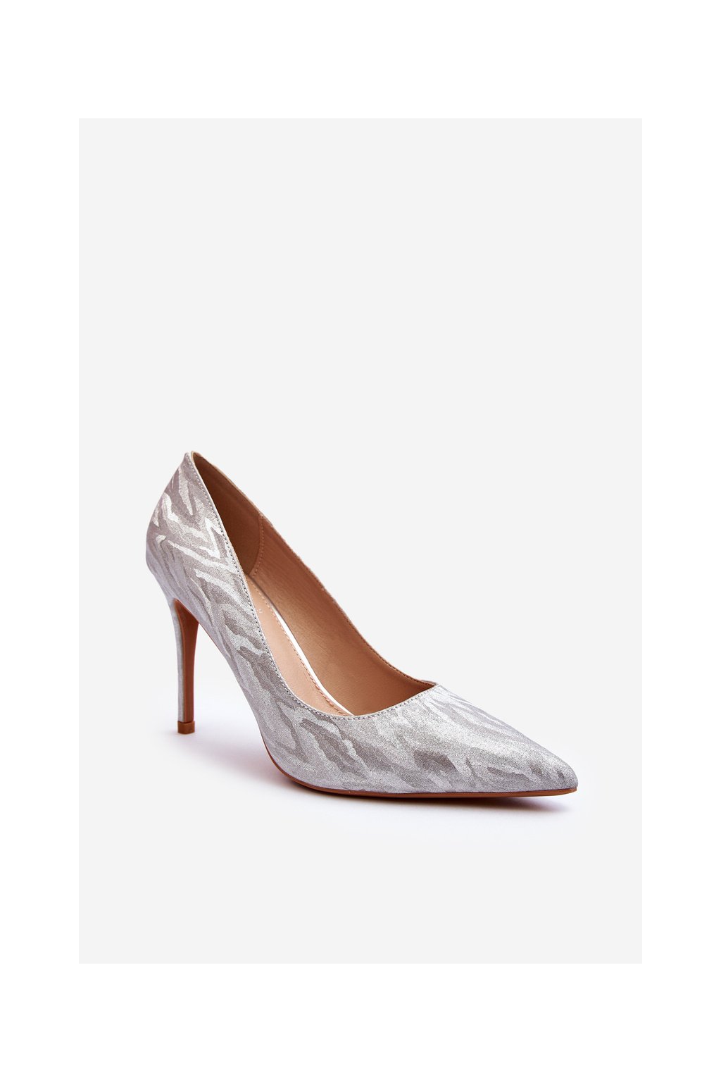 Dámske strieborné textilné lodičky na ihlovom podpätku TU246 SILVER