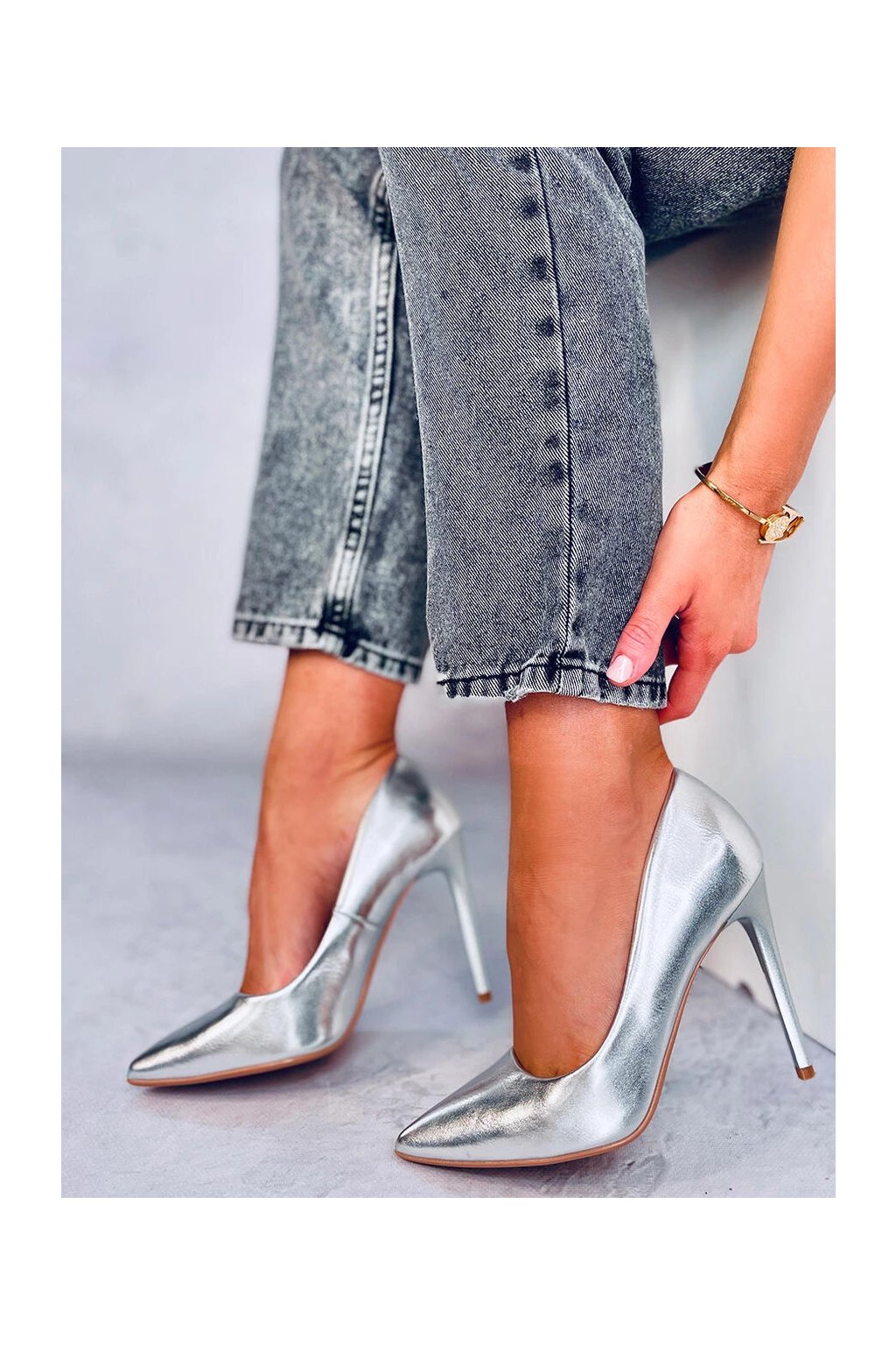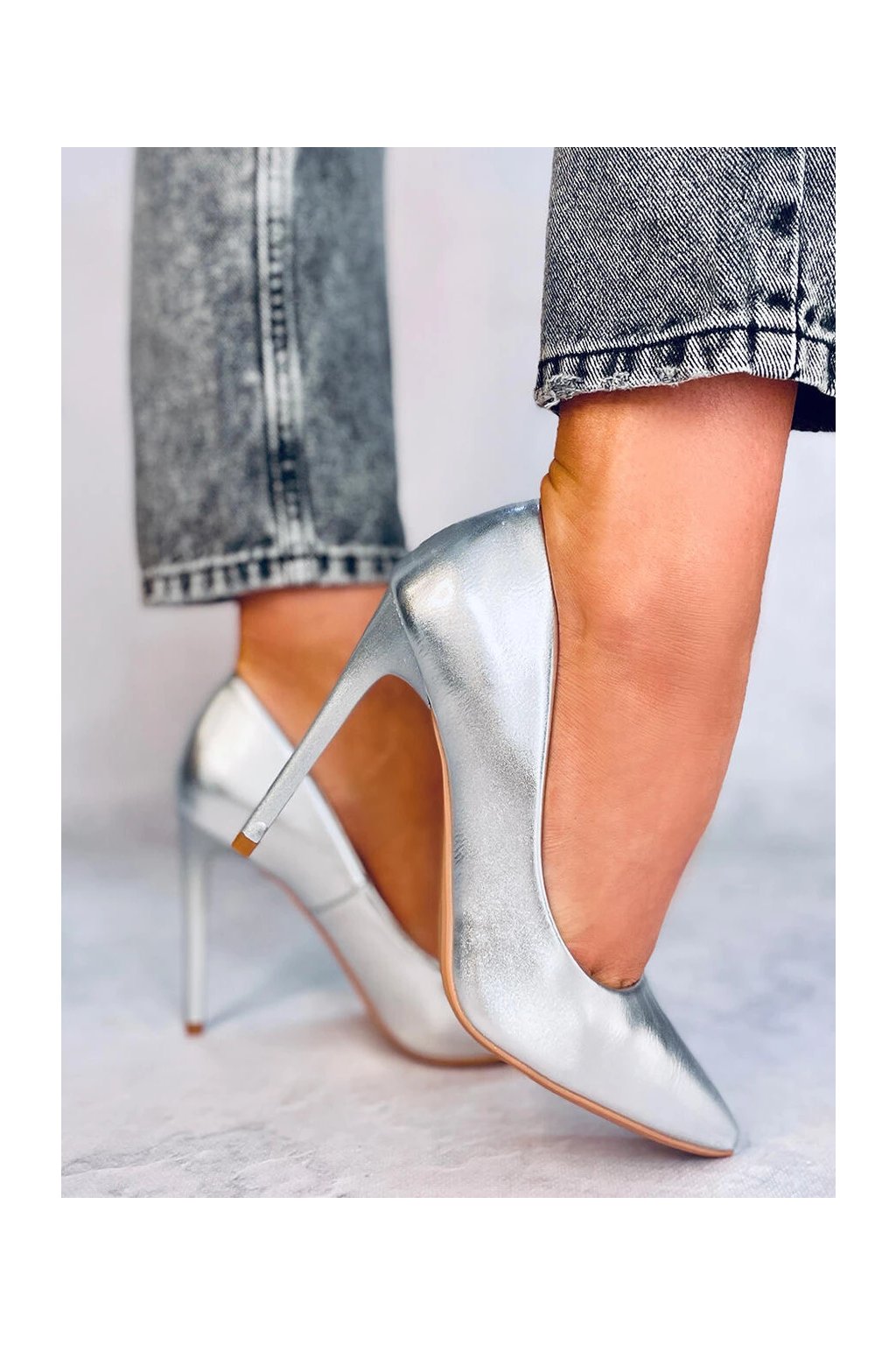 Dámske strieborné metalické lodičky s špicatou špičkou z eko kože, NF-51P