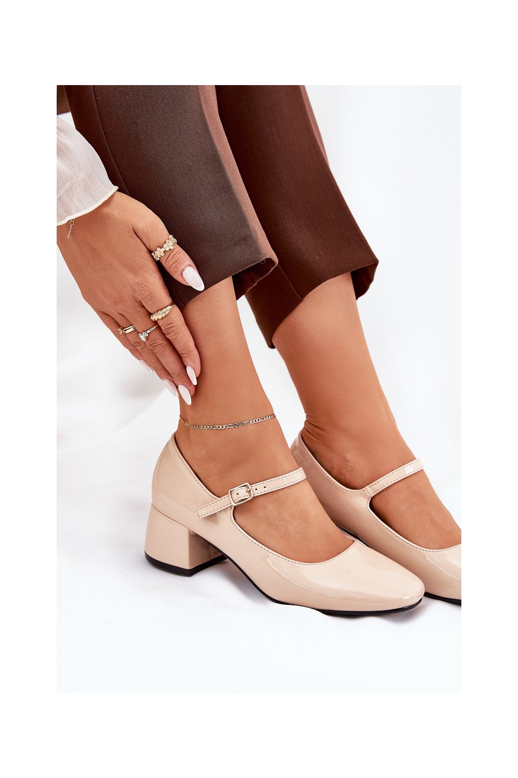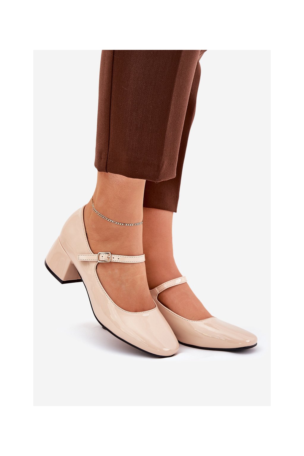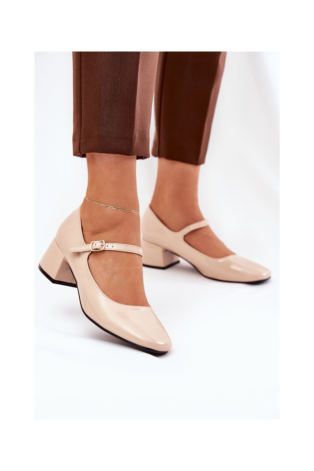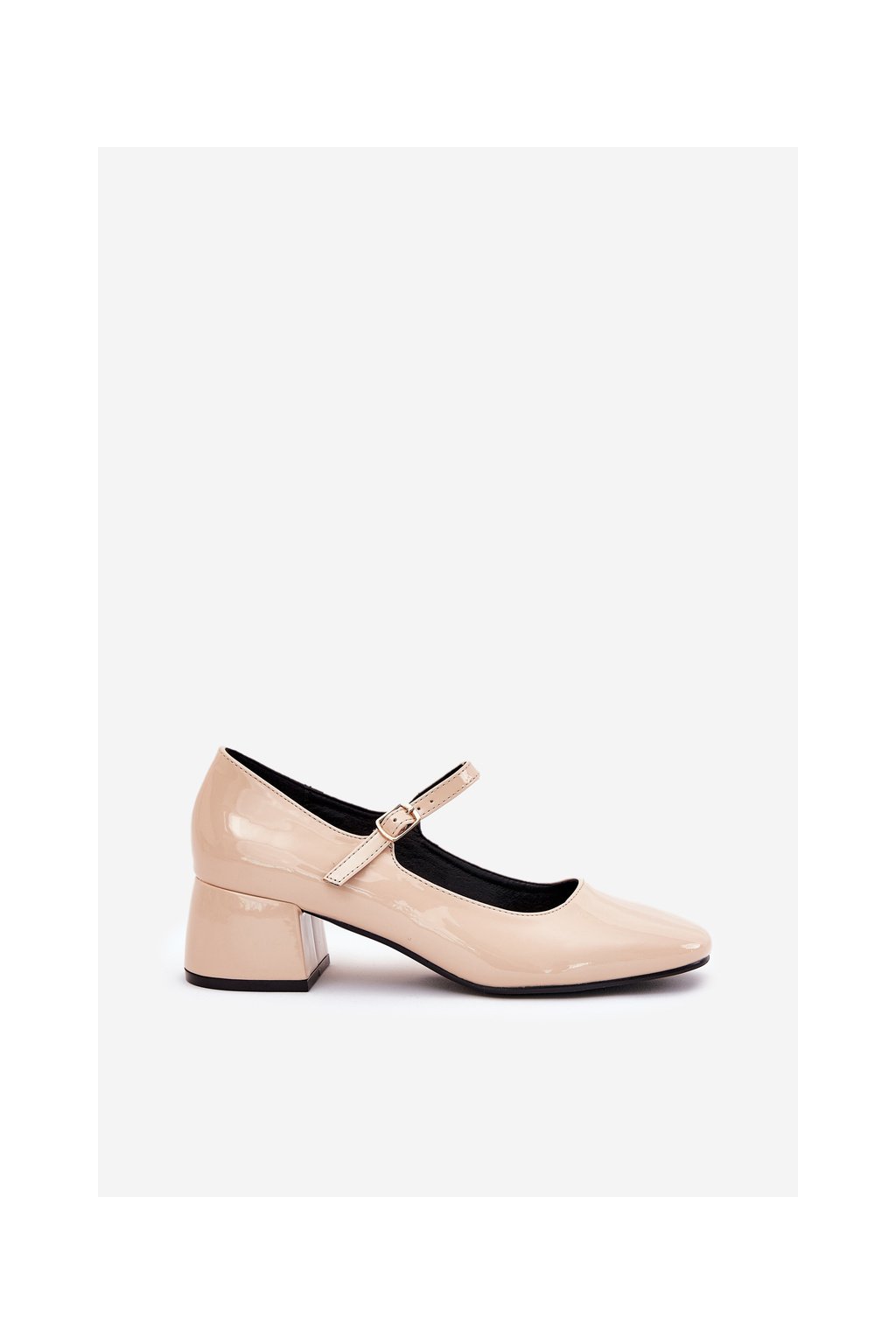 Béžové dámske lakované lodičky s remienkom a sponou na pracku, kód produktu 77-554 BEIGE
