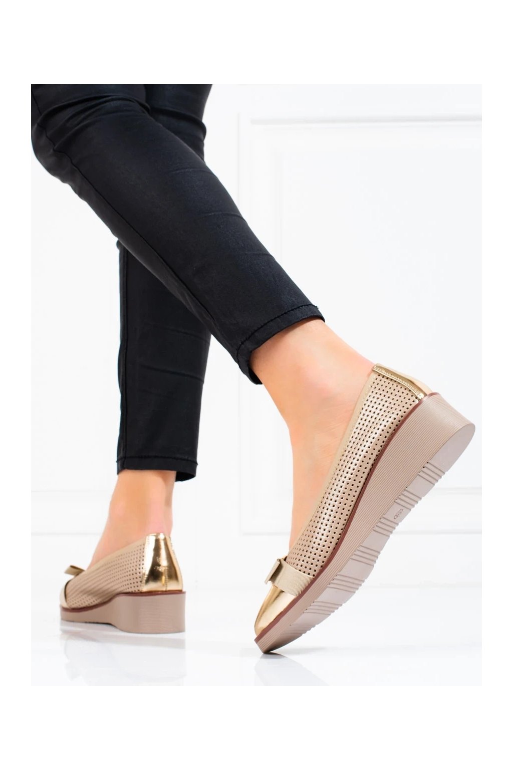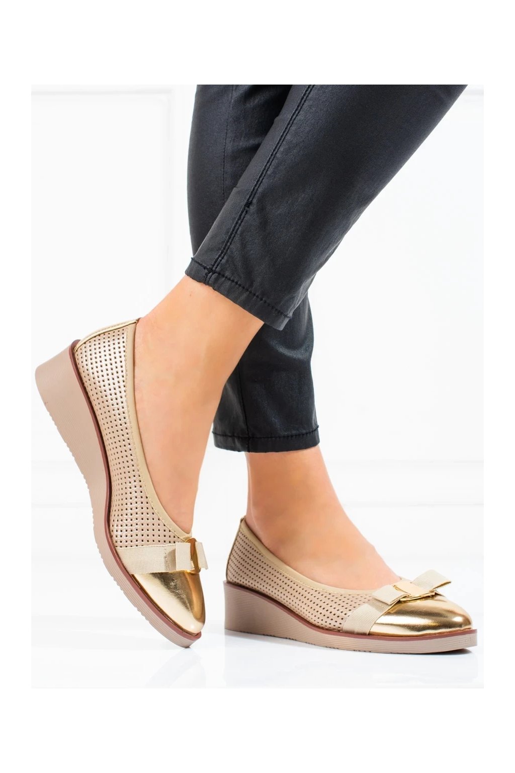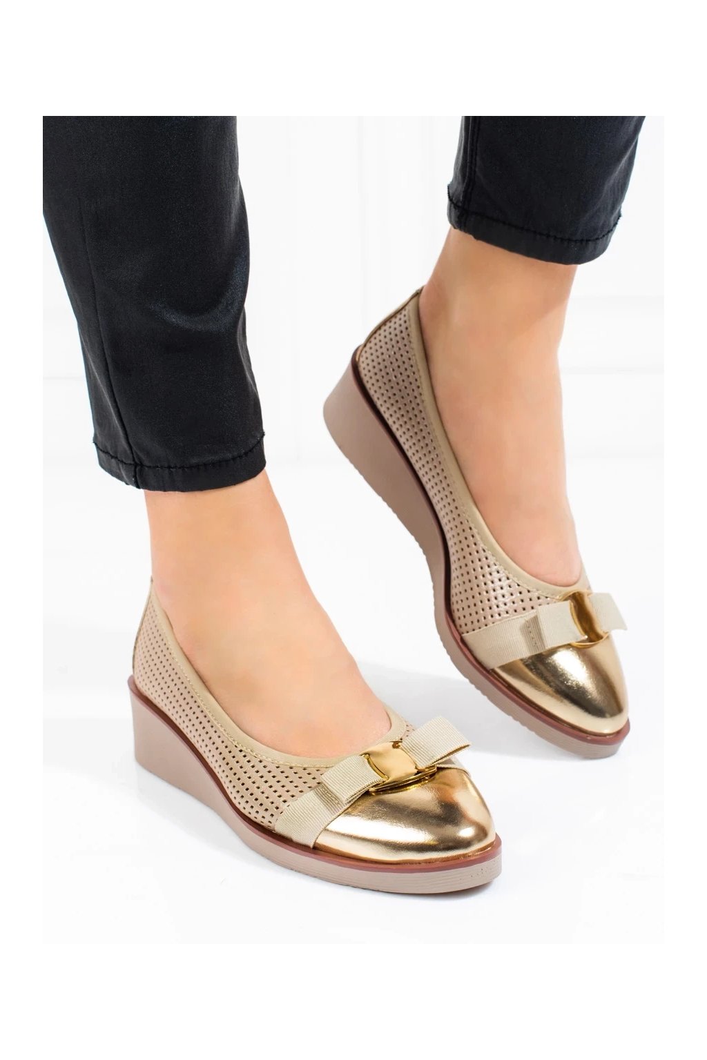 Zlaté dámske lodičky na platforme s prírodnou koženou vložkou, kód produktu 23-12037GO