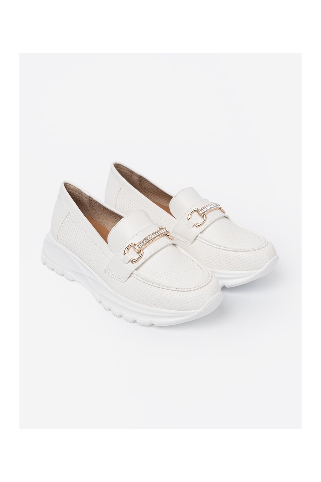 Bílé mokasíny s dekorativním zlatým prvkem – elegance a pohodlí v jednom