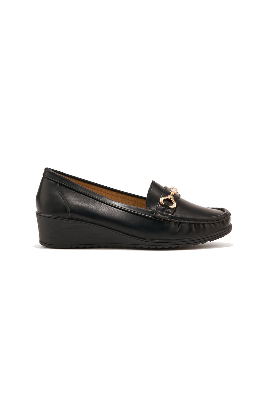 Naše černé mokasíny na koturně jsou vyrobeny z kvalitní ekologické kůže, která je nejen odolná a dlouhodobě trvanlivá, ale také vizuálně atraktivní. Zlaté zdobení na přední části boty přidává nádech luxusu a moderního stylu, který dokáže okouzlit na první pohled.