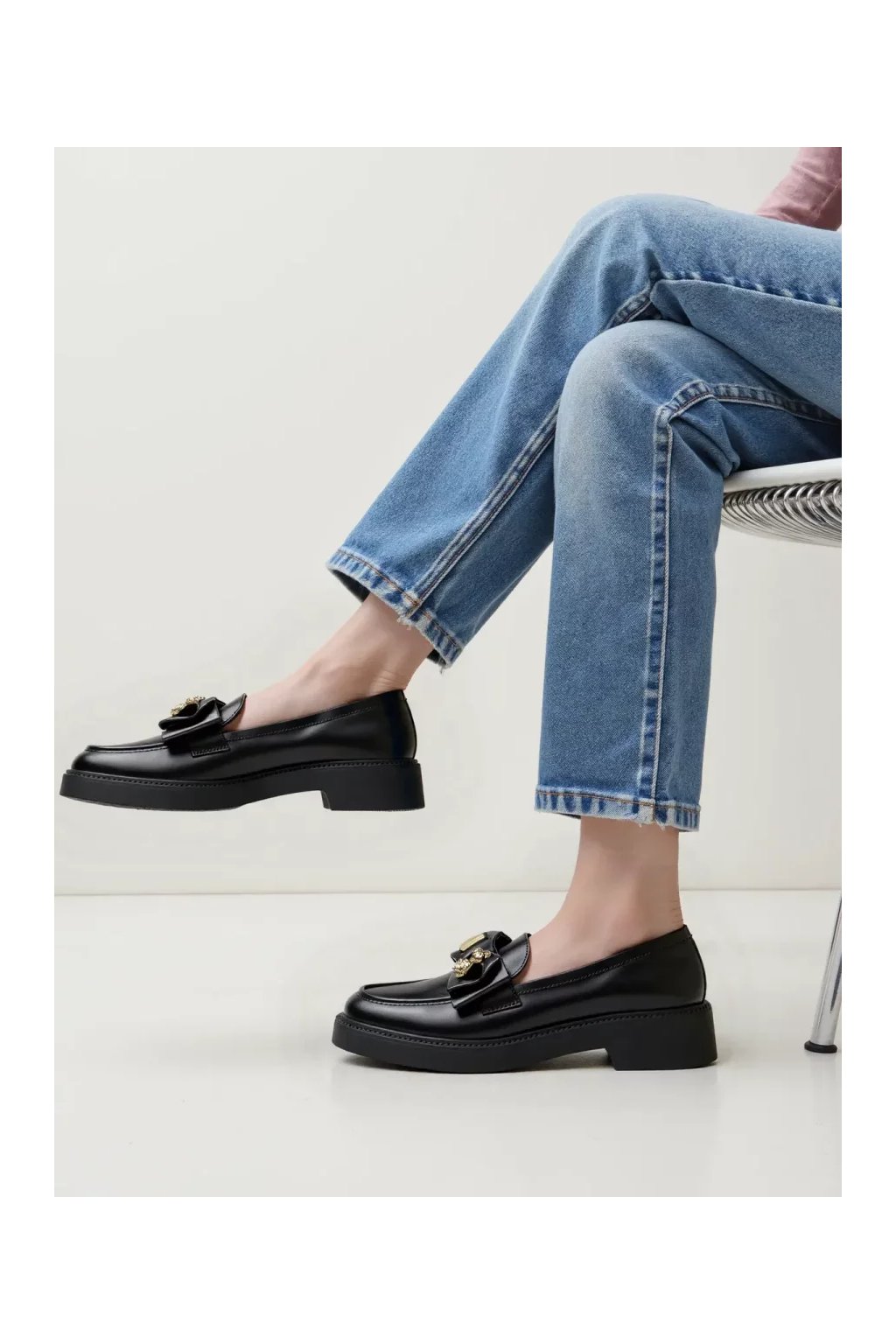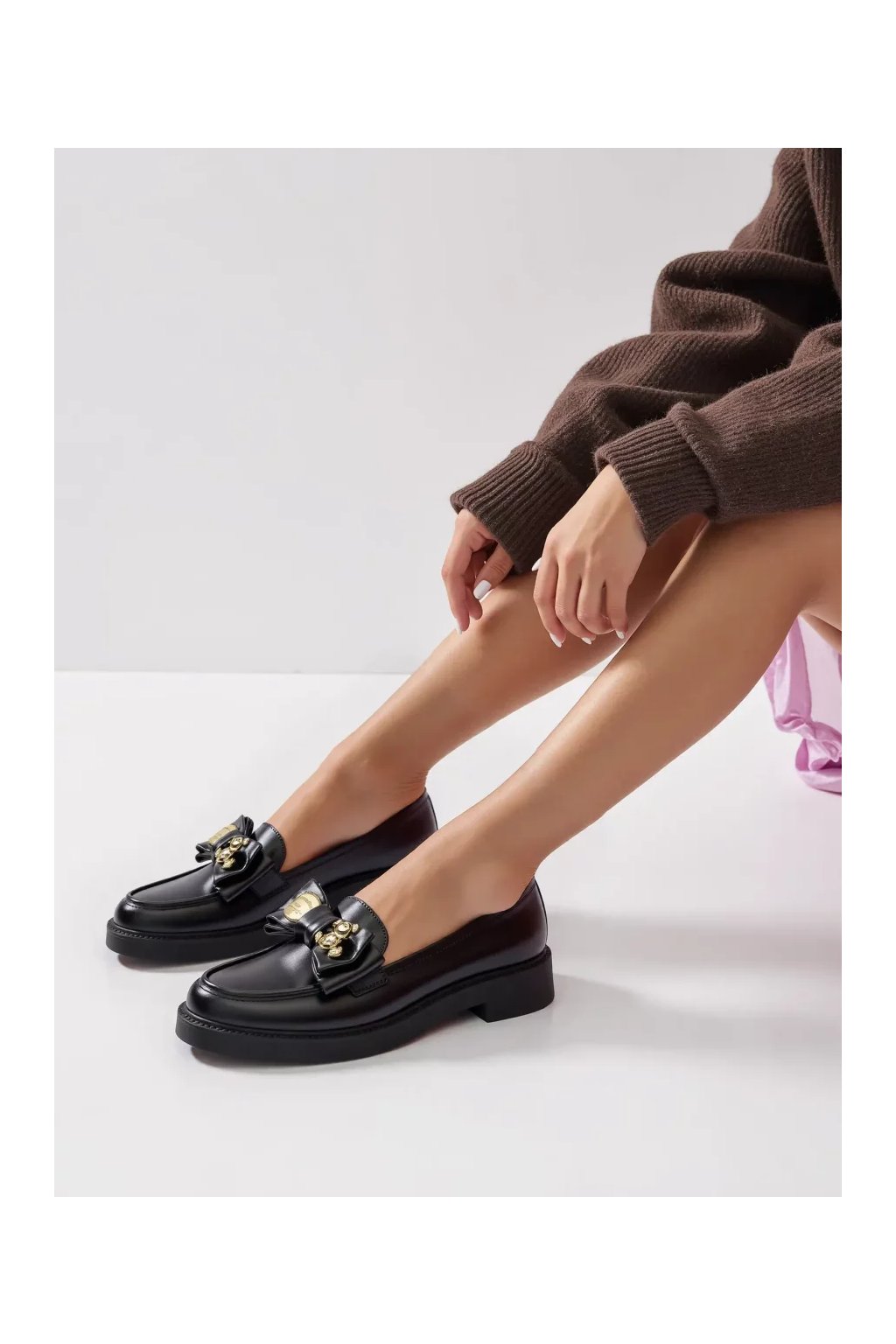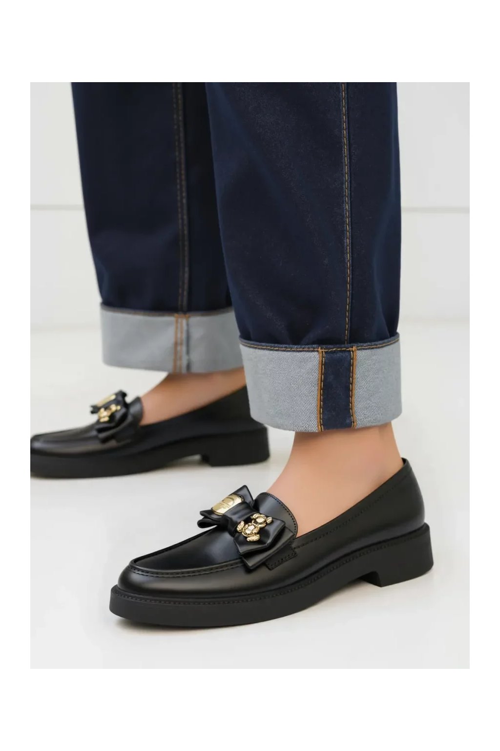 Dámske čierne mokasíny z eko kože, kokarda, kód G1770
