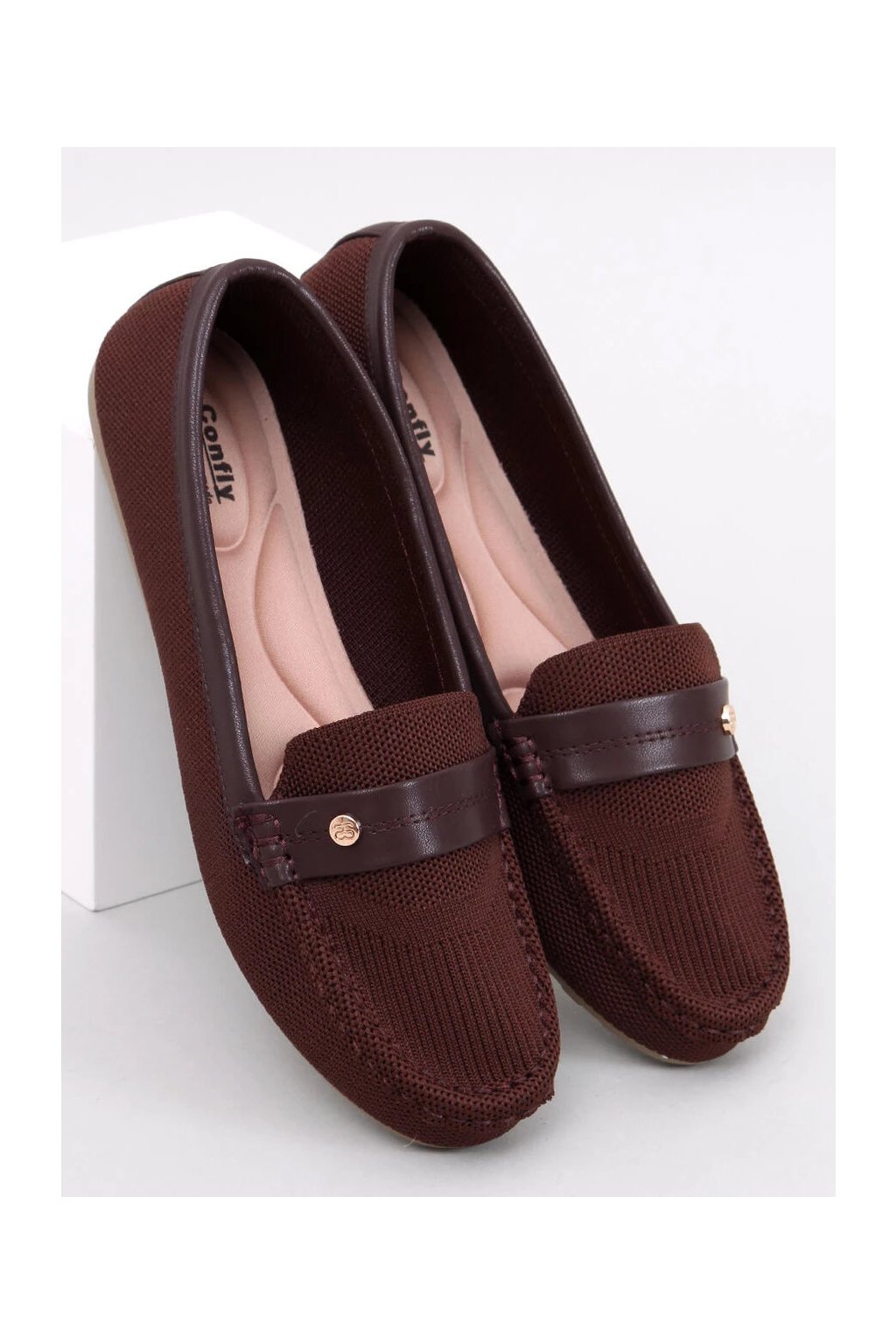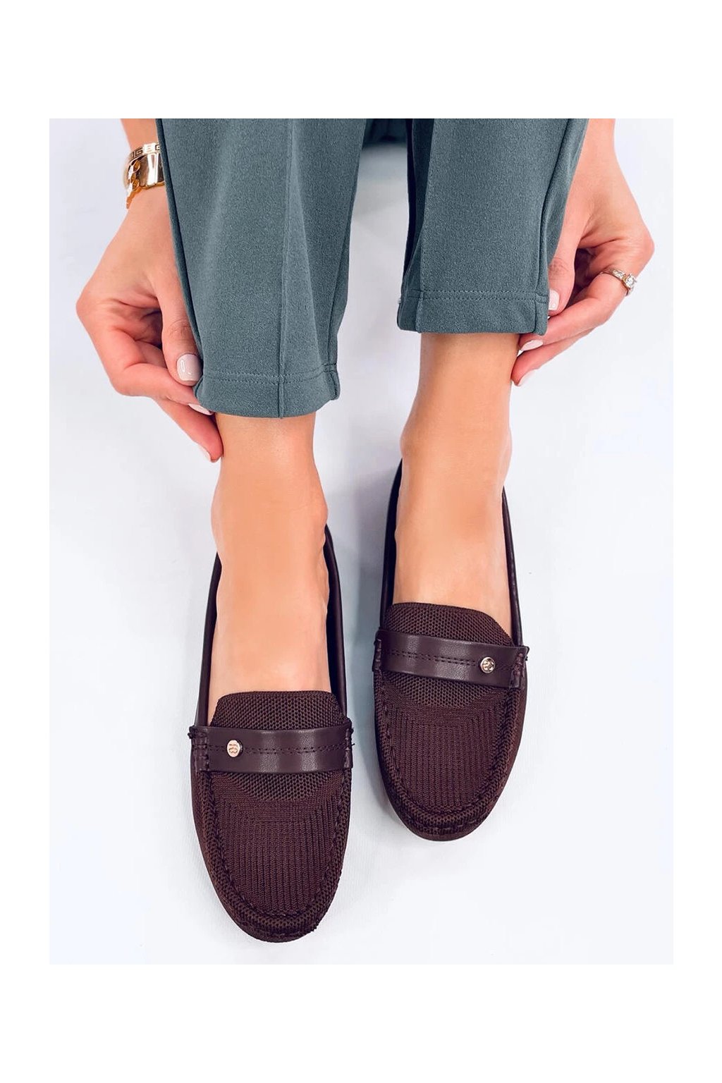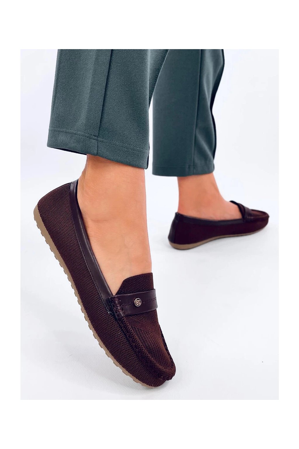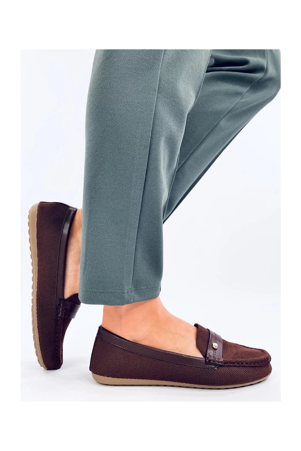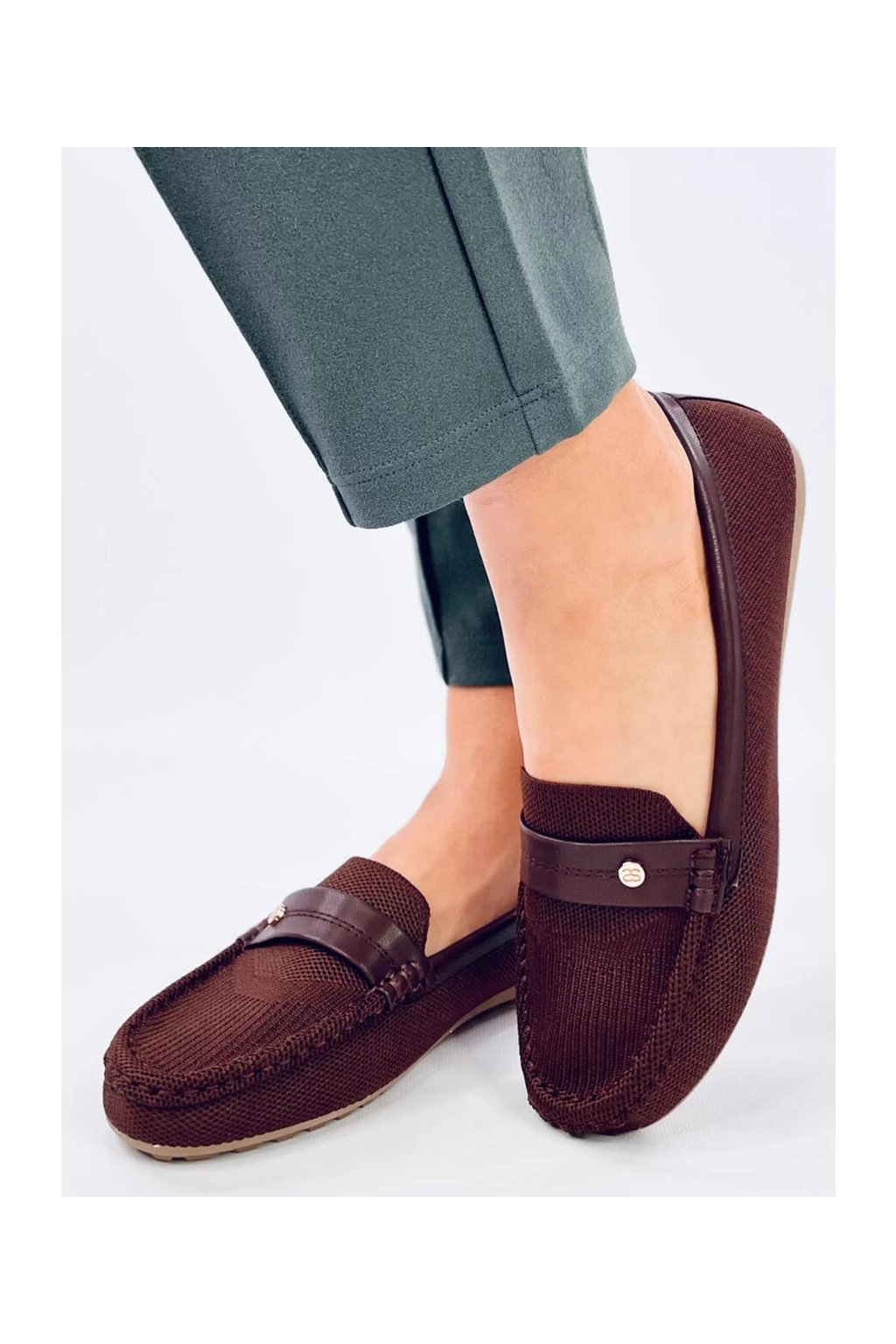 Dámske hnedé dierované mokasíny z textilu na bežný deň, okrúhla špička, kód DF882