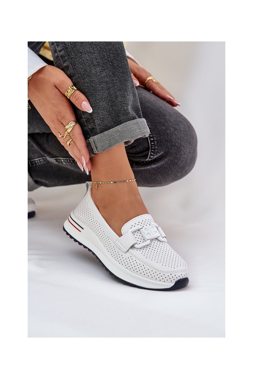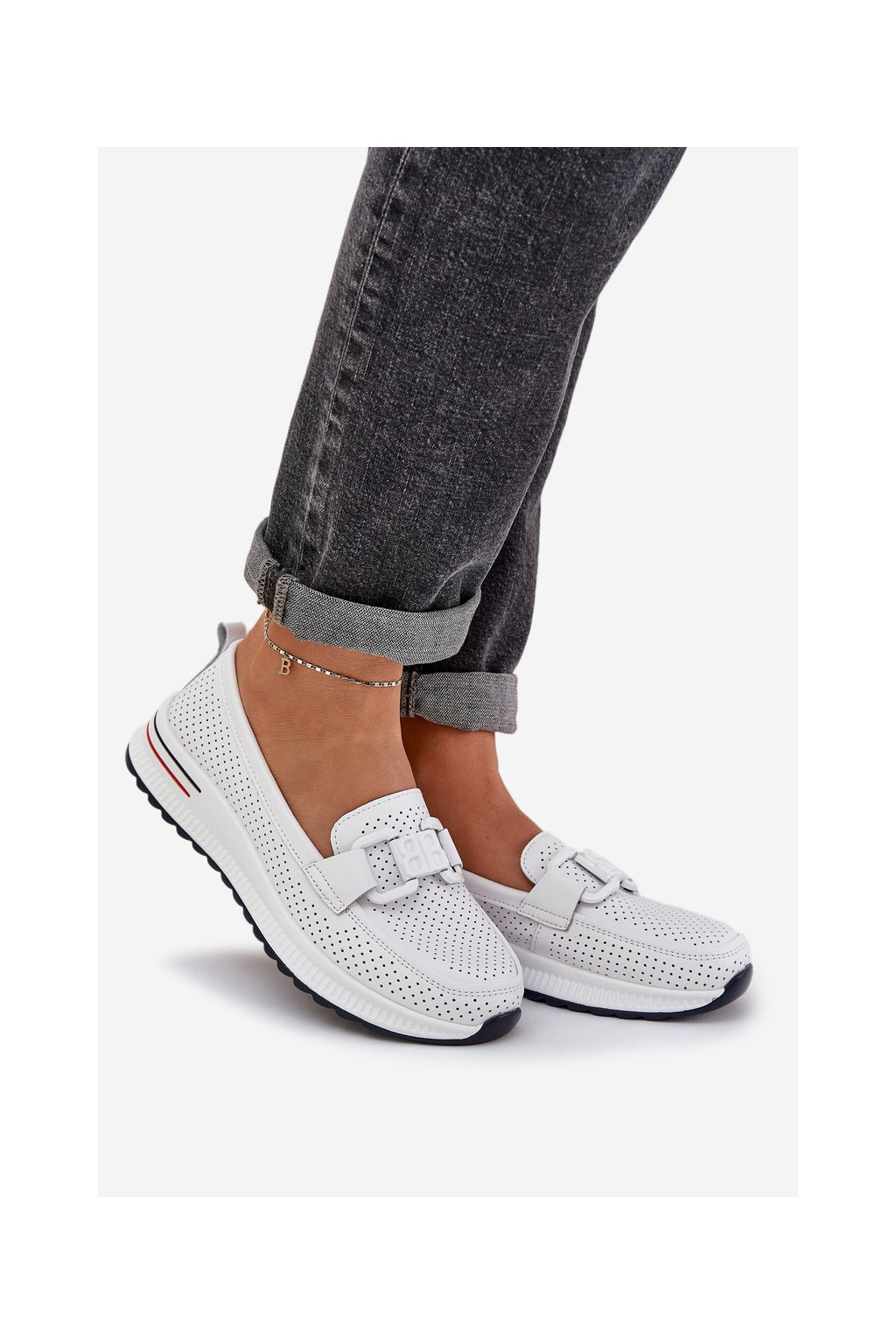 Biele dámske kožené mokasíny na rovnej podrážke s ozdobou, kód produktu LR51-556 WHITE