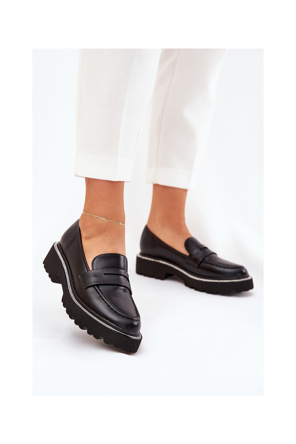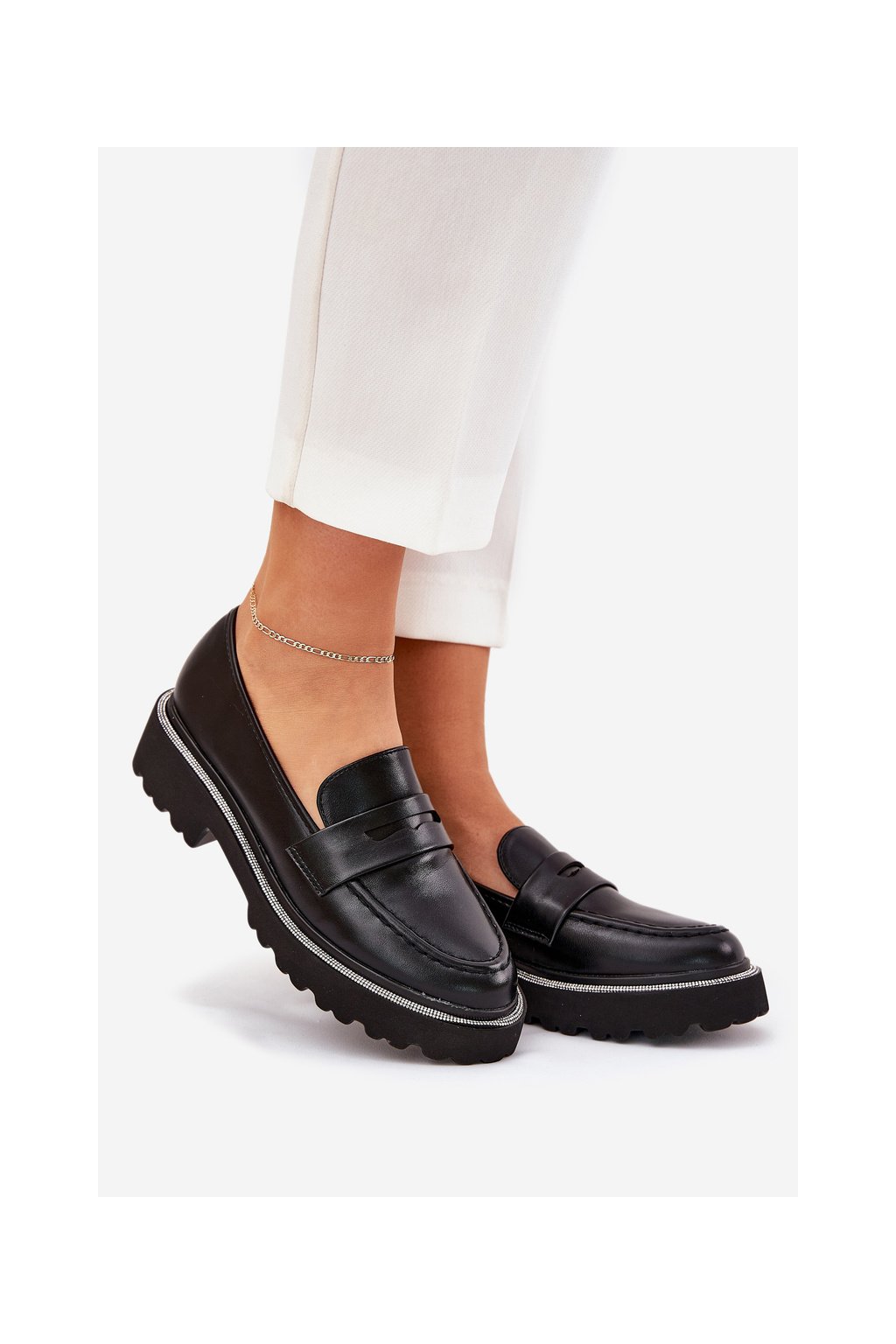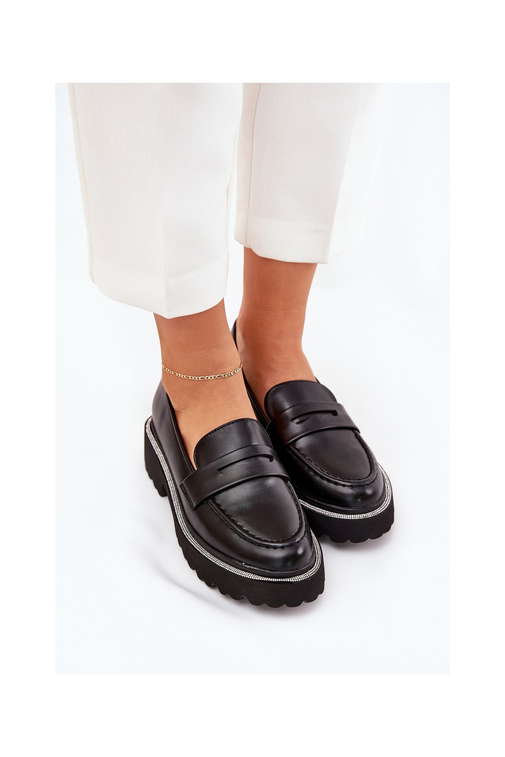 Čierne dámske mokasíny z eko kože s trblietkami na rovnkej podrážke, kód produktu 100-368 BLACK