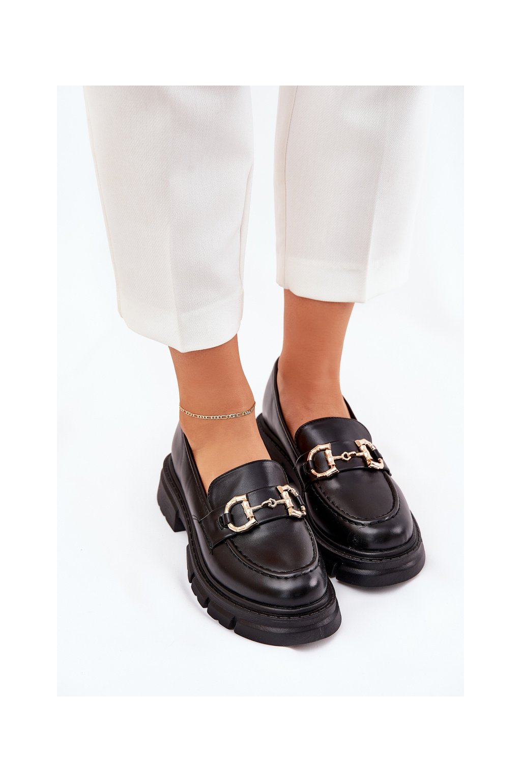 Čierne dámske mokasíny z eko kože s zlatým detailom na rovnej podrážke, kód produktu 1-708 BLACK