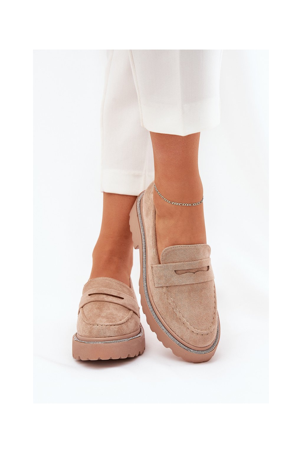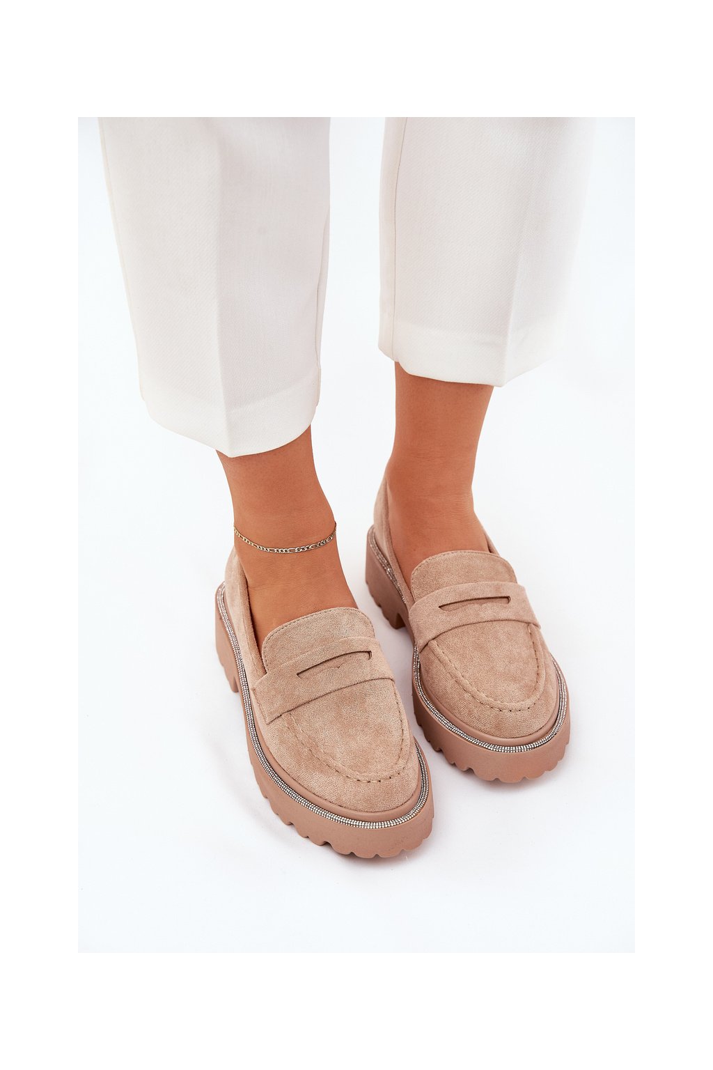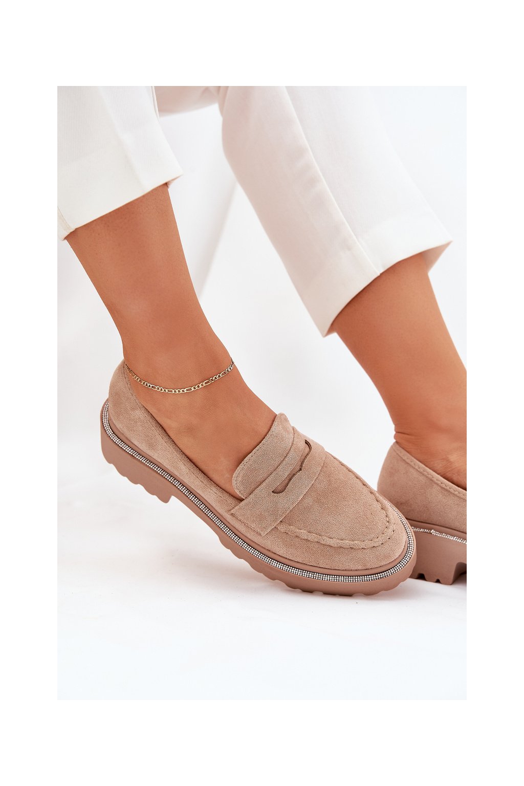 Khaki dámske mokasíny z eko semišu s ozdobnými zirkónmi, kód produktu 100-368 KHAKI