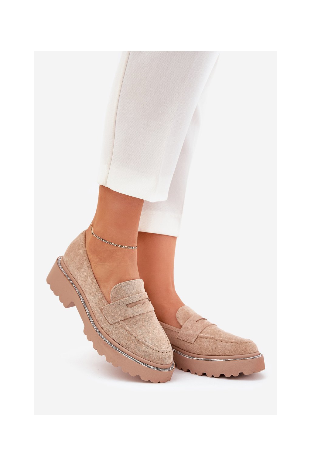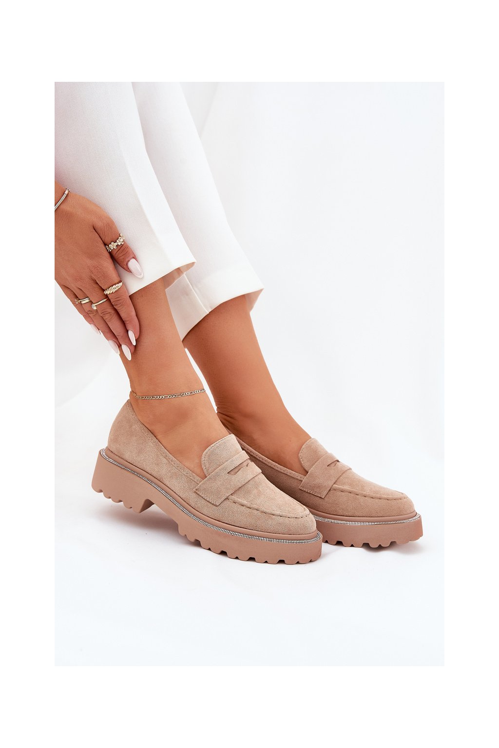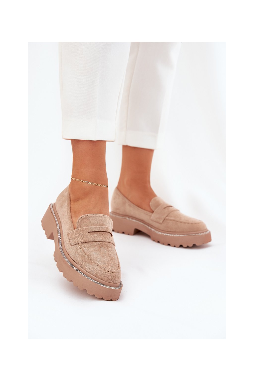 Khaki dámske mokasíny z eko semišu s ozdobnými zirkónmi, kód produktu 100-368 KHAKI