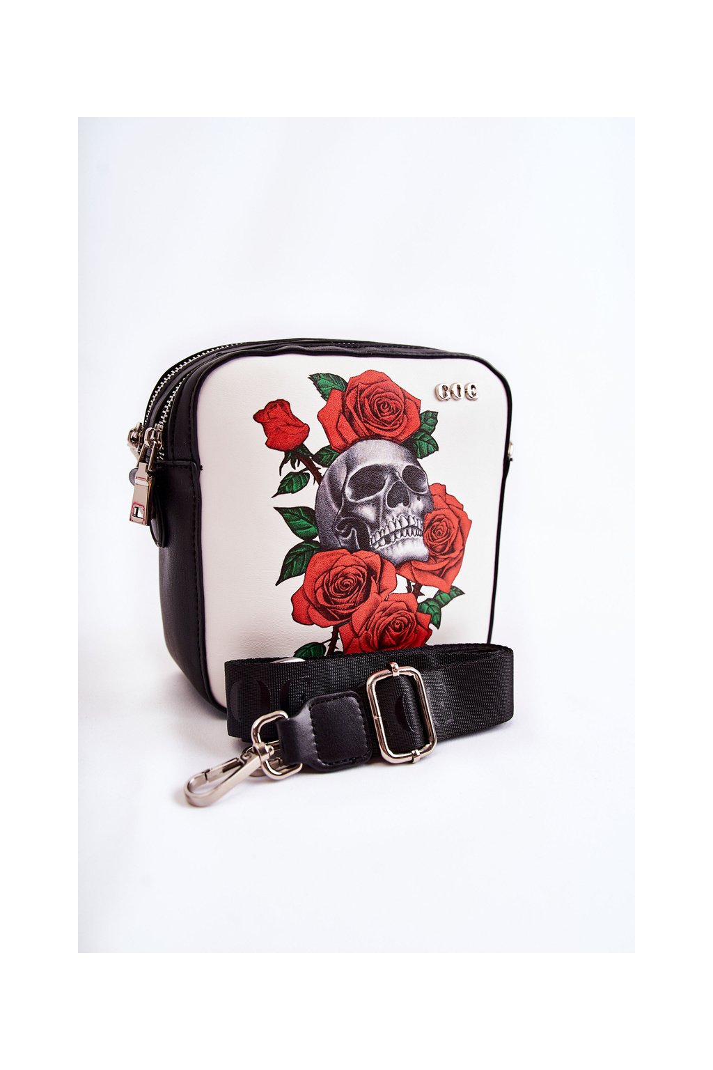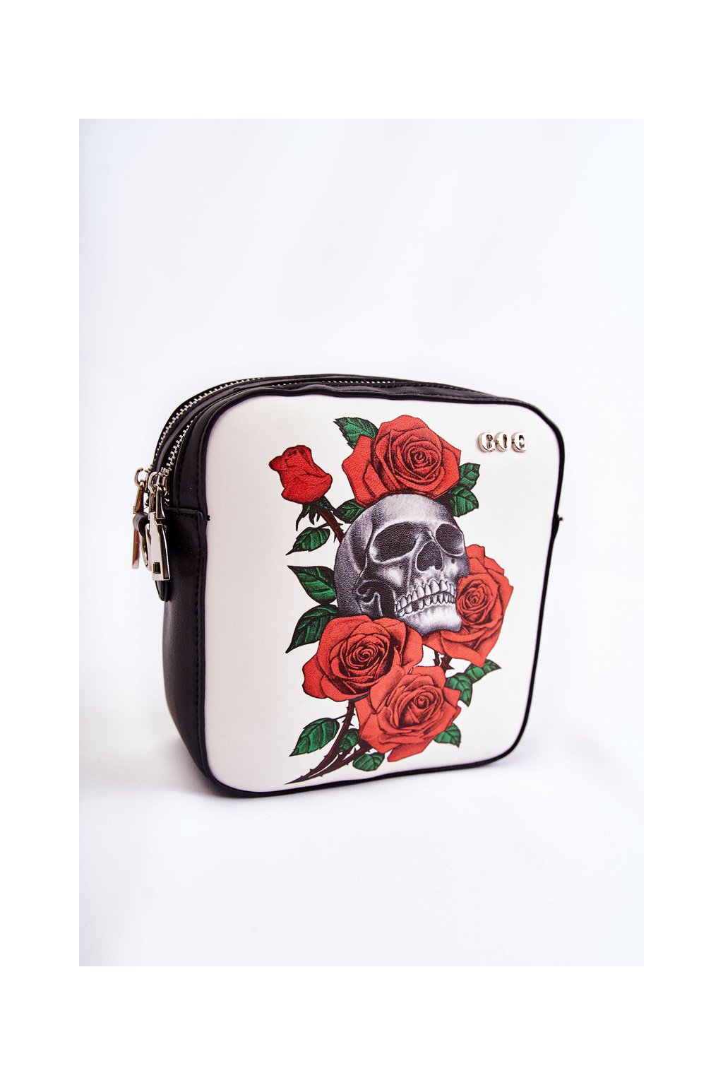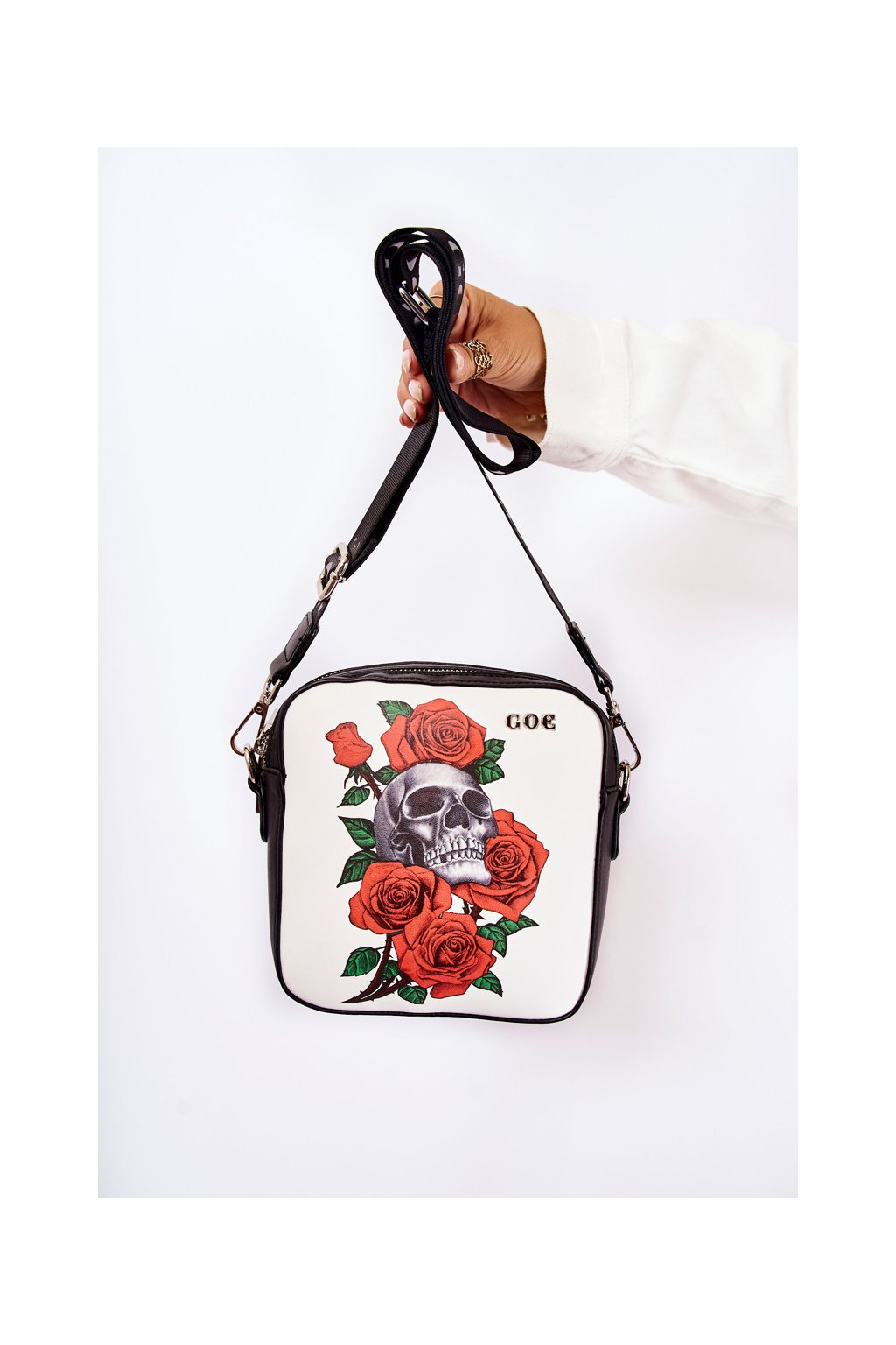 Bola vyrobená z kvalitnej ekokože. Na prednej strane sa nachádza logo GOE a ozdobný motív lebiek a kvetov. Kabelka má dve priehradky na zips. V jednom z nich sa nachádza otvorené vrecko, zatiaľ čo v druhom je vrecko na zips. Látková podšívka s ozdobným vzorom. Na zadnej strane tašky sa nachádza aj vrecko na zips. Táto taška má jeden nastaviteľný odnímateľný popruh. Rozmery: