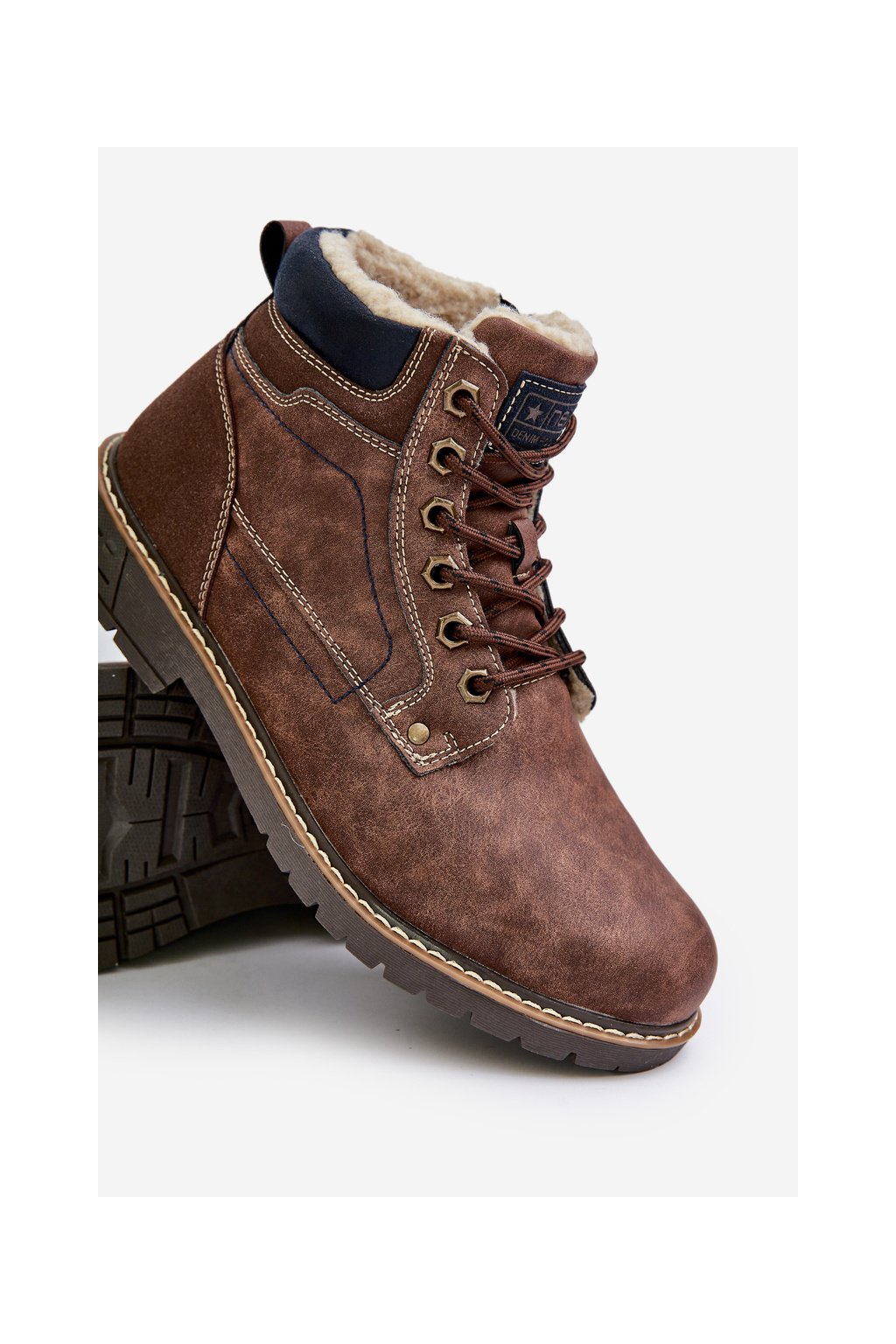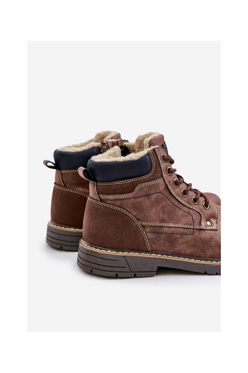 Pánske hnedé zimné kotníkové topánky z eko kože s rovnou podrážkou, zateplené kožušinkou, kód produktu 24MN20-7938 DK.BROWN