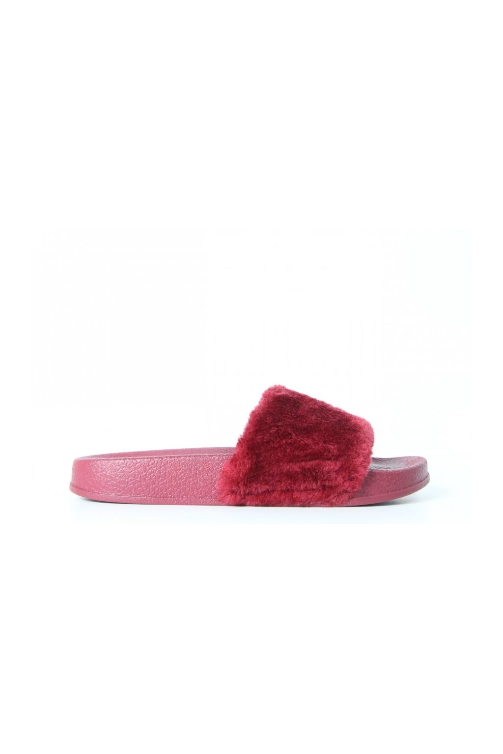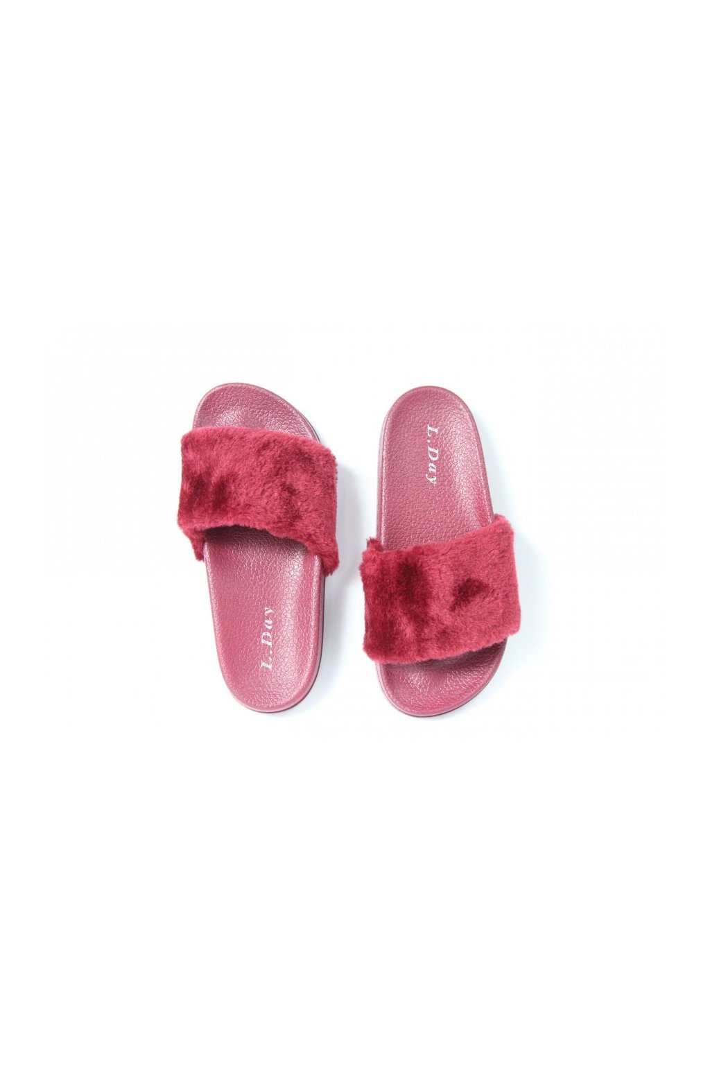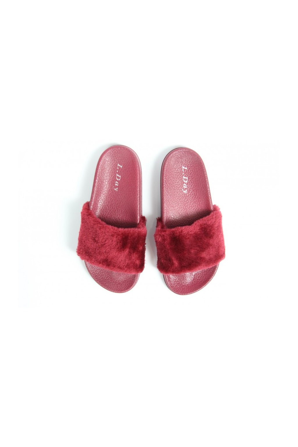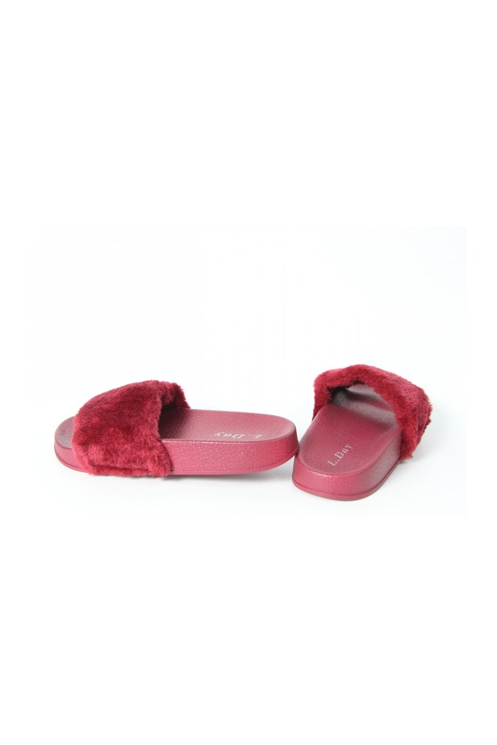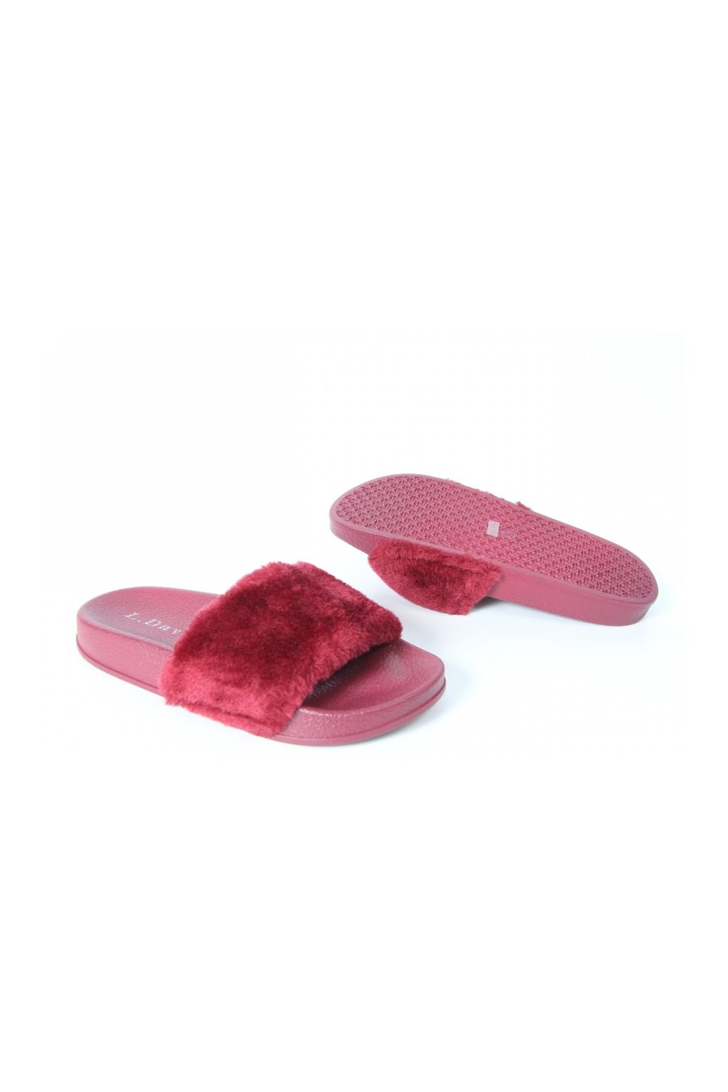 Červené dámske papuče s kožušinou na plochej podrážke, kód produktu LS-1R