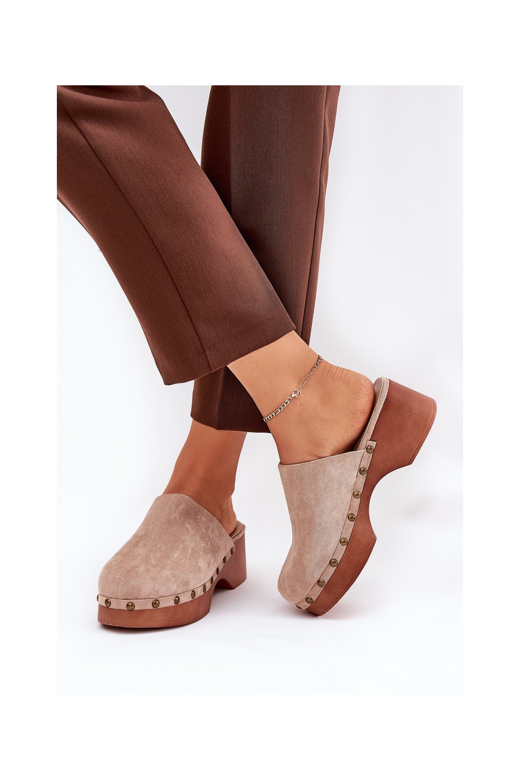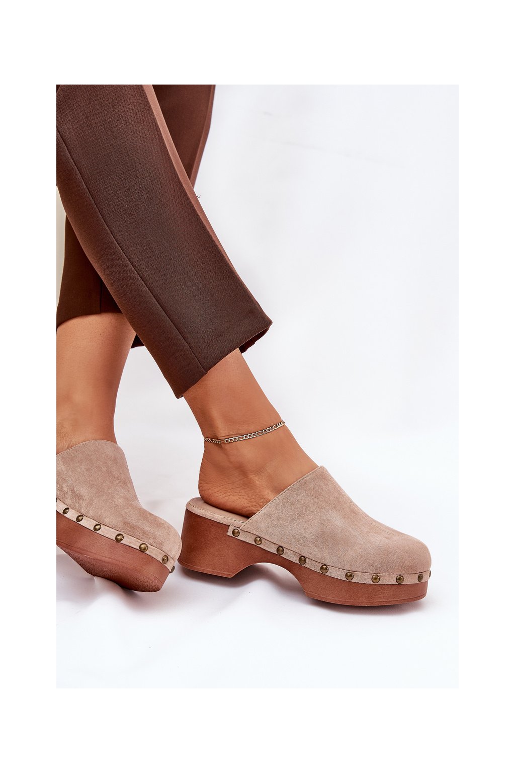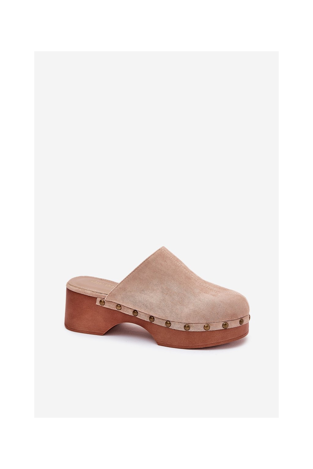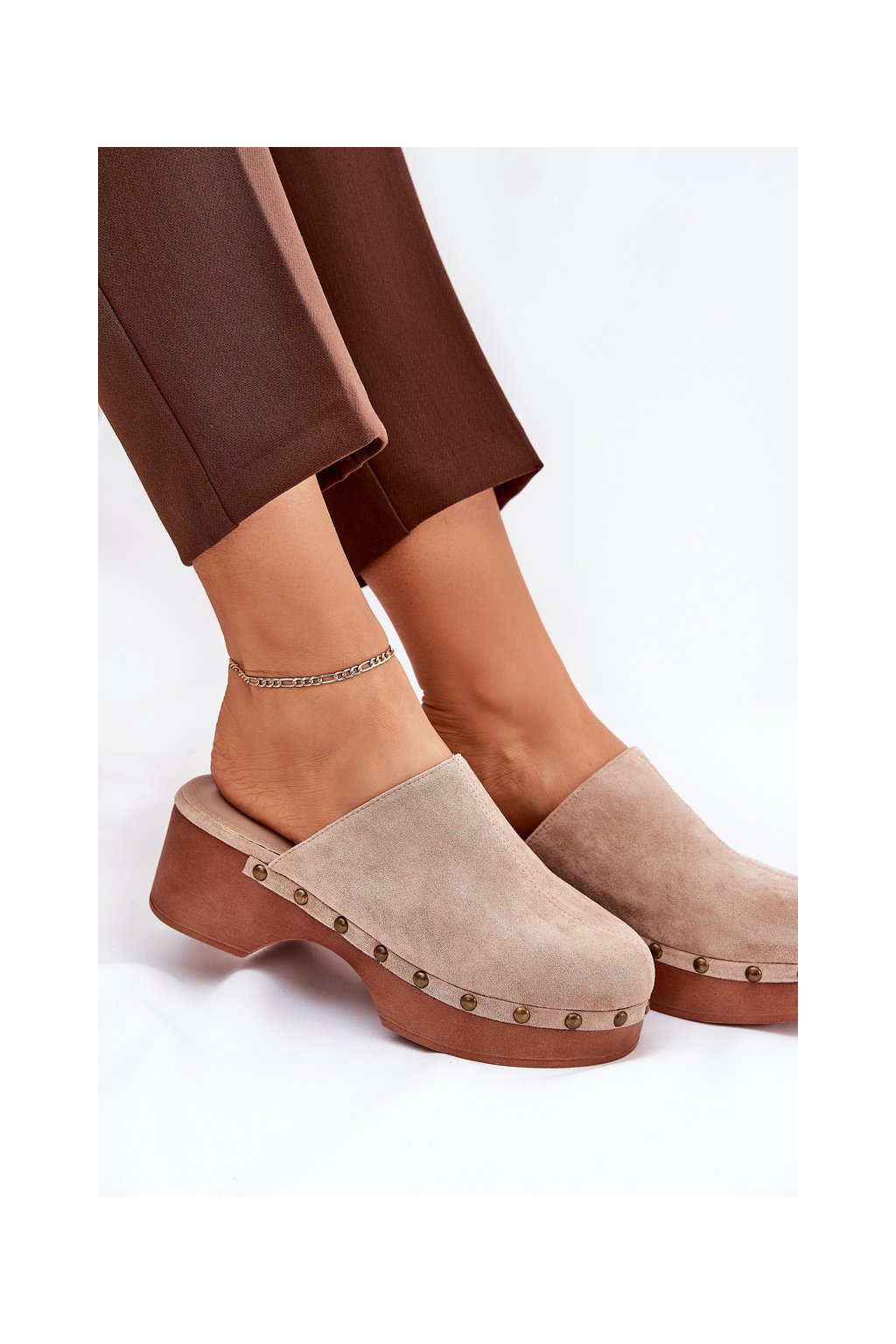 Dámske béžové šľapky z eko semišu s cvočkami, 6 cm, kód produktu 8065 BEIGE