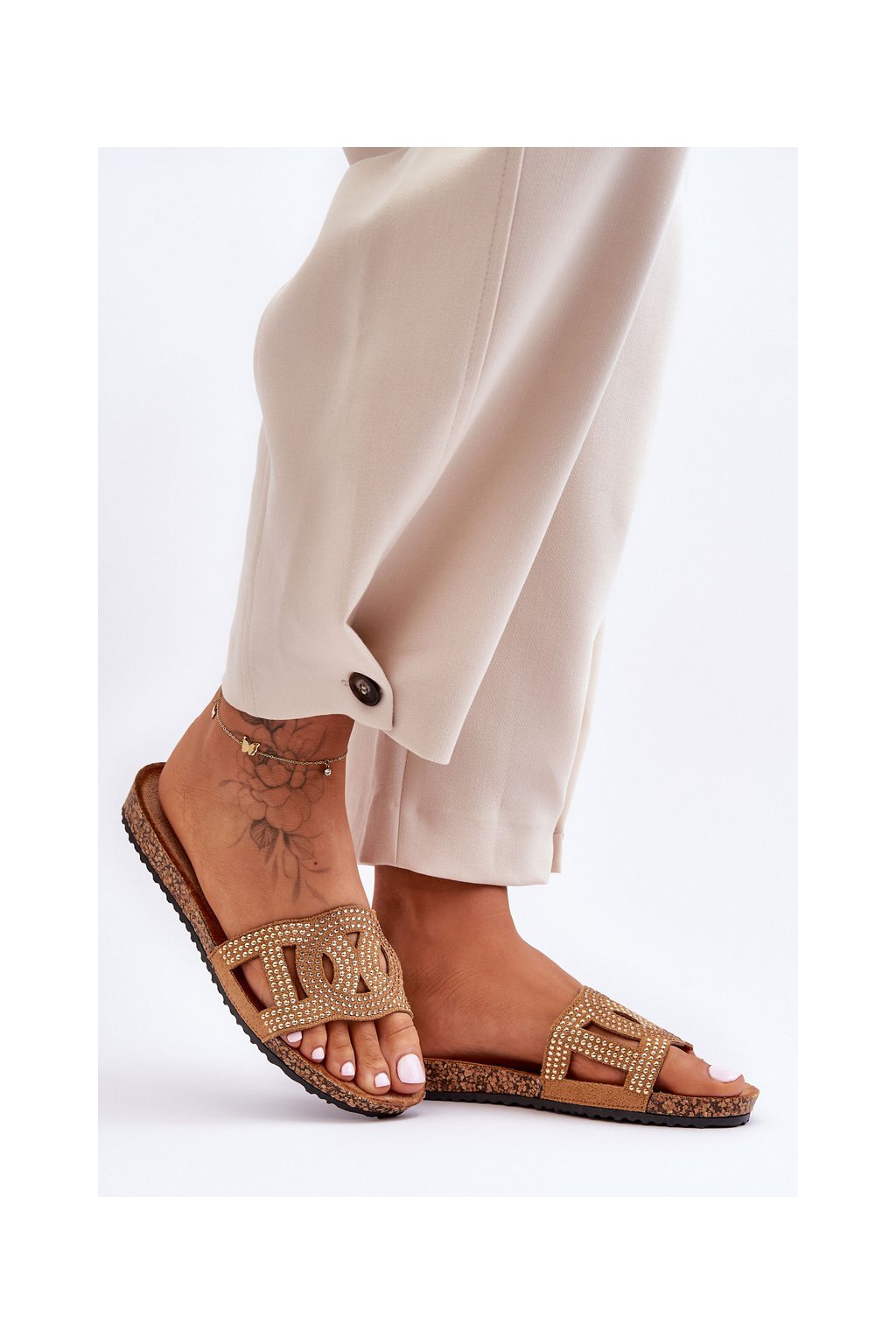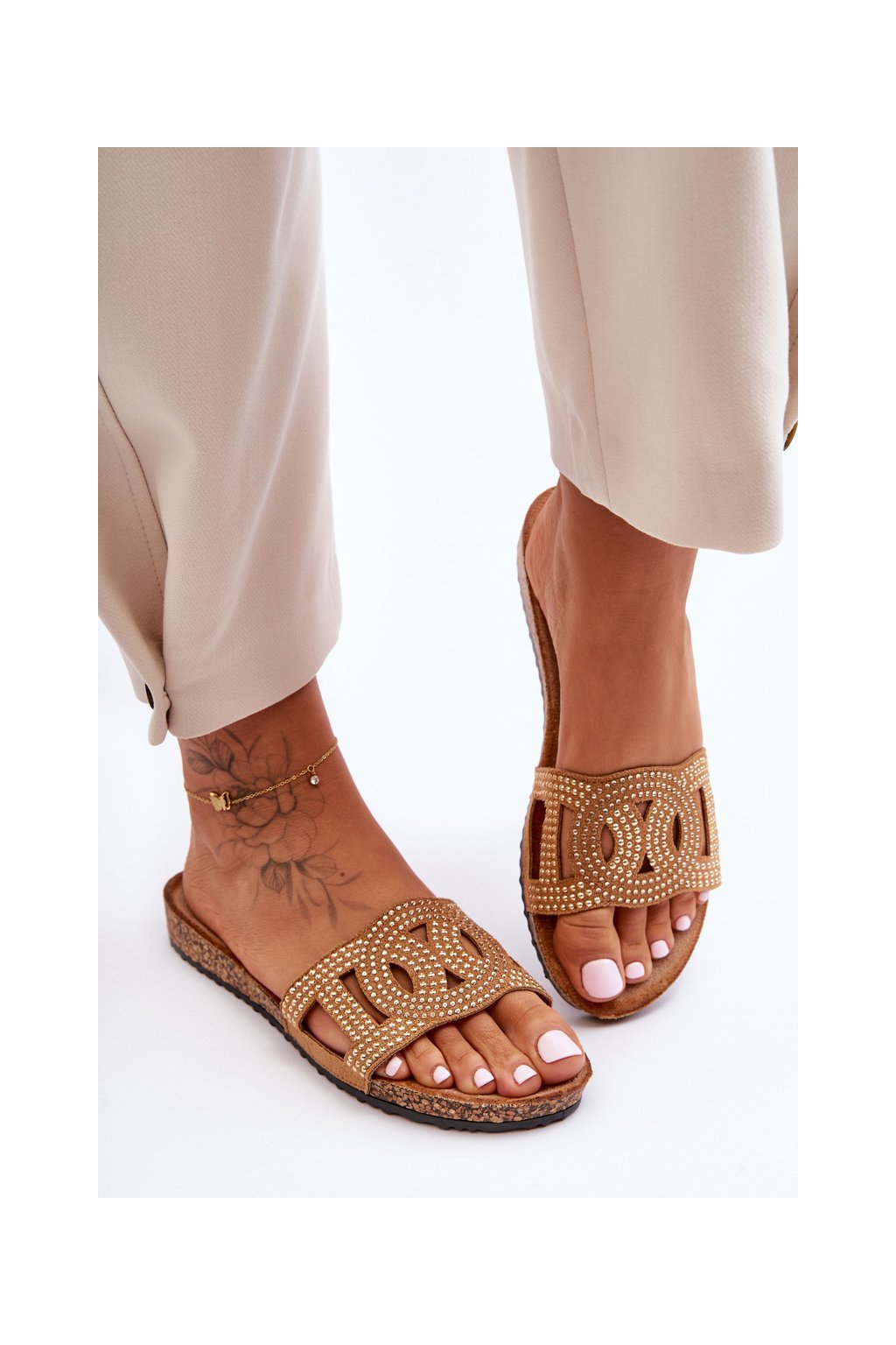 Hnedé dámske šľapky z eko semišu s rovnou podrážkou, kód produktu SD8181 CAMEL