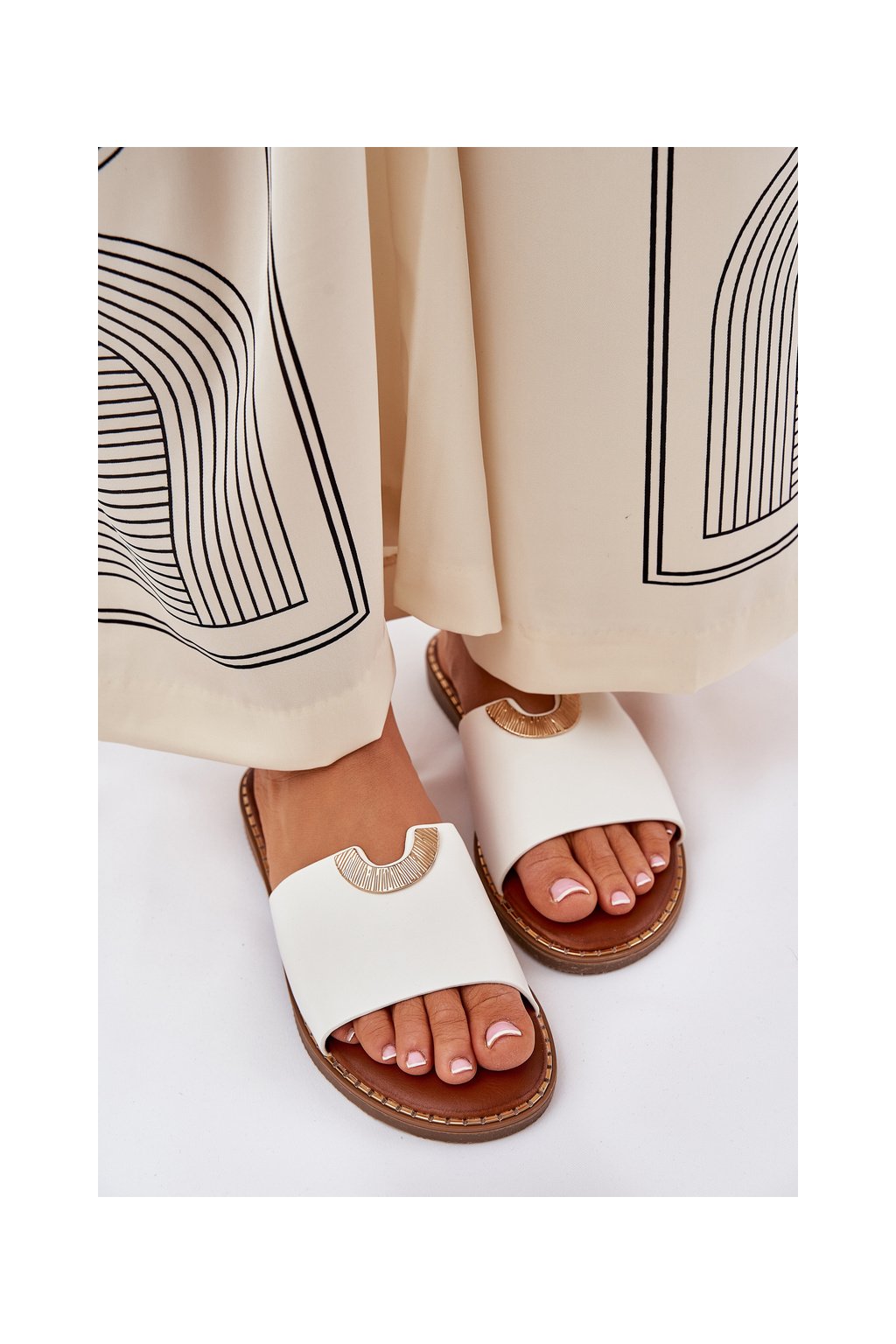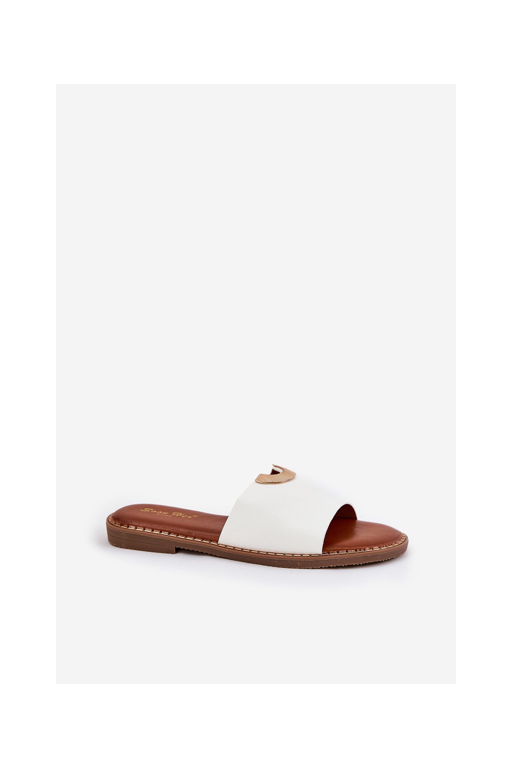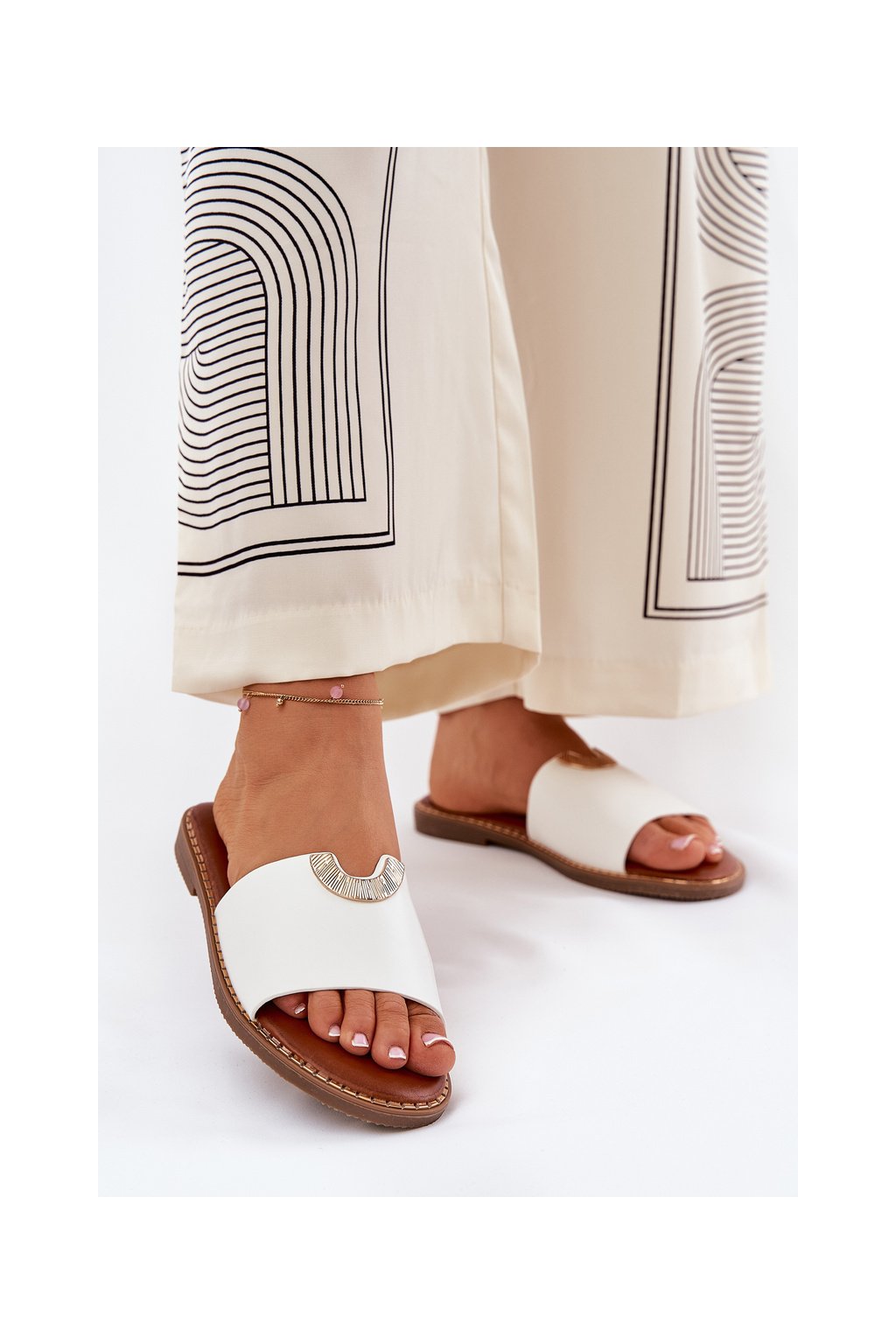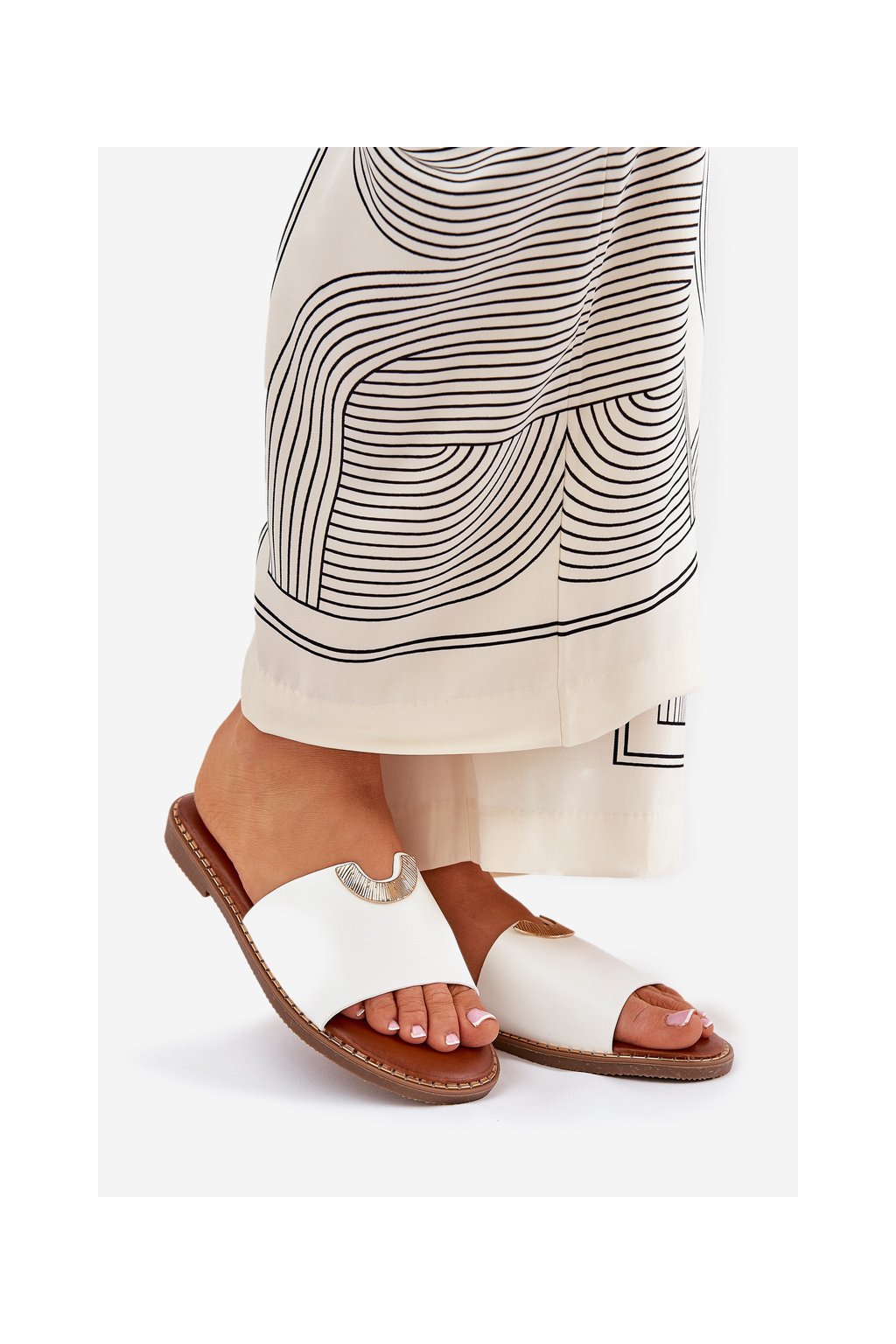 Biele dámske papuče z eko kože s ozdobnými detailmi na rovnej podrážke, kód produktu HXD-25 WHITE
