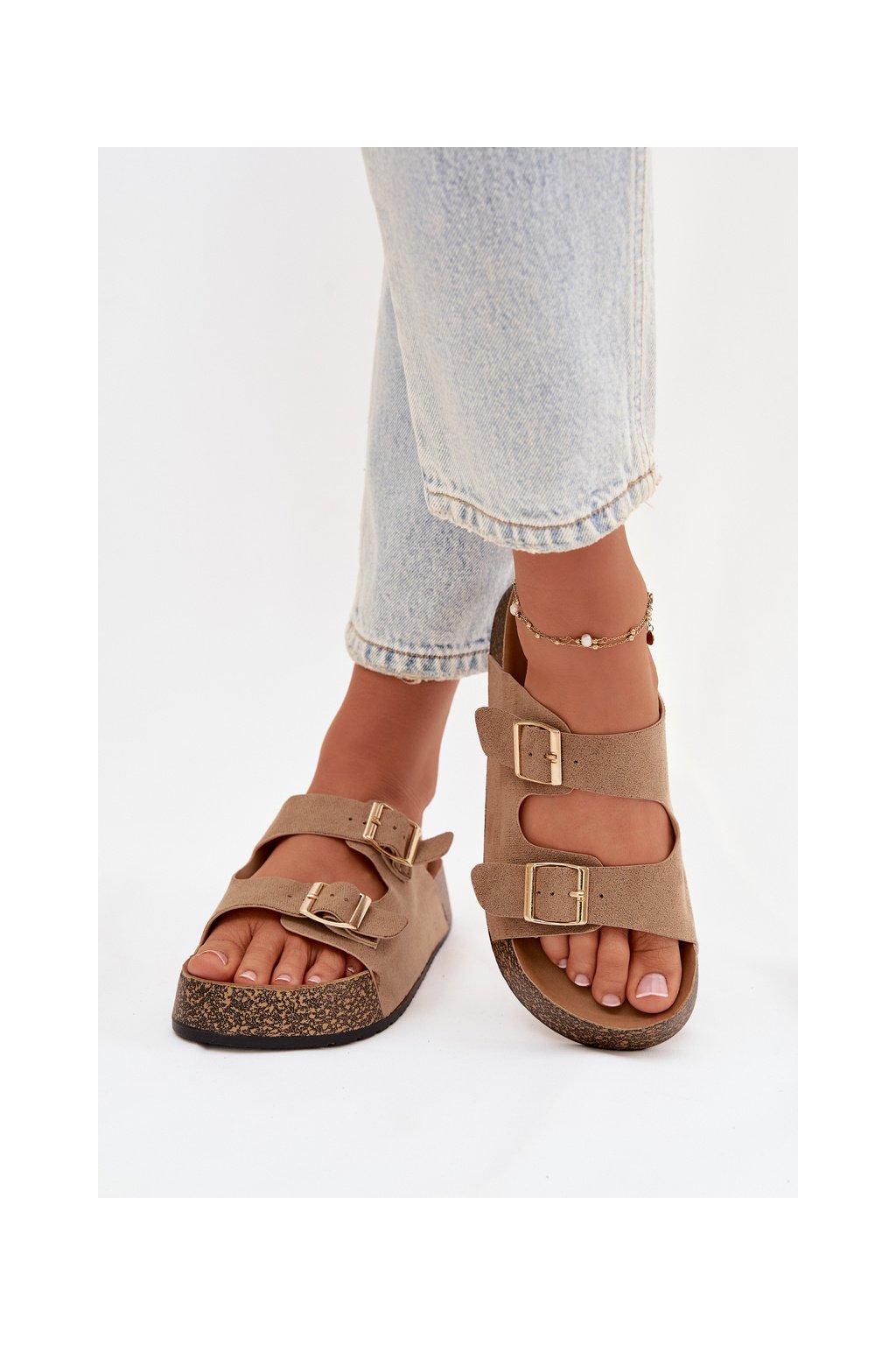 Dámské pantofle na korkové platformě jsou módní a pohodlnou volbou na teplé dny. Vyrobené z eko semiše, vypadají stylově a příjemně se přizpůsobují noze. Dva pásky se zlatými přezkami dodávají celku elegantní charakter a zdůrazňují aktuální trendy. Model se skvěle hodí do letních stylizací, spojující pohodlí s módním vzhledem. Při výběru velikosti se řiďte tabulkou velikostí.